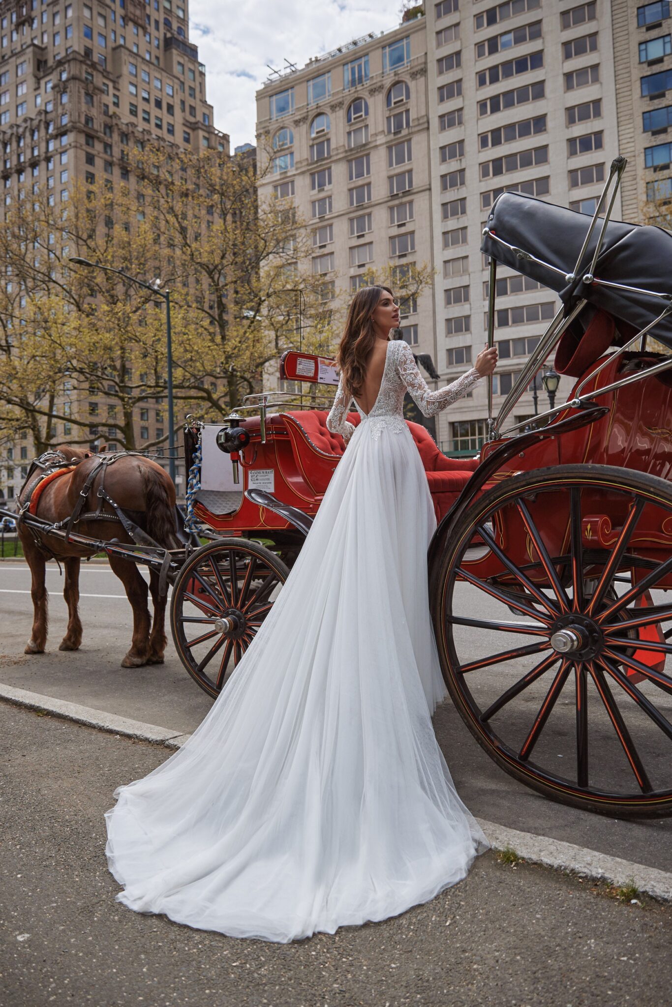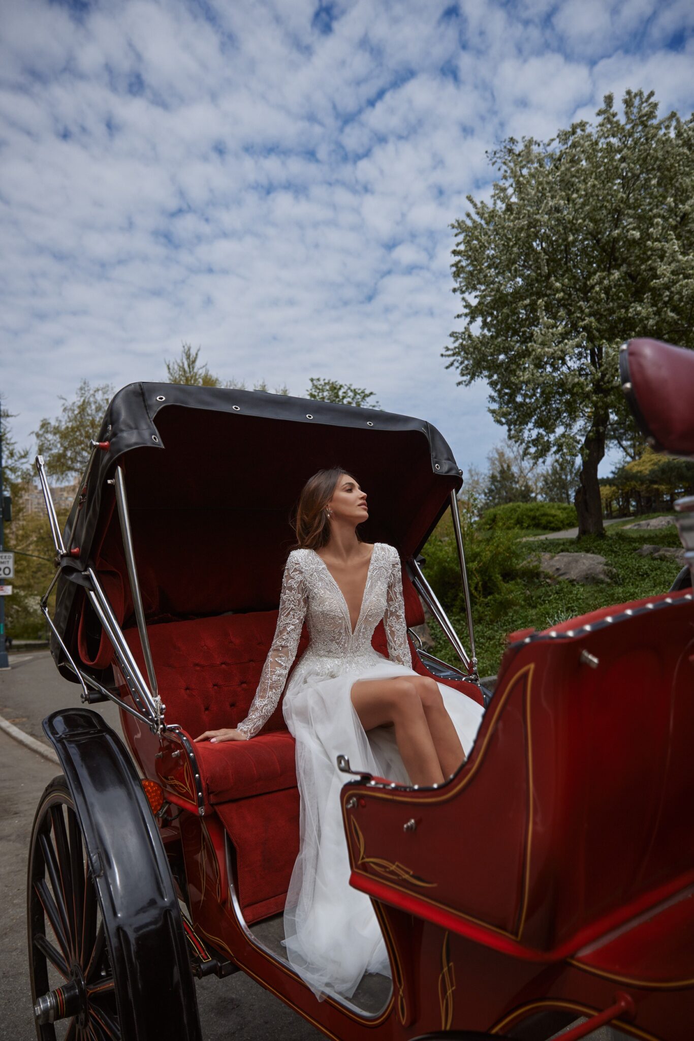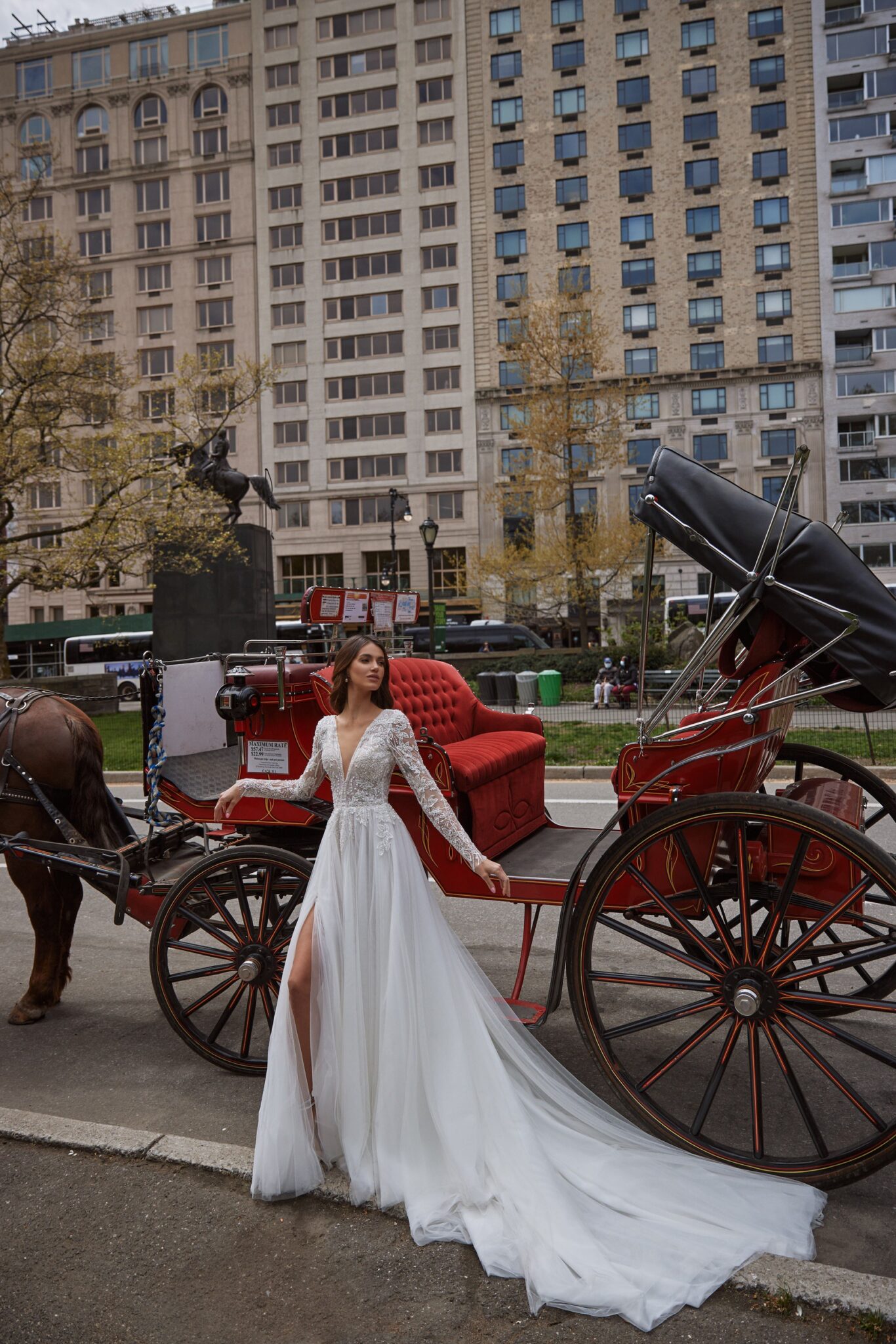 Love in the CityKim is a stunning A-line wedding gown with a long train. A dress is made of veiling with high cut on one leg. The corset is entirely embroidered with beads and spangles. It is embellished with V-shaped low neck and a deep V-neckline at the back of the dress. The tender long transparent sleeves are all embroidered with beads and crystals with floral pattern. A skirt is made of the same shining fabric and veiling. It goes into a long train.