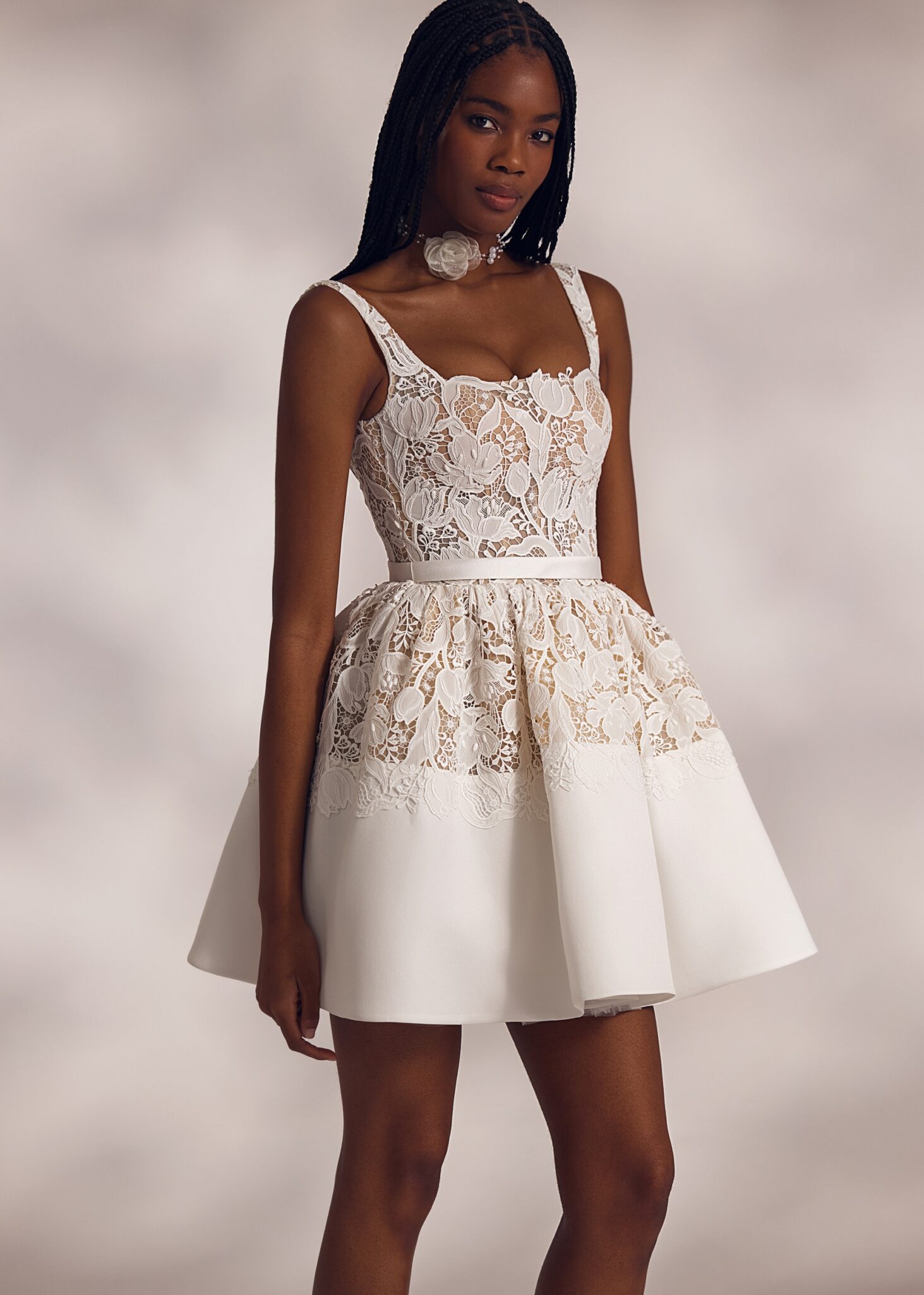 Less is More IVKristi mini – florentine neckline dress with guipure top highlighted by natural waistline and descending guipure basque followed by the smooth flared above-the-knee skirt. The cut out mid-depth back adds lightness to the outfit.
