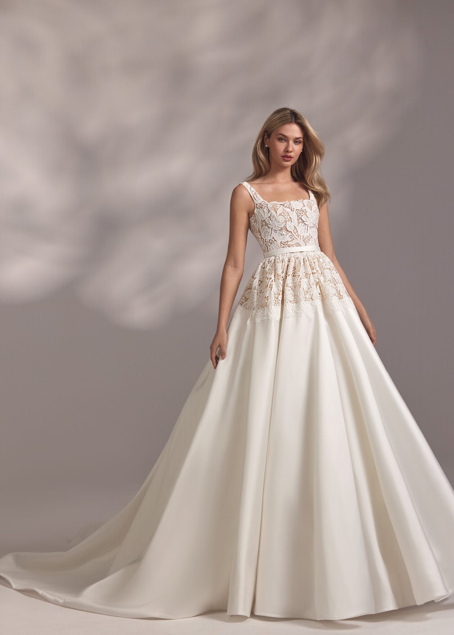 Less is More IVKirsti – florentine neckline dress with guipure top highlighted by natural waistline and descending guipure basque followed by the smooth voluminous skirt. The cut out mid-depth back adds lightness to the outfit.