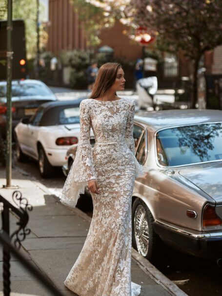 Love in the CityThis medmaid wedding gown is made of shining fabric. A sweetheart neckline accentuates a beautiful decollete. The fantastic deep neckline at the back of the dress is decorated with floral lace. The delicate skirt, made of lush Tulle, covered with lace passes into a long train. There is an additional bolero that is made of transparent fabric and embroidered with beads and crystals.