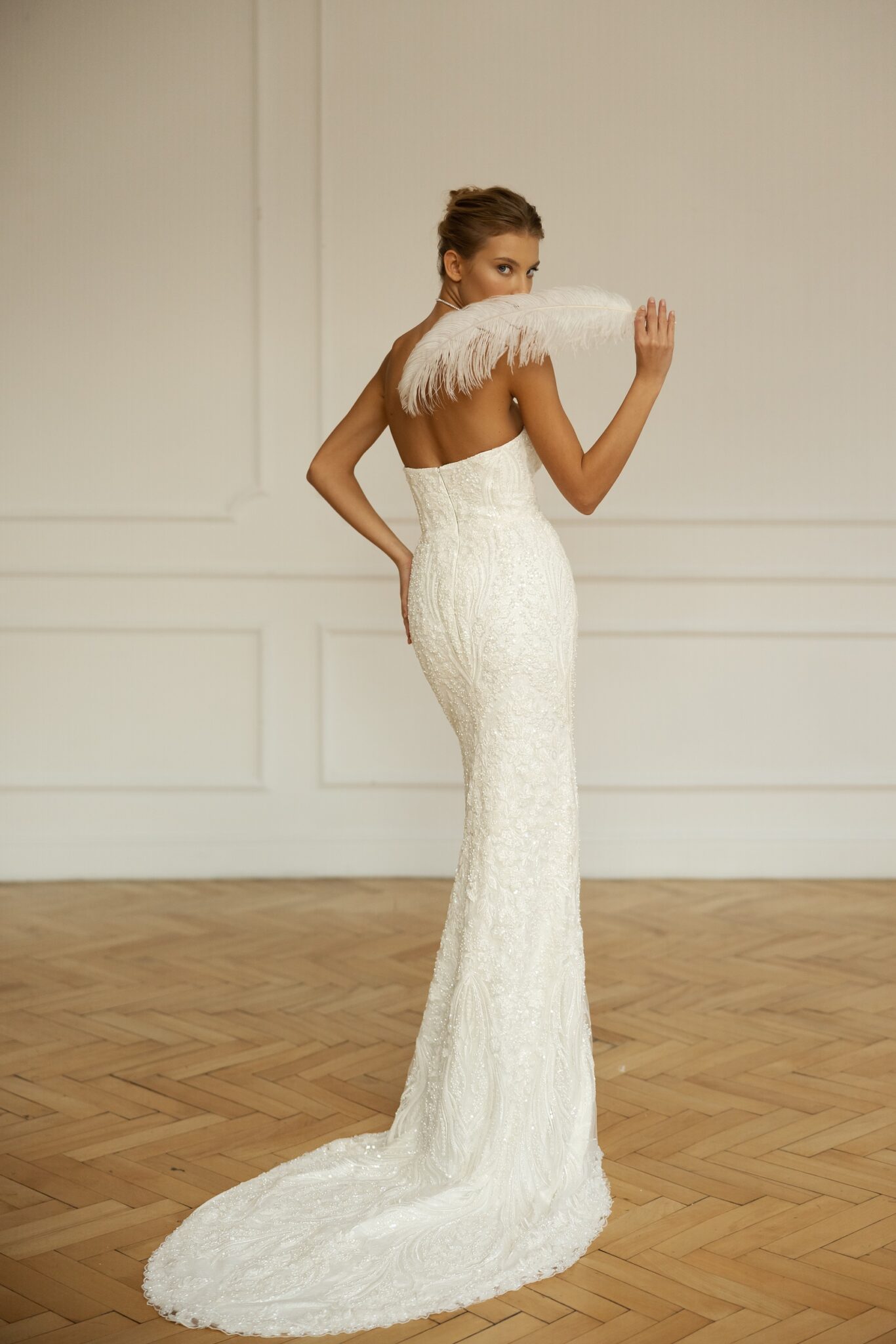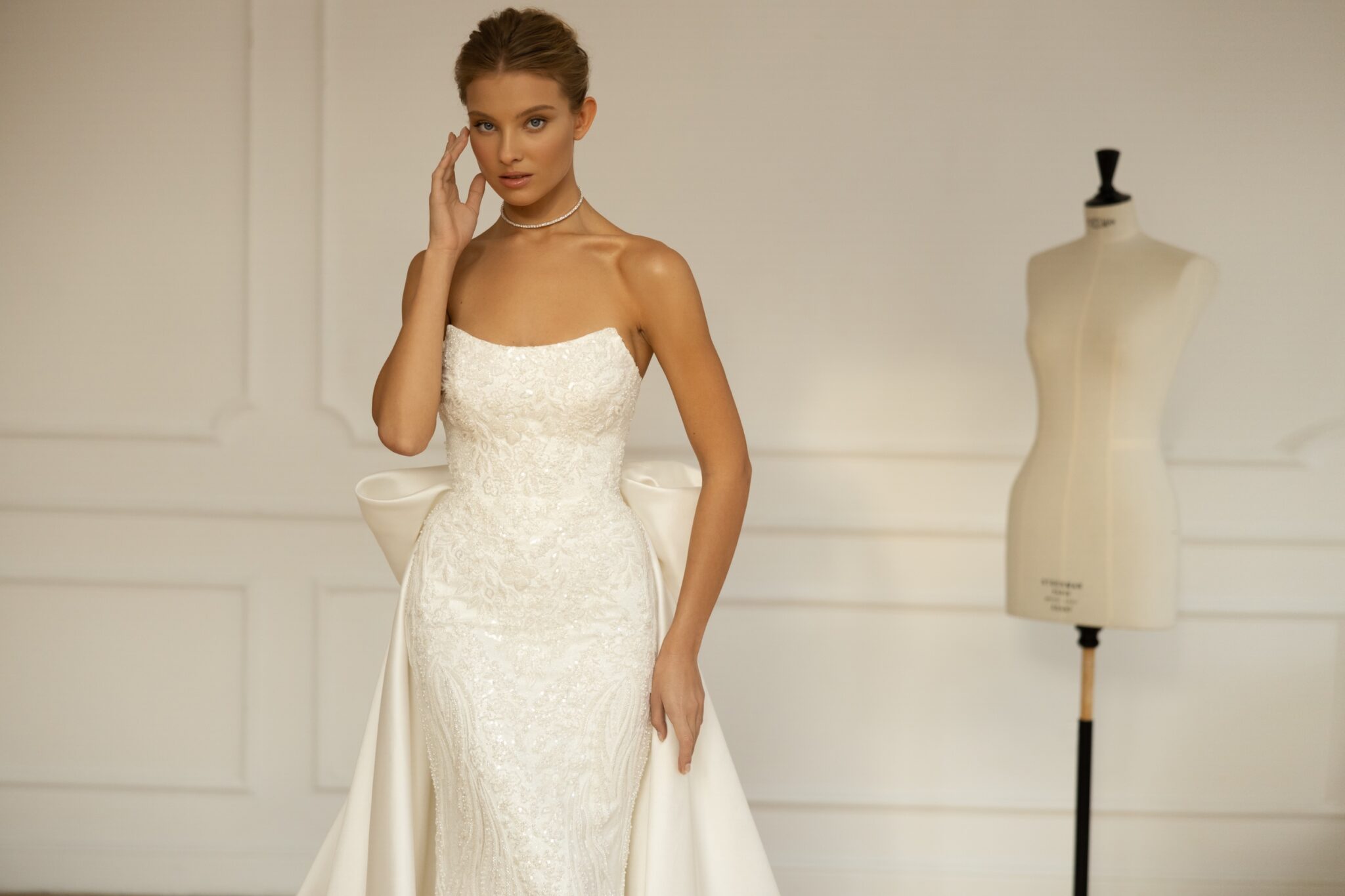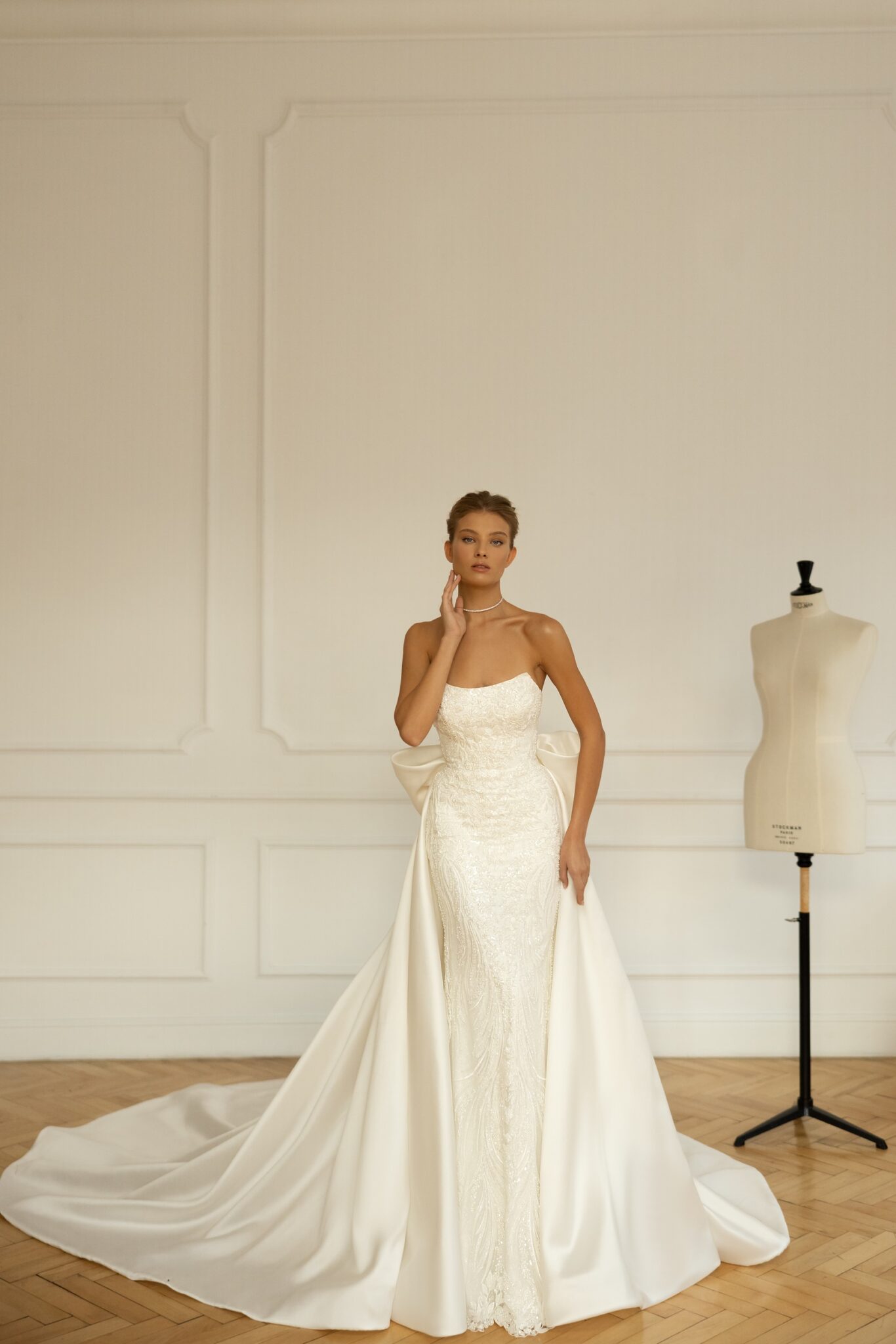 Less is more 2023Lanvee is a head-turning, catwalk-led mermaid gown beaded all over for maximum glamor. Strapless and with a stunning Straight neckline and built-in pointed corset this dress attracts all the attention to the bride. Its svelte lines are perfect for accessorizing with a dramatic overskirt with a voluminous oversized bow for a royal bridal look