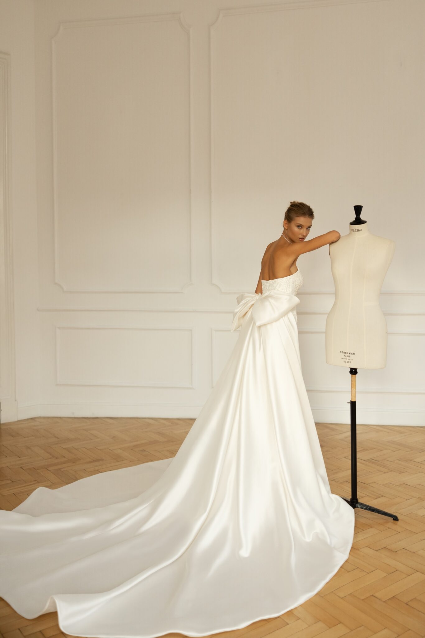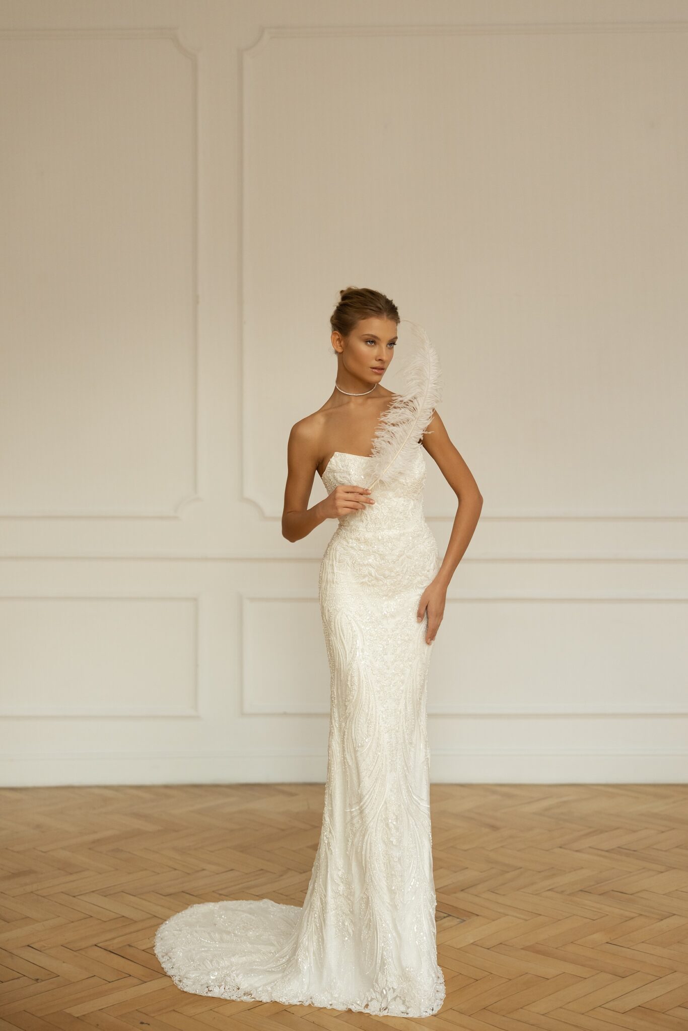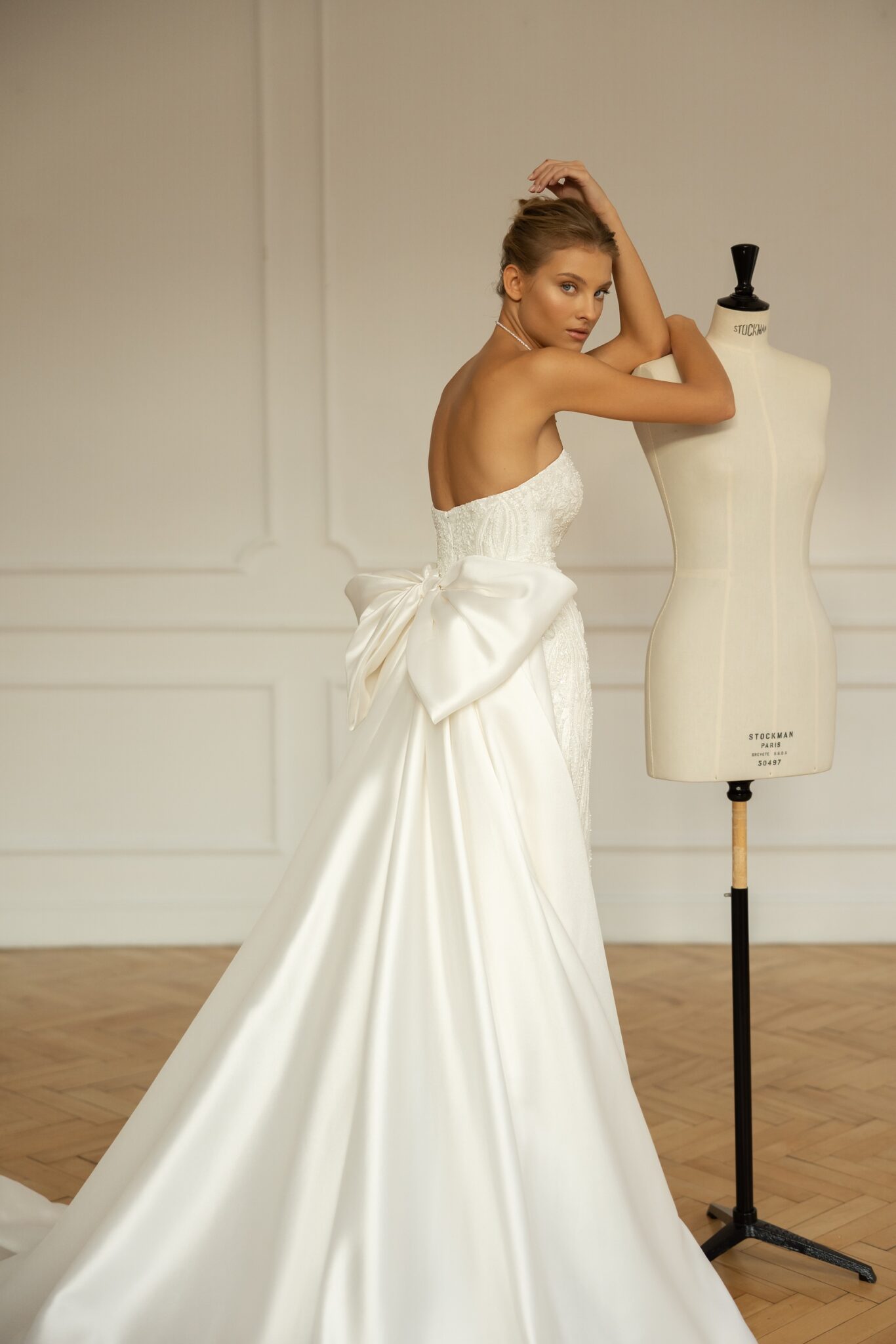 Less is more 2023Lanvee is a head-turning, catwalk-led mermaid gown beaded all over for maximum glamor. Strapless and with a stunning Straight neckline and built-in pointed corset this dress attracts all the attention to the bride. Its svelte lines are perfect for accessorizing with a dramatic overskirt with a voluminous oversized bow for a royal bridal look