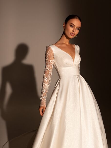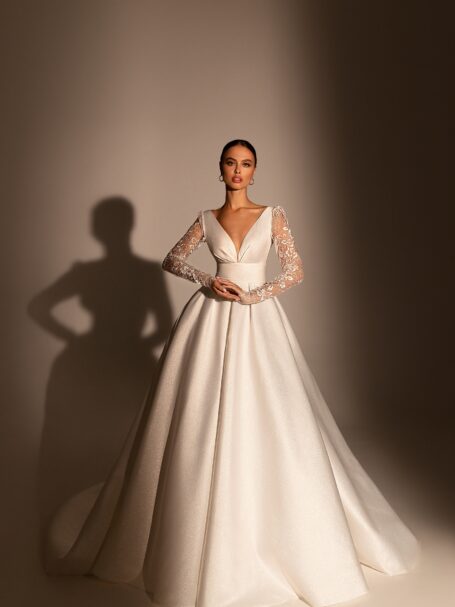 Muse, Plus SizeFantastic Layla wedding gown with a fabulous train. An A-line dress with a sweetheart neckline is made of satin. Skirt goes into a train. Gorgeous cape made of veil is making the dress even more tender.
