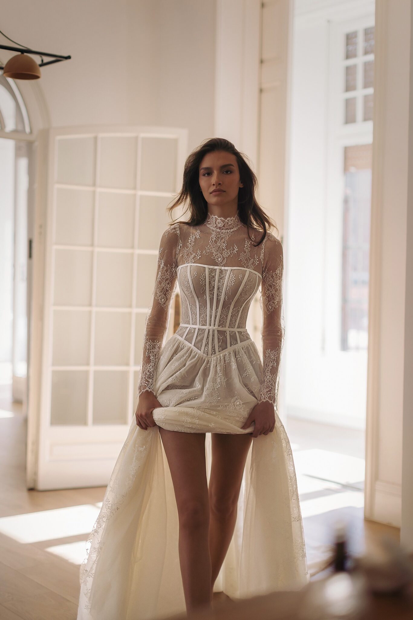 GeminiLegend — semi-translucent detailed corset-based turtleneck dress with long sleeves and floral embroideries above the cups, on the waist, sleeves, and on the skirt.