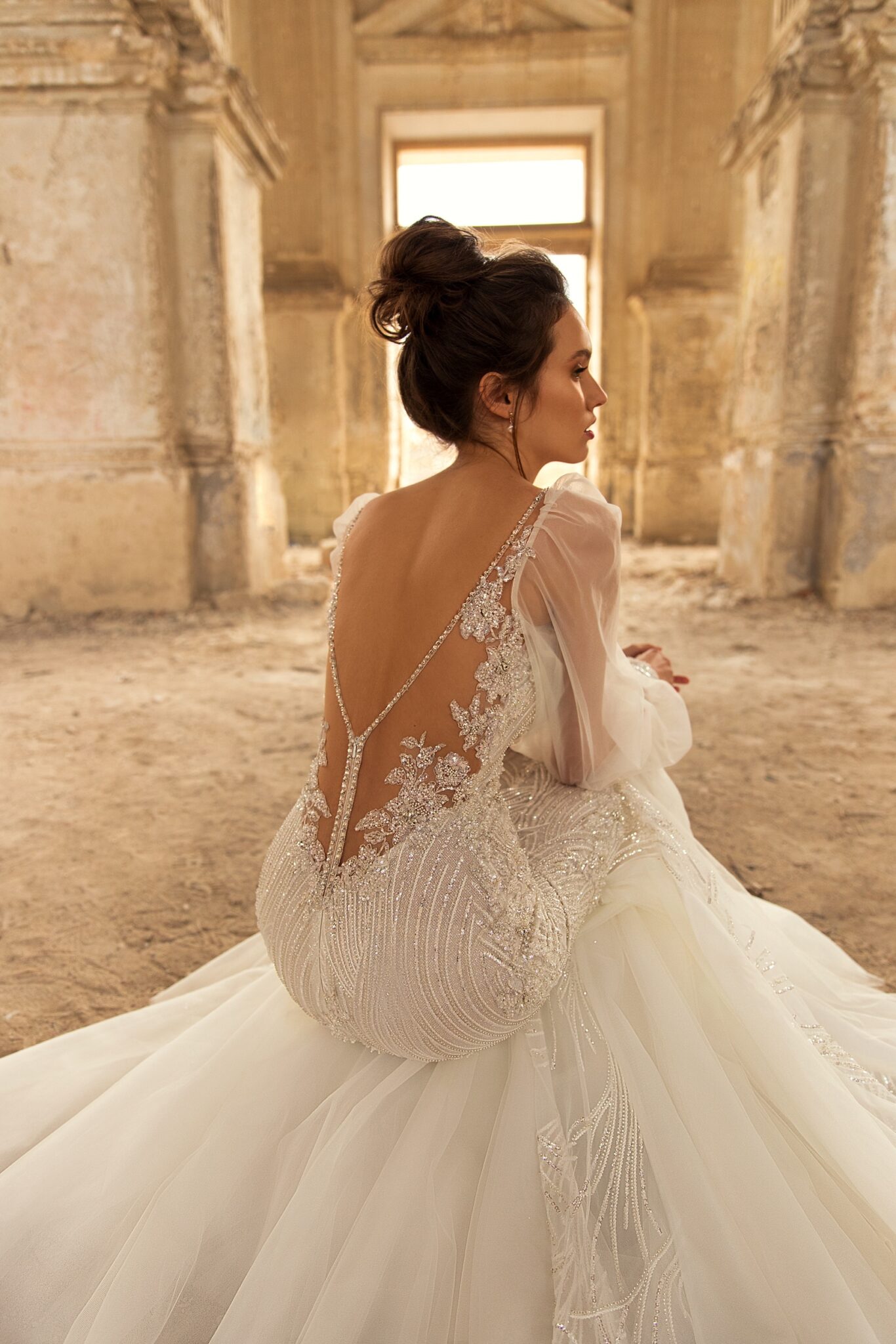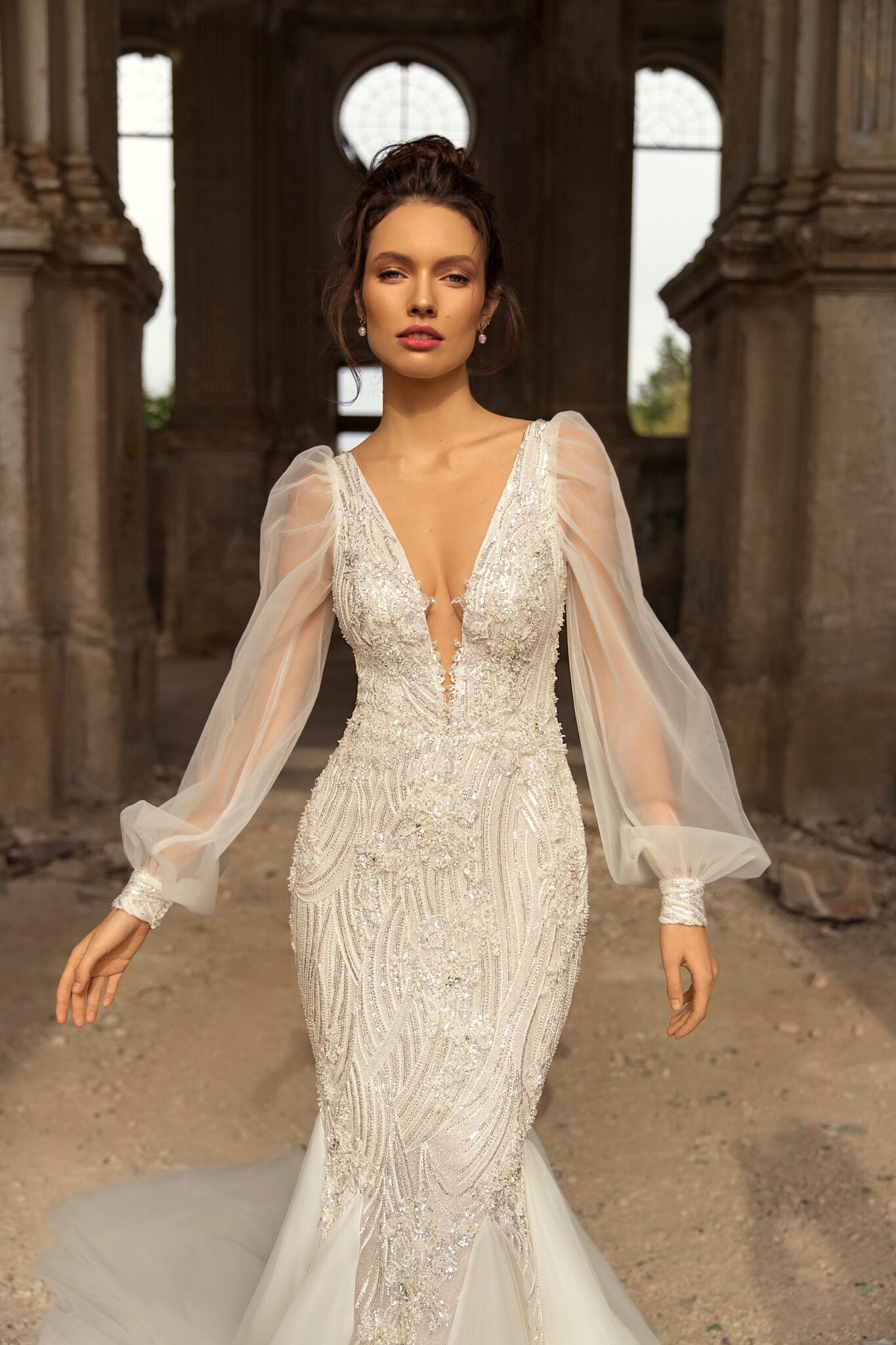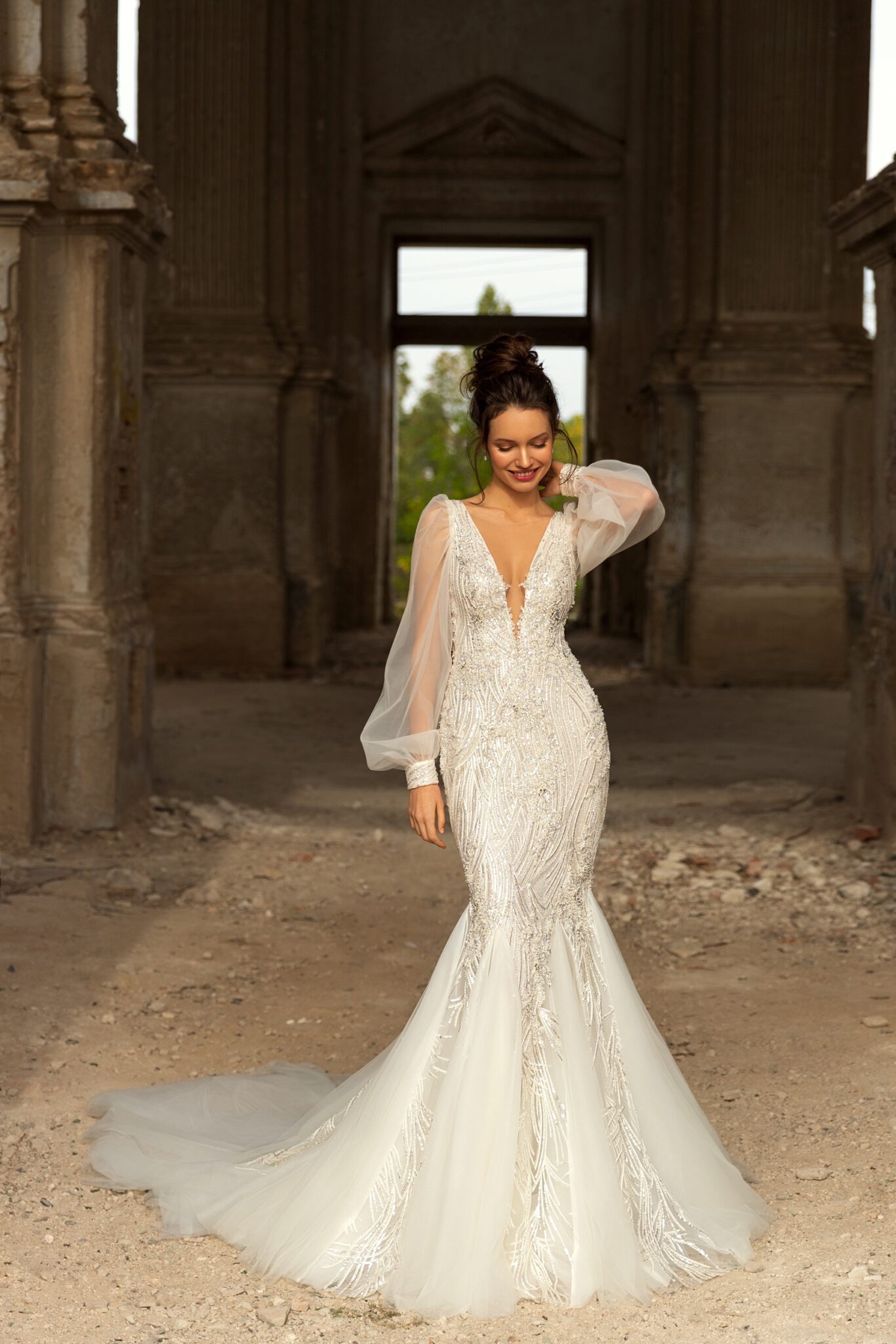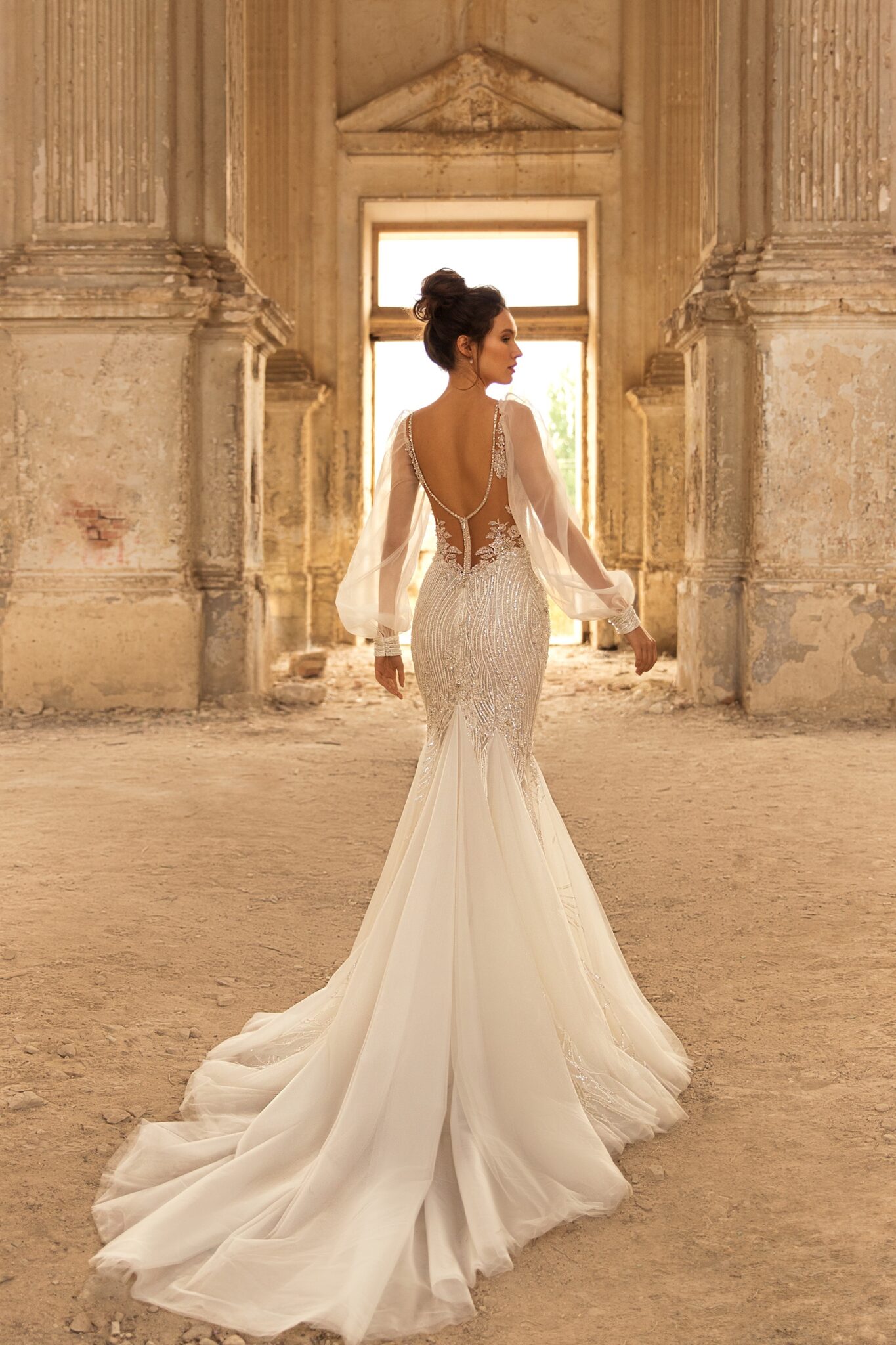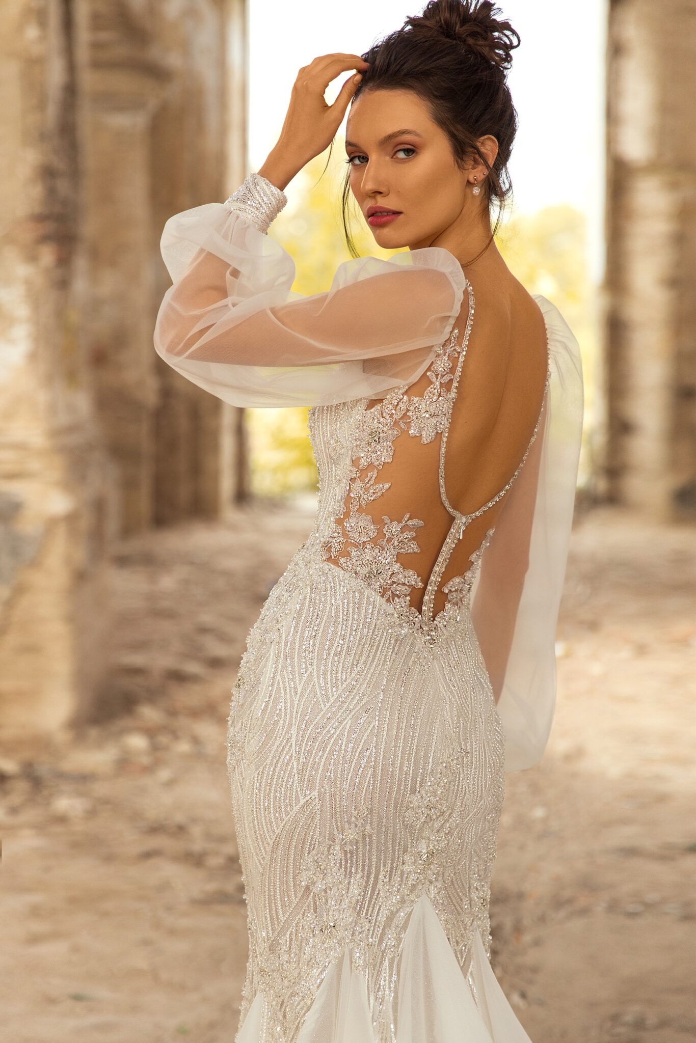 Golden HourStylish Lennox gown is a perfect choice for the luxurious wedding reception. The dress is fully decorate by sparkly lace with beads. Long transparent sleeves and open back are making the look even more attractive.