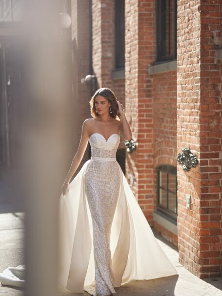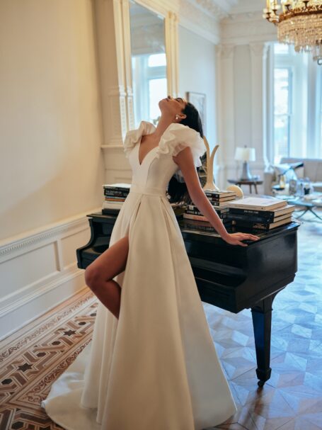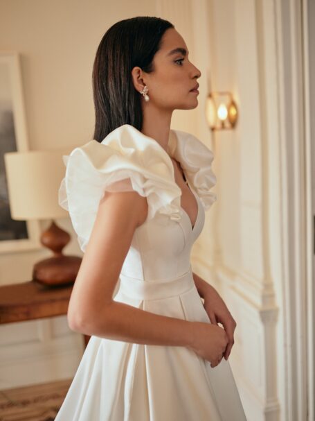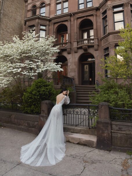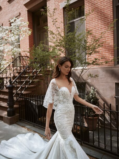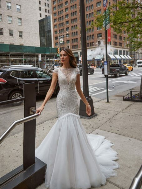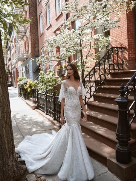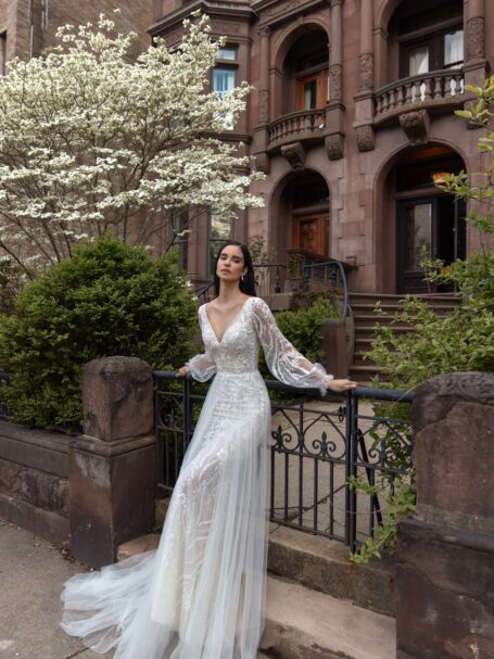 Love in the CityLace Leonila A-line wedding gown looks fabulous. Temder V-neckline accentuates the cellarbones and the corsage is made of sophisticated lace. Veiling insets on the corsage look fantastic. The long lace sleeves end with elegant falbalas. The skirt is made of the same lace with floral pettern and Tulle layers. Long train makes this outfit perfect.