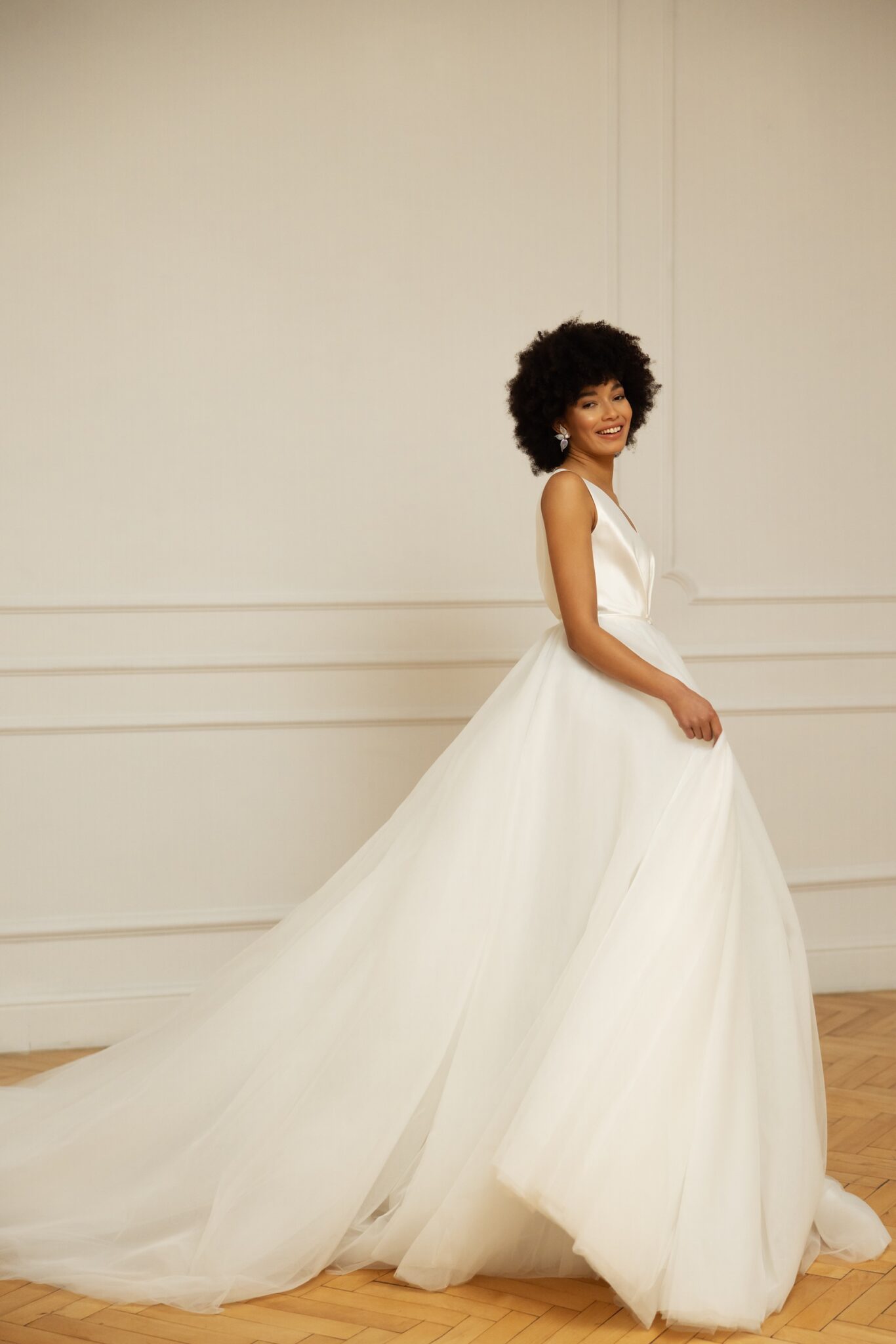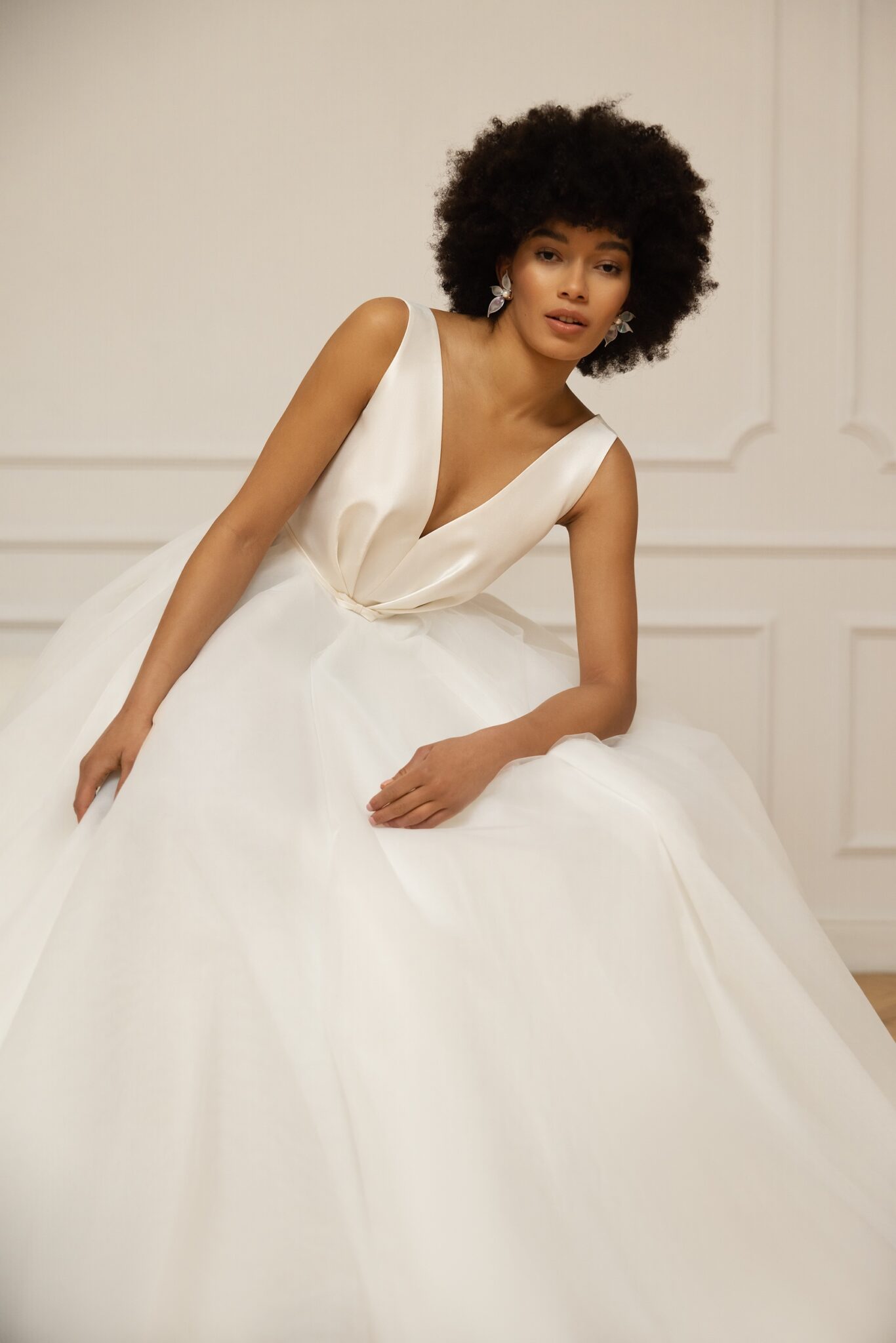 Less is more 2023The elegance of Mikado silk and weightless Tulle give shape to this spectacular A-line dress, a trendy design that enhances the sensuality of the figure with a plunging V-neck front and back, stylish soft folds with a thin belt and a spectacular full princess skirt