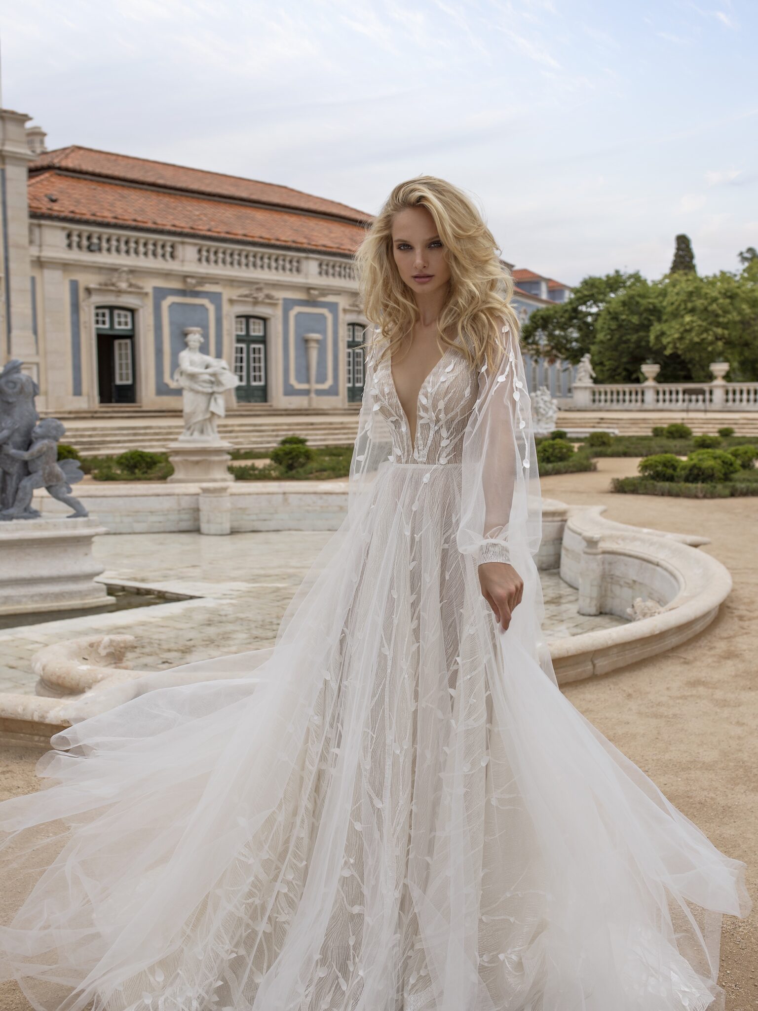 Lisbon VibesFabulous Lima wedding gown is a graceful and laconic outfit. A-line dress is entirely decorated with a floral lace pattern. This pattern is combined with a thin veiling layer. V-shaped low neck, long deep neckline at the back of a dress make this look tender and feminine.