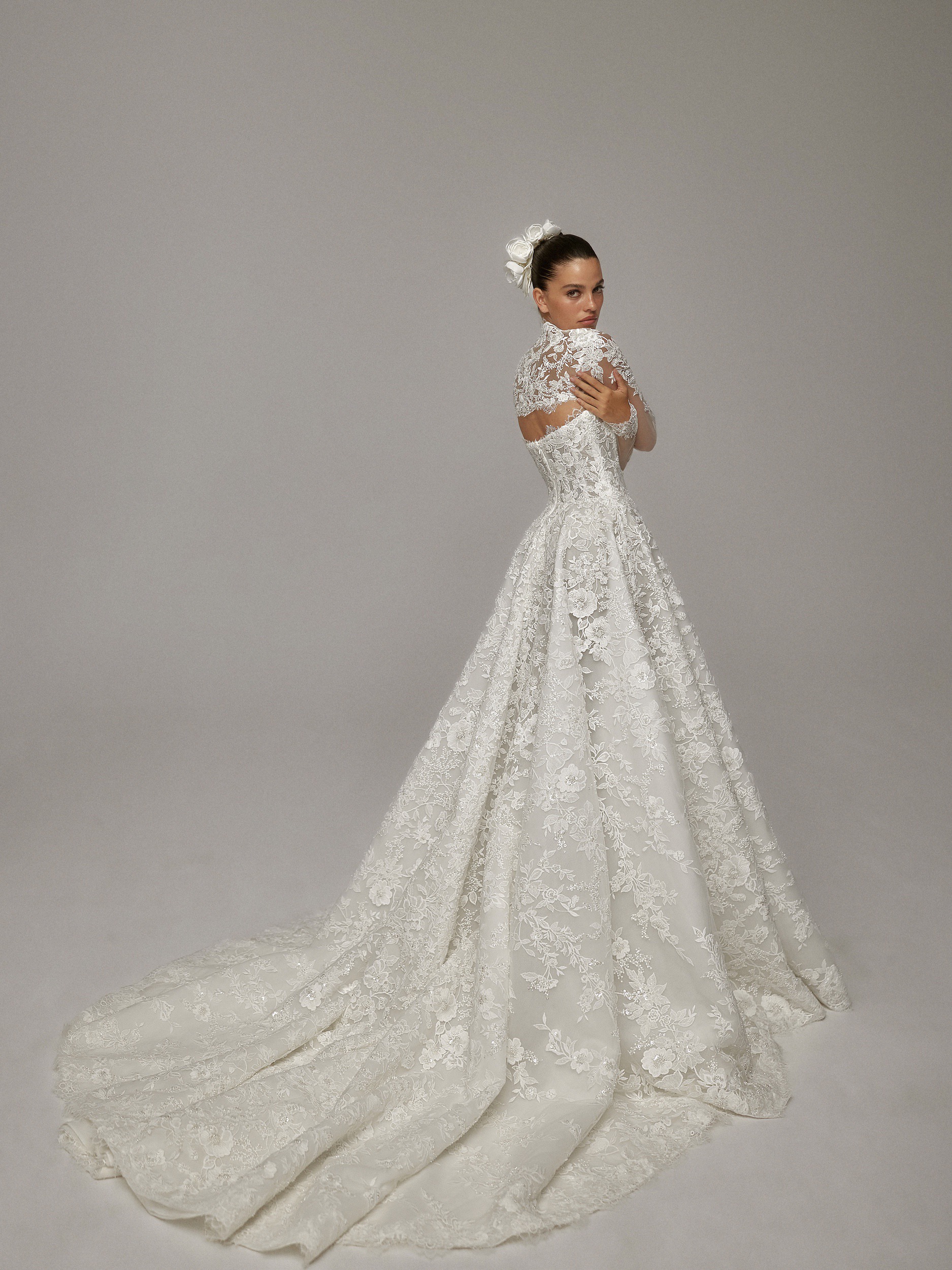 When the bolero is removed, the dress transforms into a more open and airy look, making Lizett perfect for brides who want versatility and refined charm in one design.