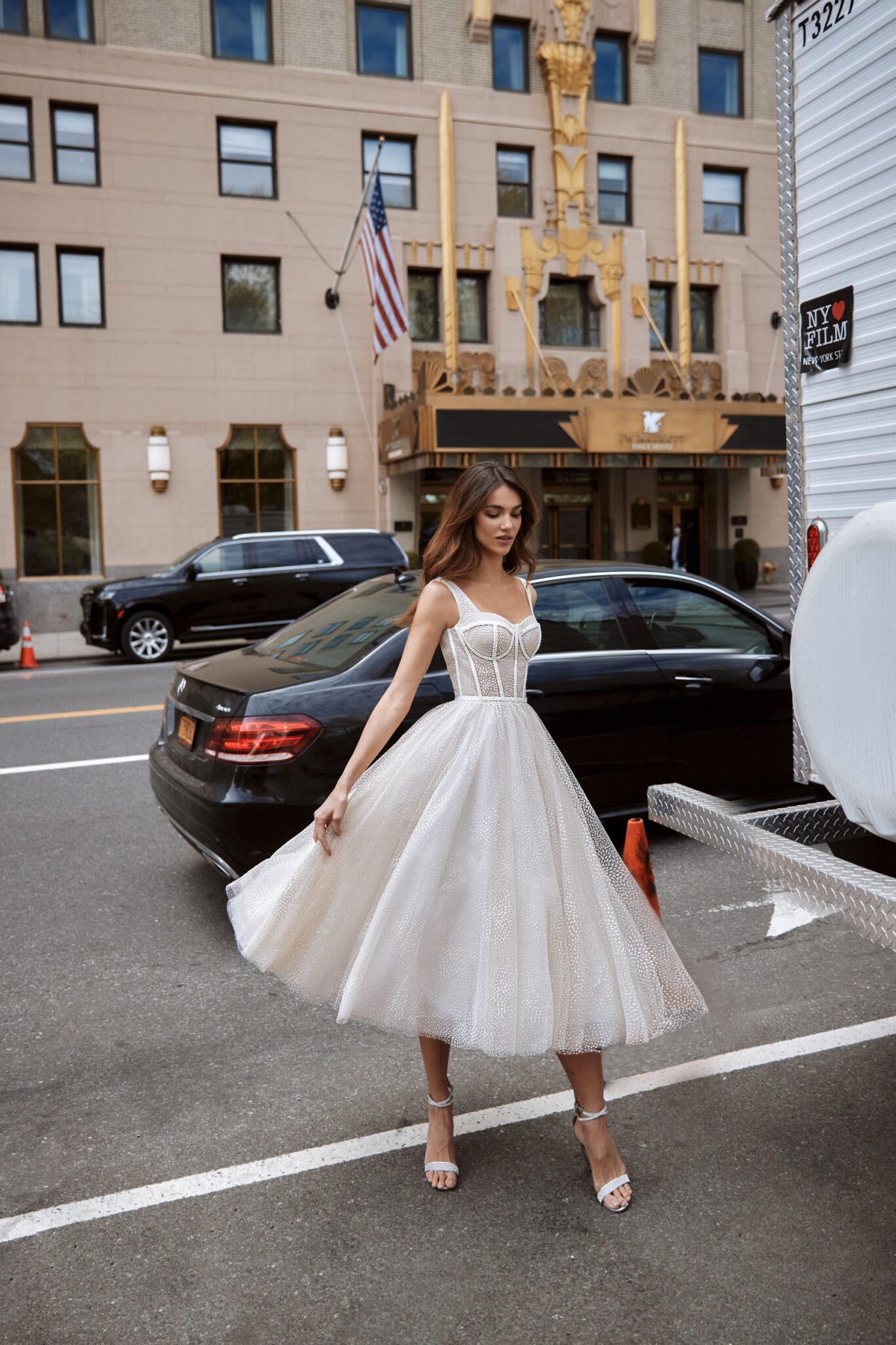 Love in the CityLola is a lovely wedding dress of midi-length. The top is embellished with wide straps and has a sweetheart neckline. The thin belt accentuates the bride’s waist. The skirt is made of shining lace with spartkling pattern with small dots. Lola dress is a perfect wedding gown for a party celebration.