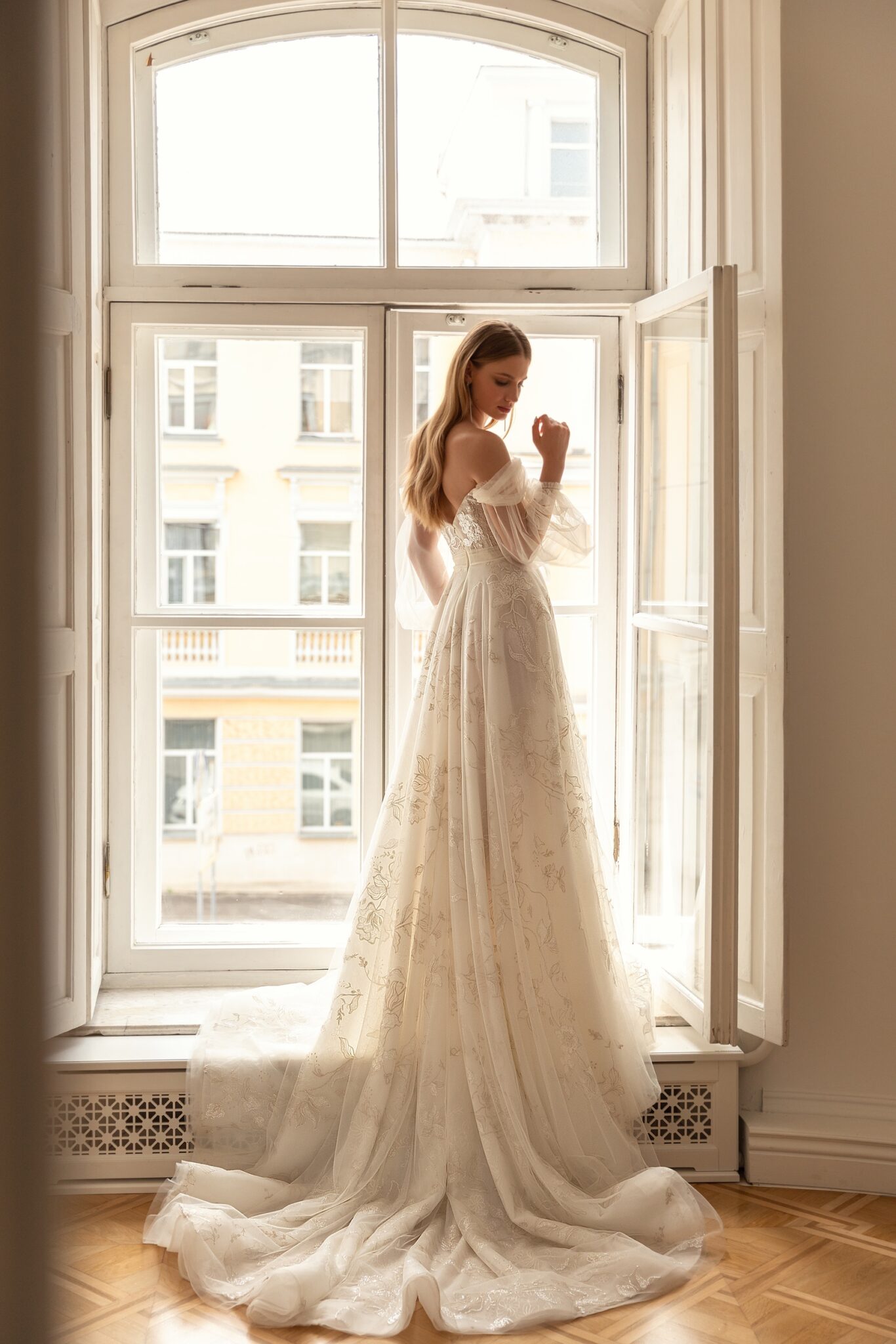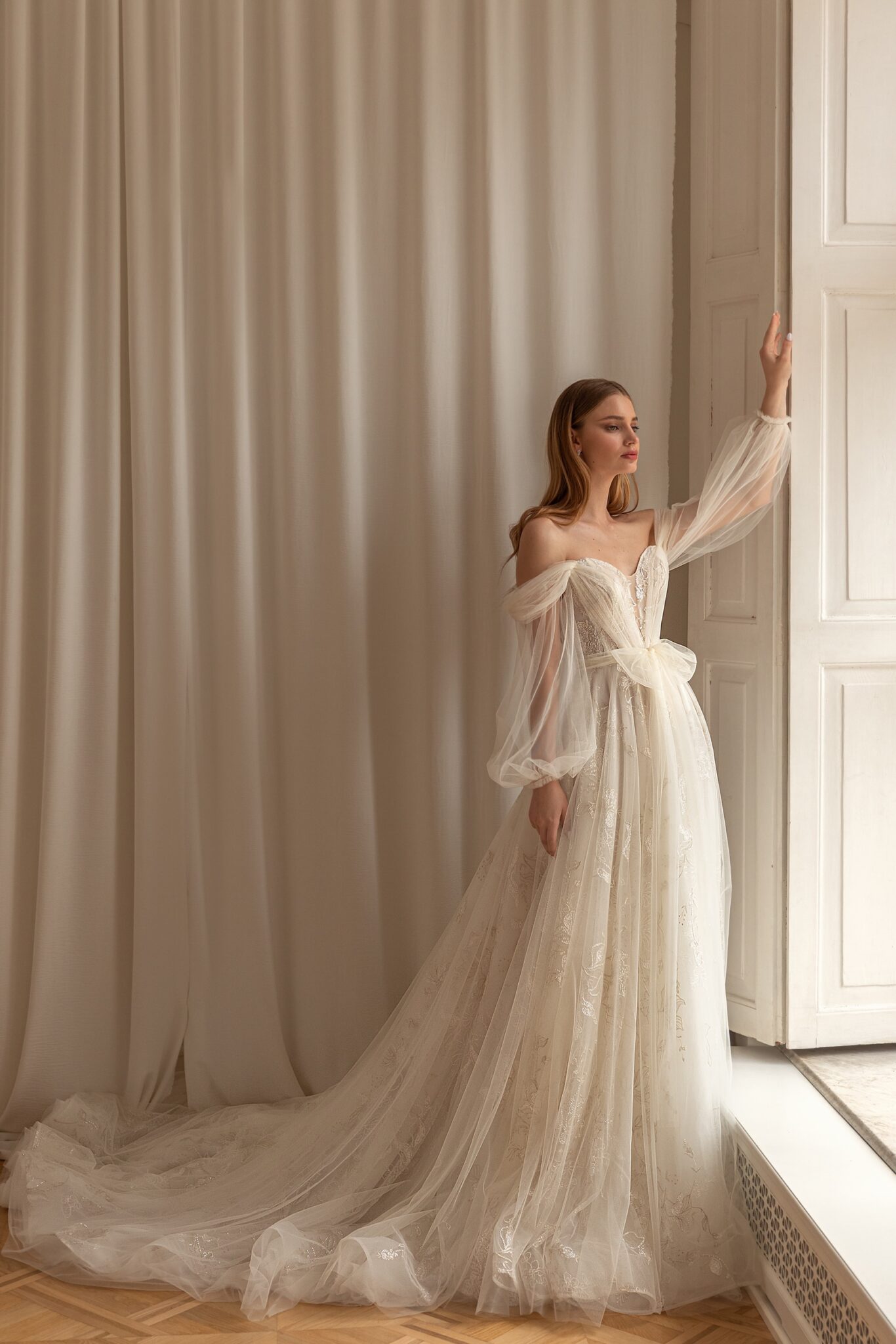 Less is more 2022Loretta is a romantic wedding dress made of weightless materials. The corset has a tender off-shoulder heart-shaped neckline with long loose sleeves made of Tulle. The top is embellished with embroidered lace and a bow made of Tulle is of Ivory colour. The back of the dress has V-shaped neckline and passes into a loose A-line skirt made of flower lace and Tulle. Loretta is accomplished with a fantastic long train.