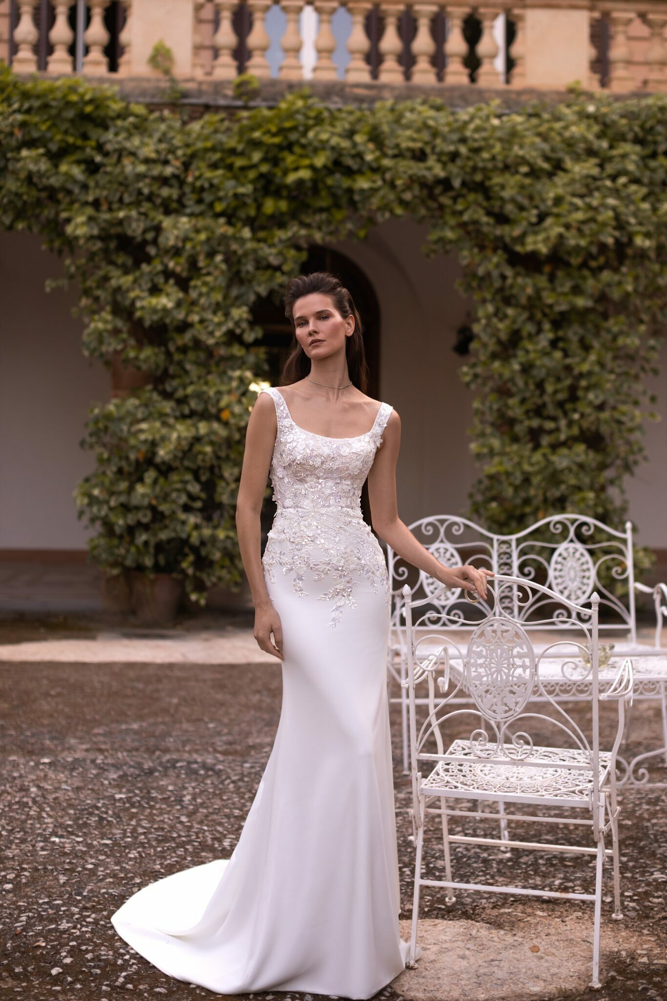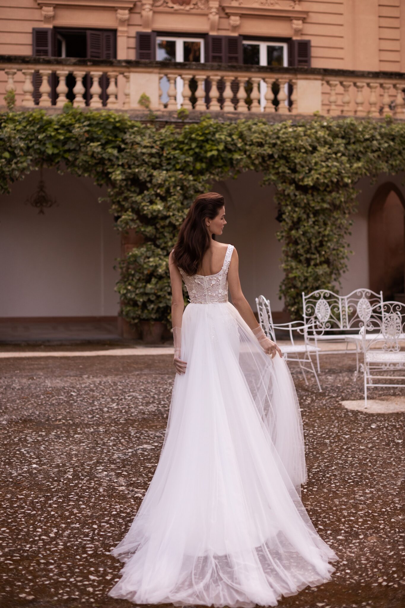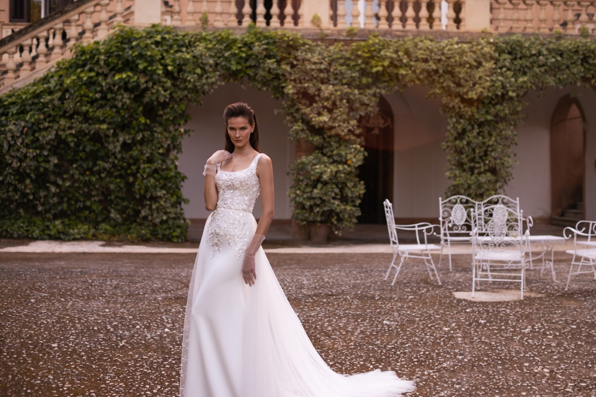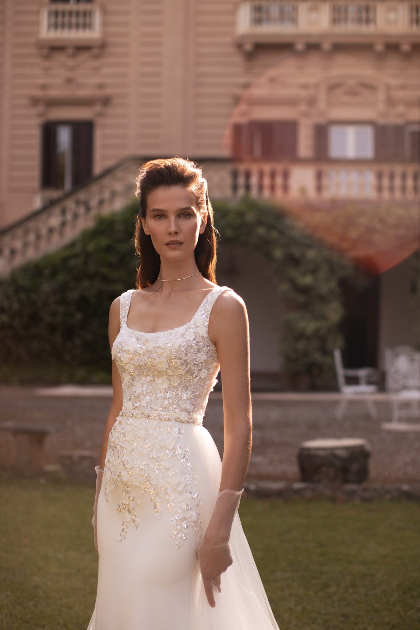 PalermoLuana is a super-fitted trumpet bridal gown decorated with scattered hand-embroidered 3D floral appliques with sparkling beads and sequins. Chic Boat neckline passes into sheer embroidered straps and a clean lined satin skirt is paired with a lightweight Tulle overskirt that is fixed on a waist and passes into a neat chapel train.
