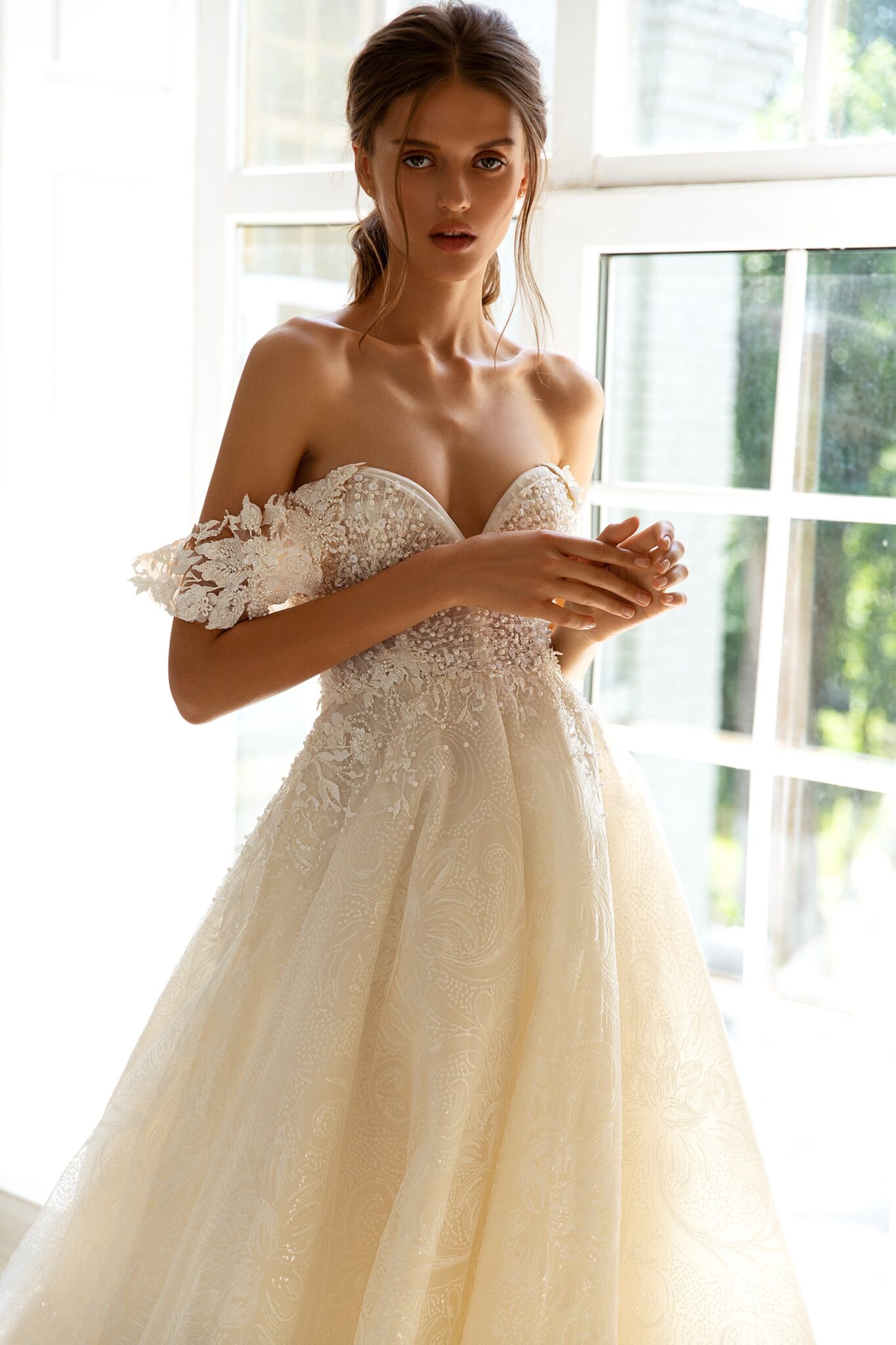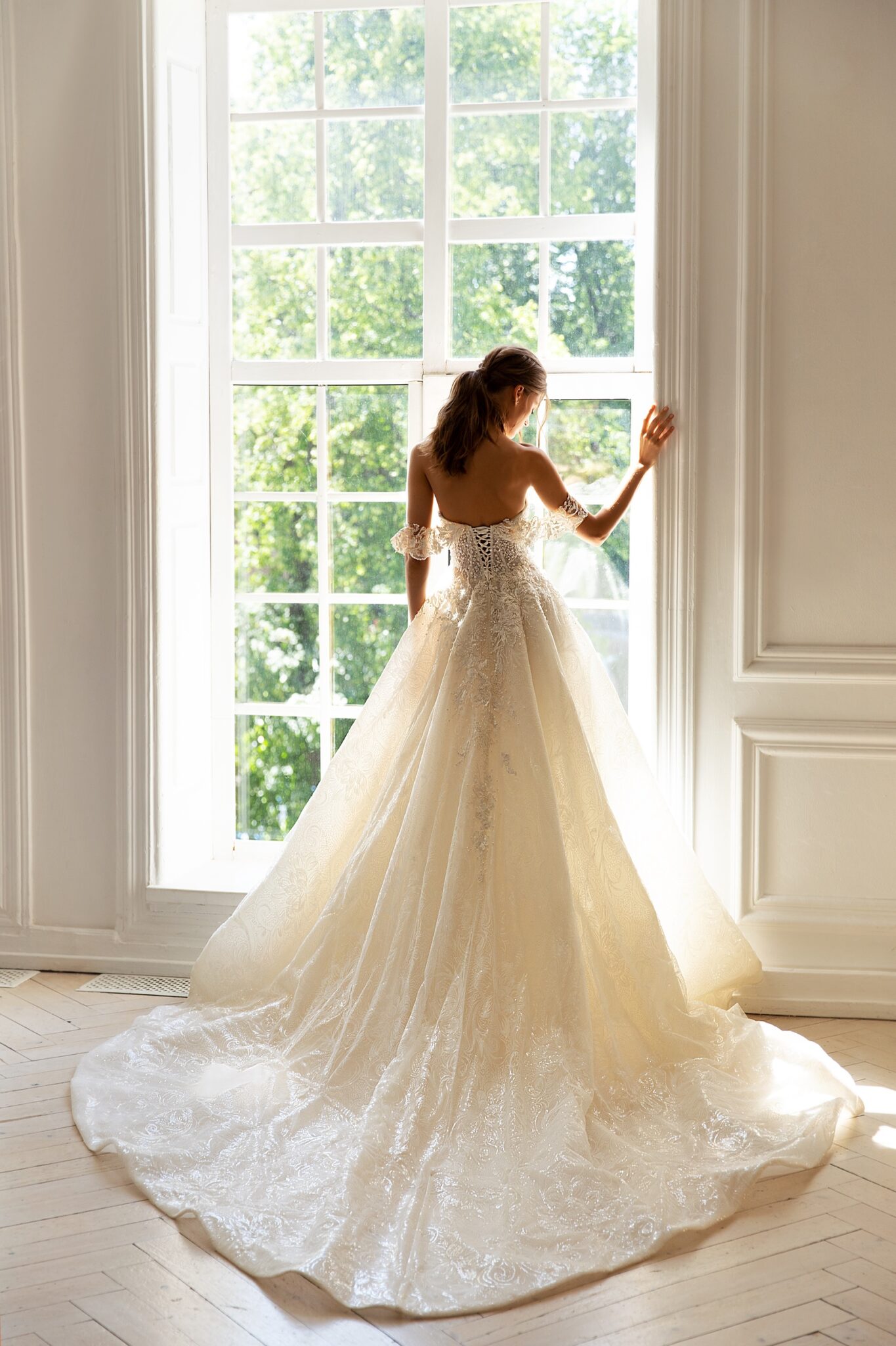 RomanceA tender and laconic wedding gown with spectacular lace and embroidery. A bodice with lowered shoulders has a V-shaped neckline. It is decorated with a floral pattern and embroidered with beads and spangles. Lace inserts are also found on a veiling skirt. This fabulous skirt passes into a long train.