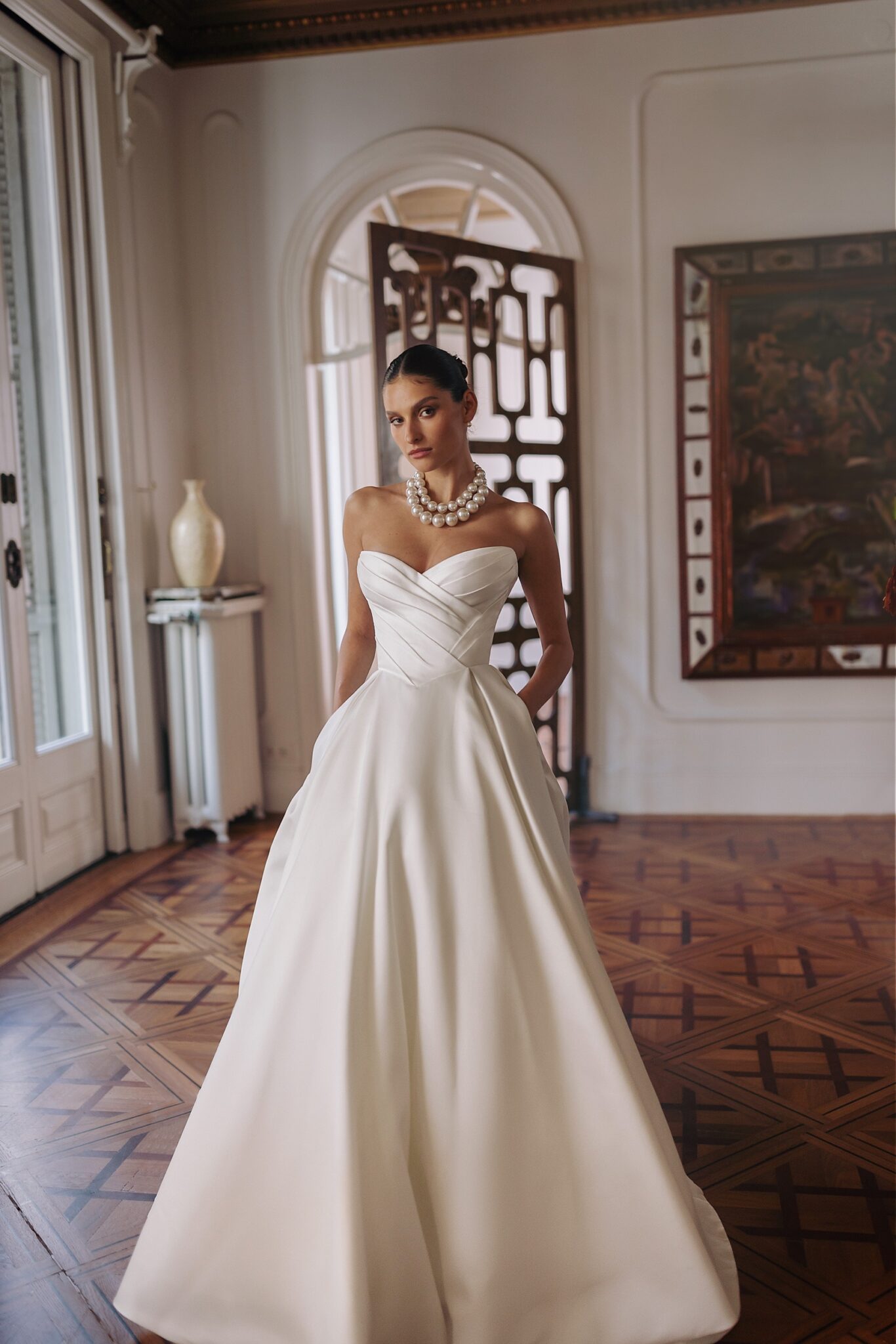 GeminiMaeve — asymmetric wrapped corset, A-silhouette voluminous smooth skirt with medium-size trail.