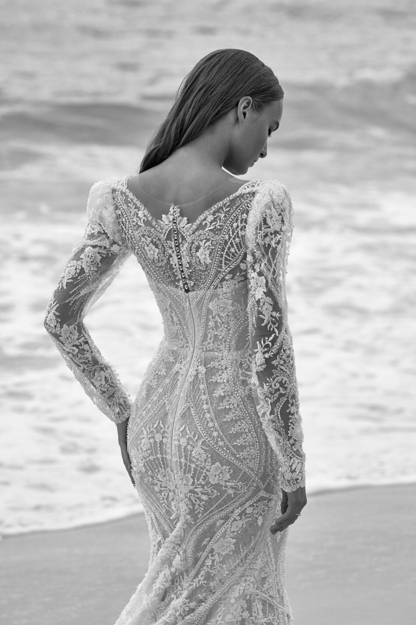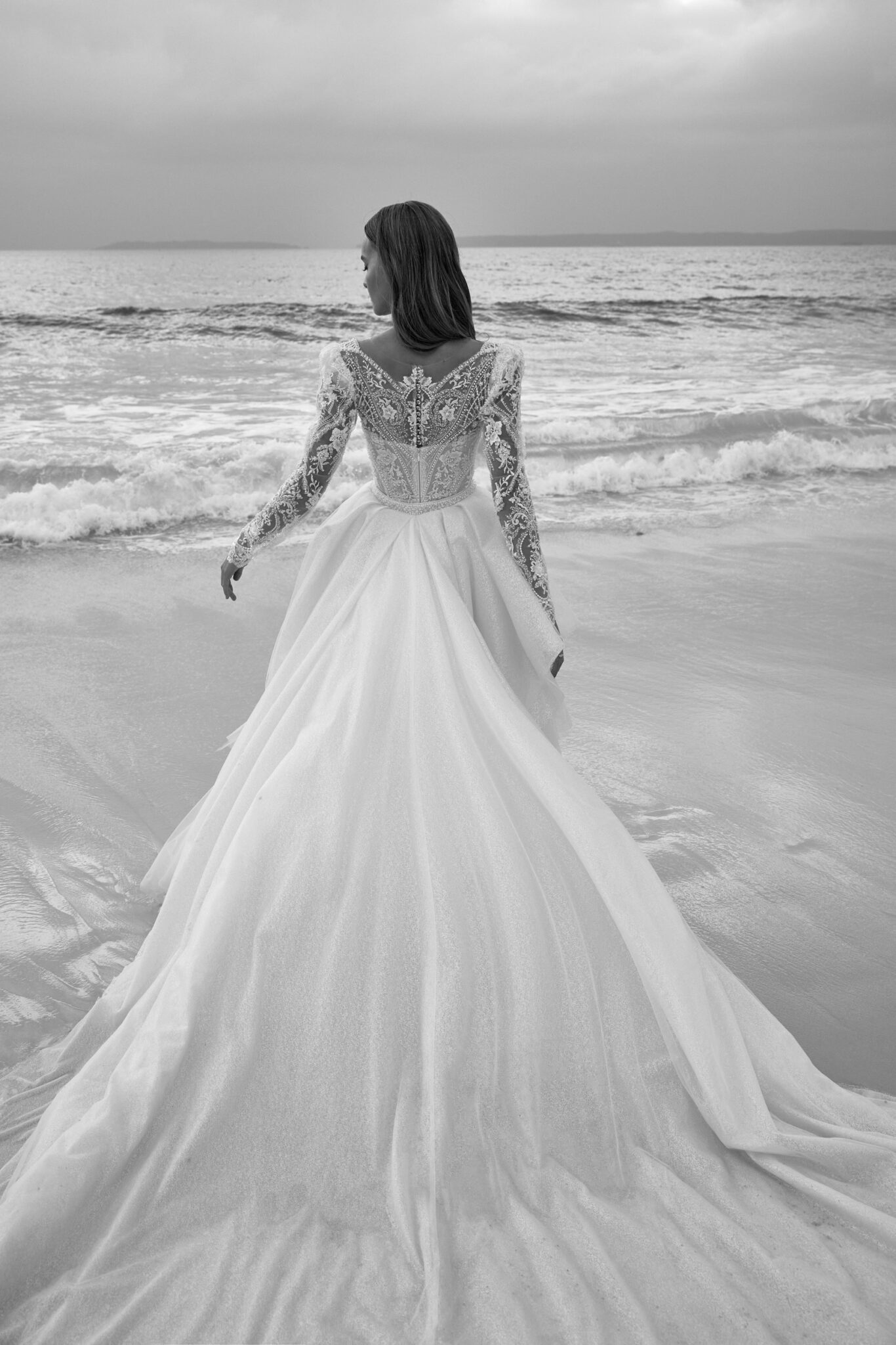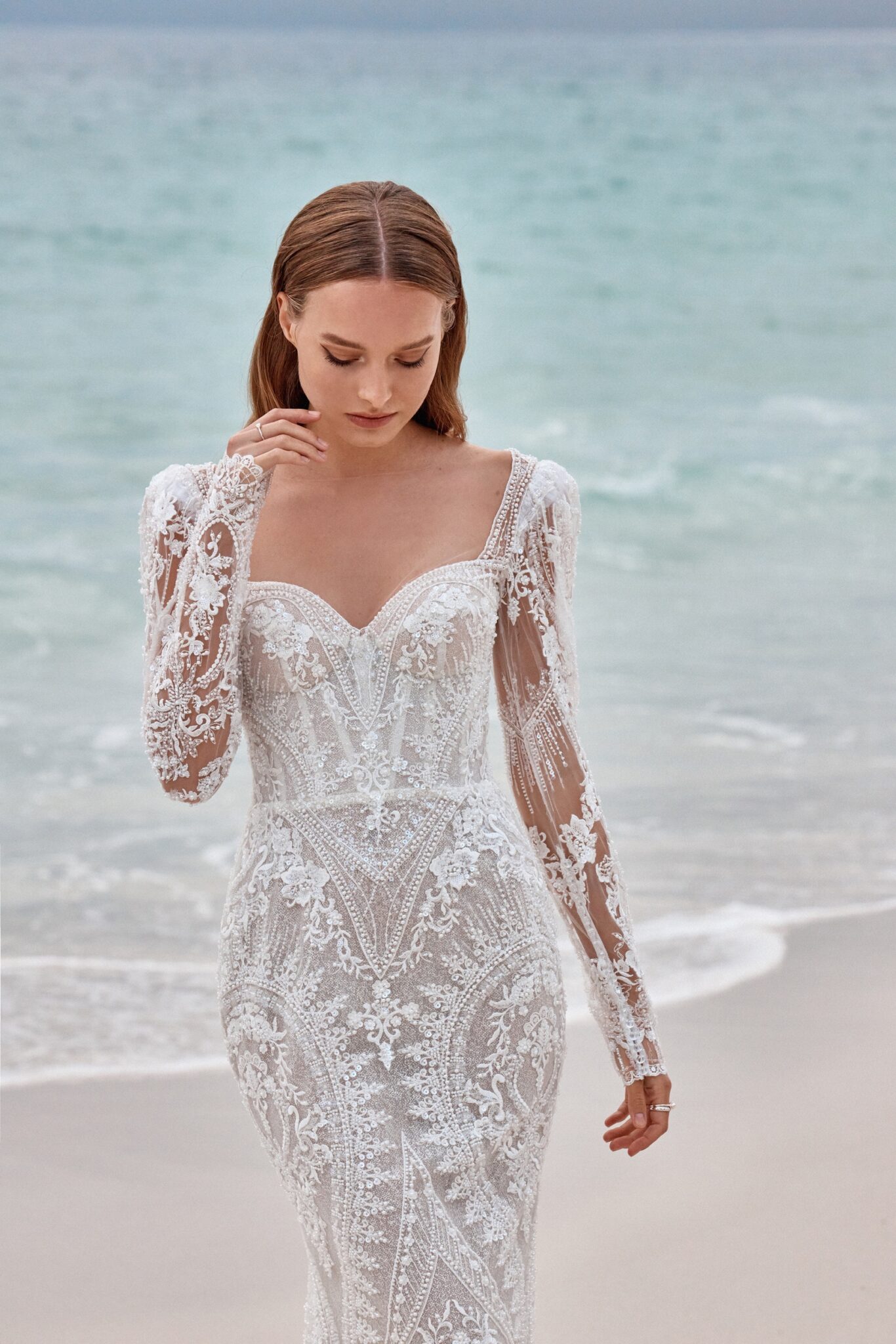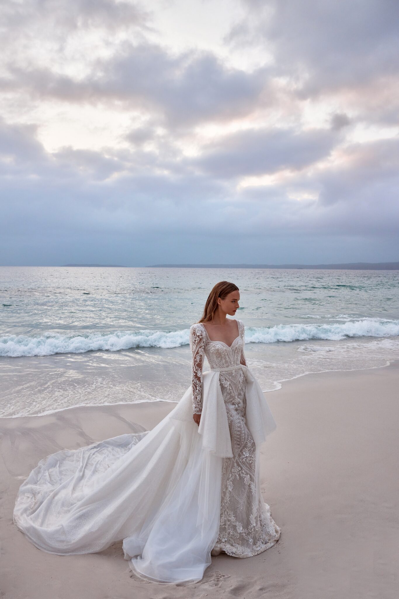 Atelier signature editionThis exquisite fit and flare lace wedding dress is a symphony of grace and sophistication. Its sweetheart neckline exudes timeless romance, while the long sleeves, crafted from the same lace, lend an air of elegance and continuity to the ensemble. For added versatility and drama, this gown also features a detachable voluminous overskirt, ensuring the bride can effortlessly transition from a classic ceremony look to a show-stopping reception appearance.
