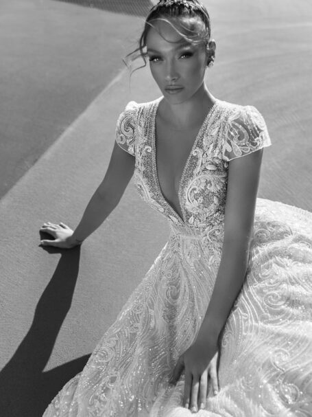 Bridal AlchemyThe Malaga gown is a unique transformable dress featuring three removable elements. The base dress and sleeves are made from exquisite beaded Chantilly lace, adding an elegant shimmer to the design.
