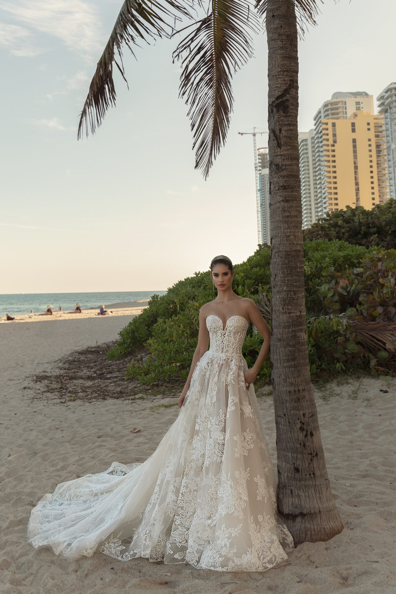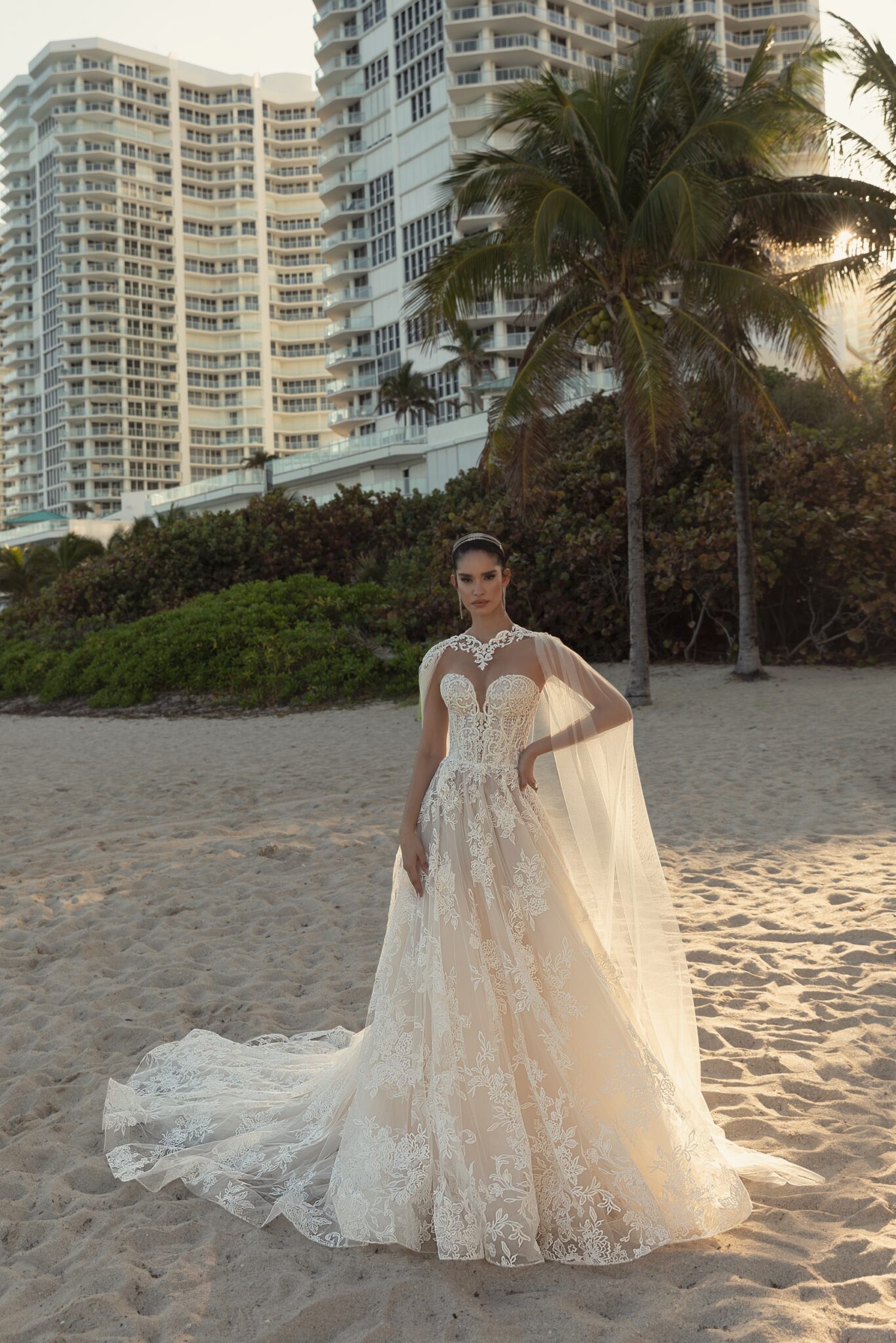 MiamiFantastic Malika wedding gown with a fabulous train. An A-line dress with a sweetheart neckline is made of veiling and decorated with lace elements. A bodice of the dress is entirely made of lace. Skirt with floral details goes into a train. A cape is made of veiling and embellished with lace inset.