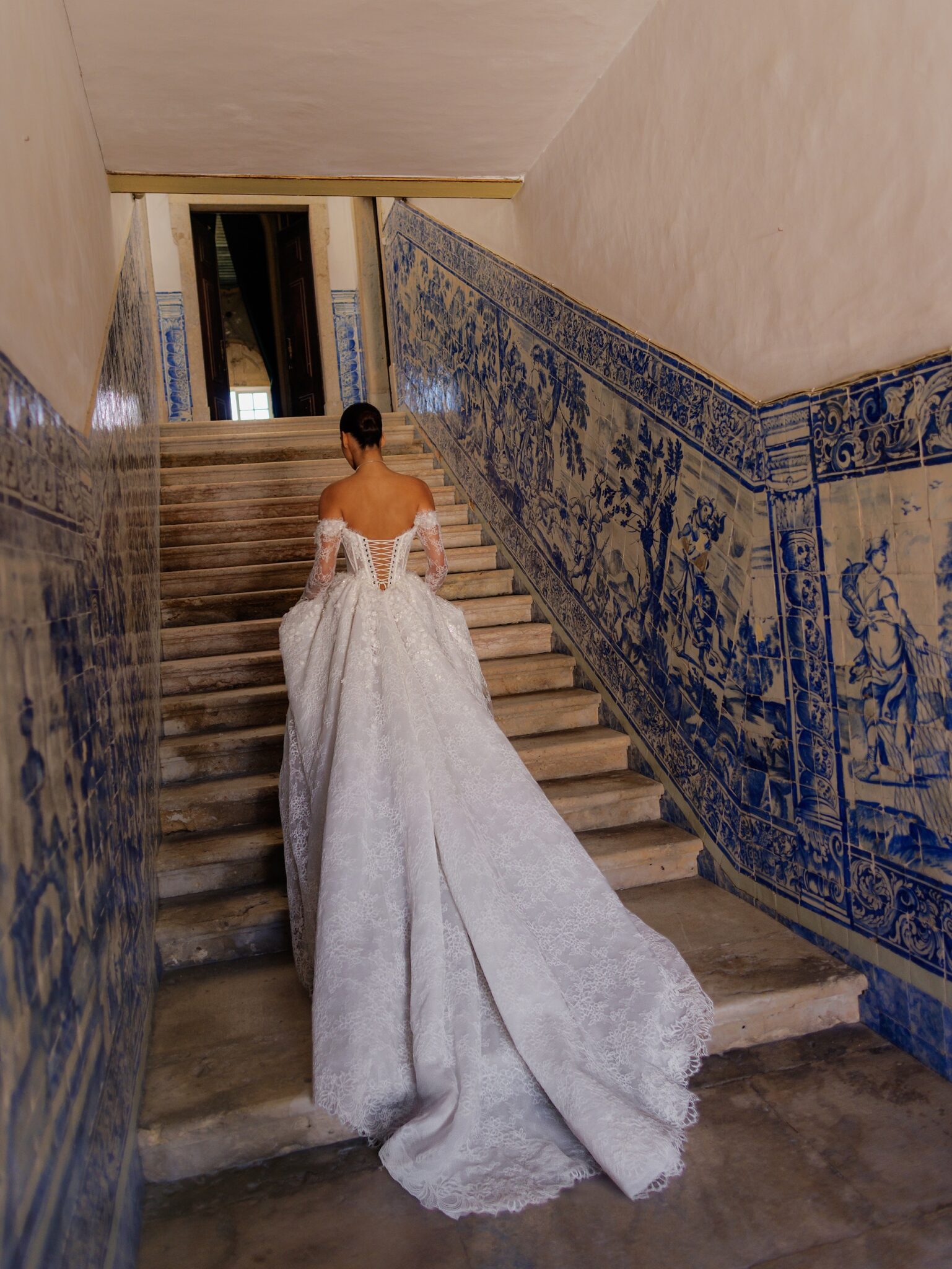 The corset features a lace-up back, ensuring a perfect fit, while the gown is completed with an elegant, flowing train for a truly regal look.