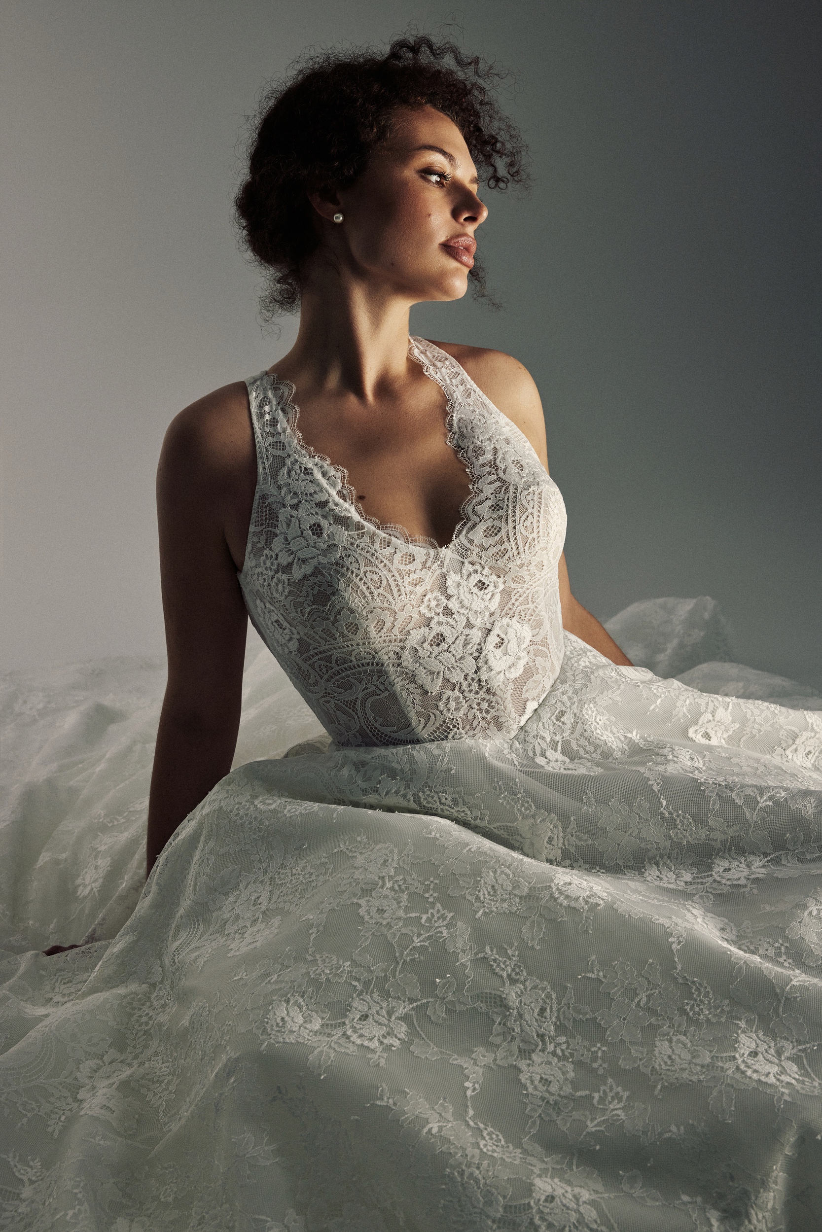 Blooming LoveMara is a romantic and elegant gown crafted in a floral Chantilly lace A-line silhouette that feels light, feminine, and timeless. A flattering V-neckline with delicate straps frames the bodice, highlighting an accentuated Basque waist, while the open back—where the straps extend and meet—adds softness and allure, finished with a sweeping cathedral-length train for a truly graceful statement.