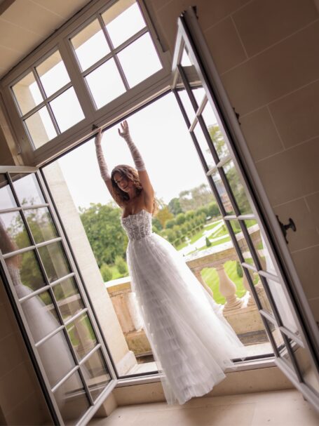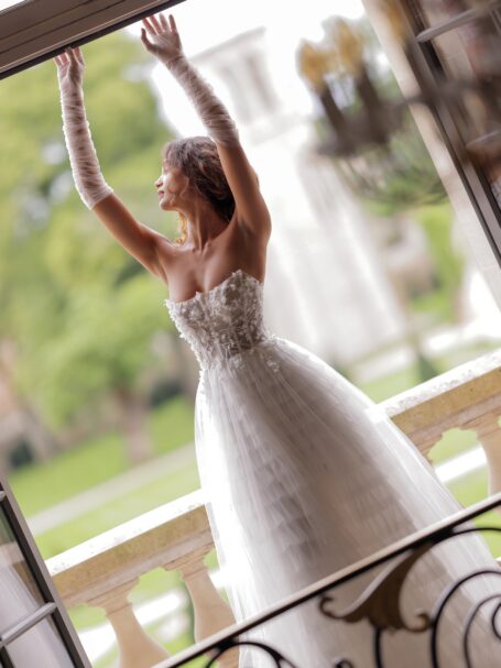 White SwanExquisite gown with a plunging neckline and defined waist. The lightweight bouffant sleeves balance the volume of the semi-sheer skirt also featuring a full-length slit on the left side.