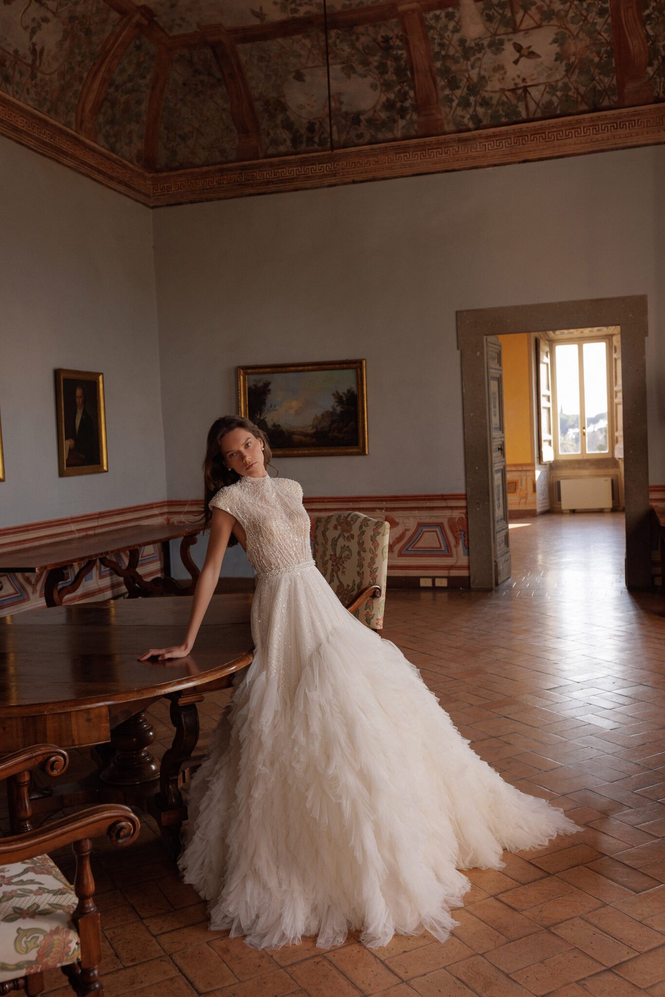 L'UnicoTotally beaded top with high neckline and all-ruched voluminous skirt.