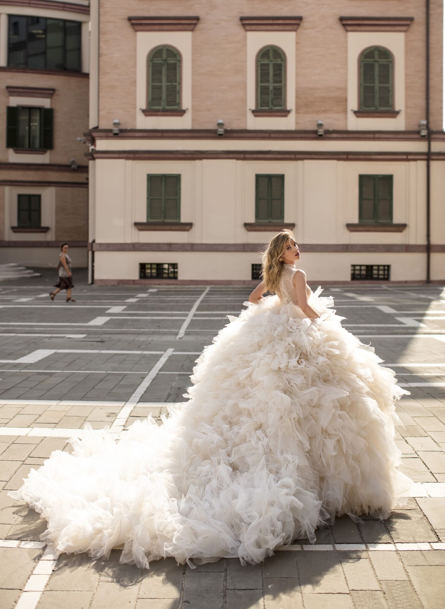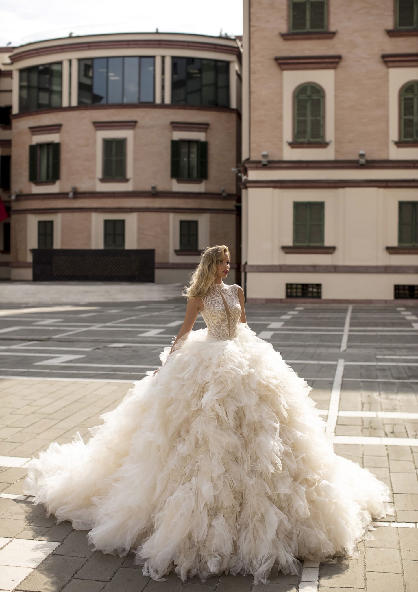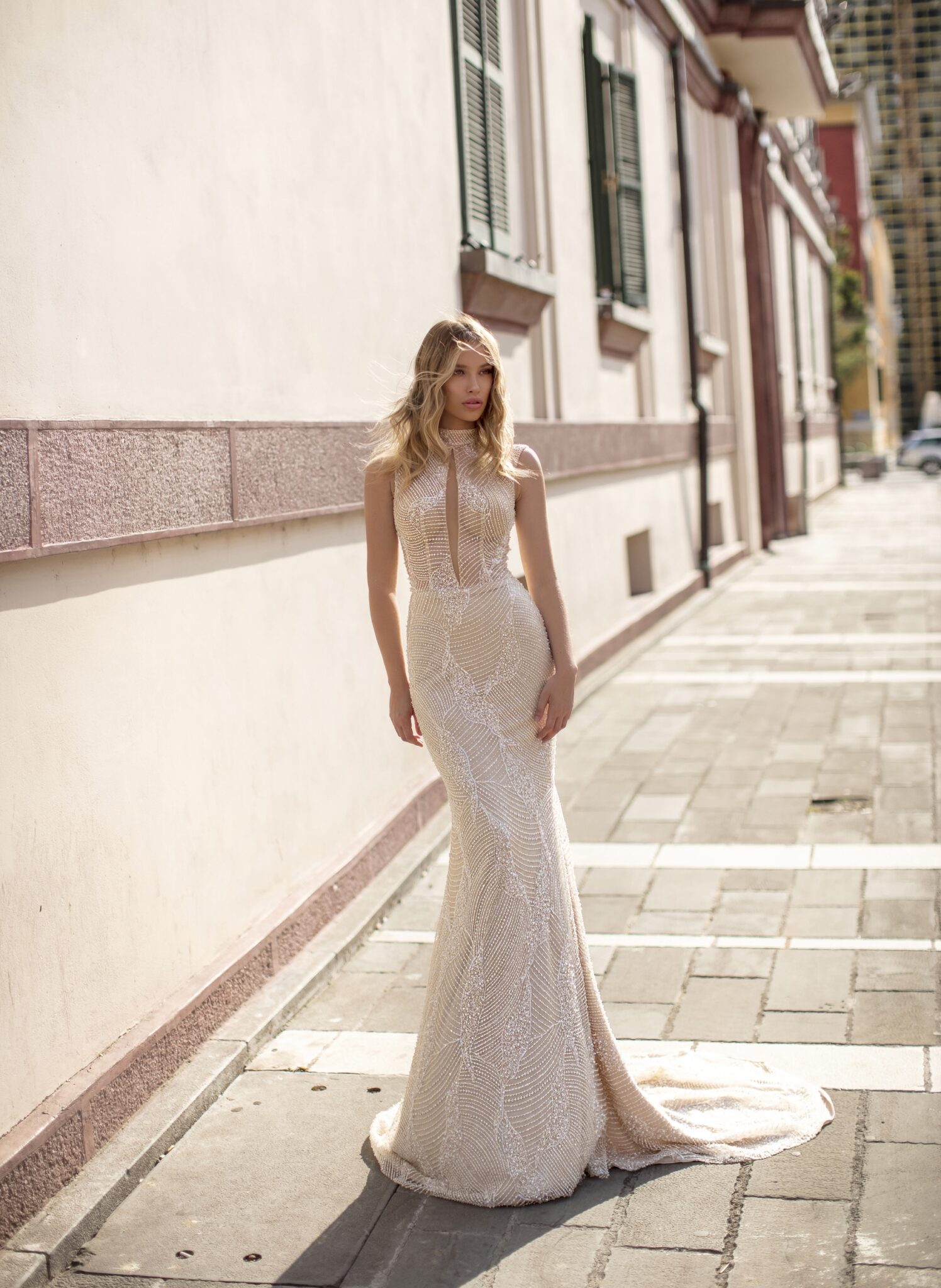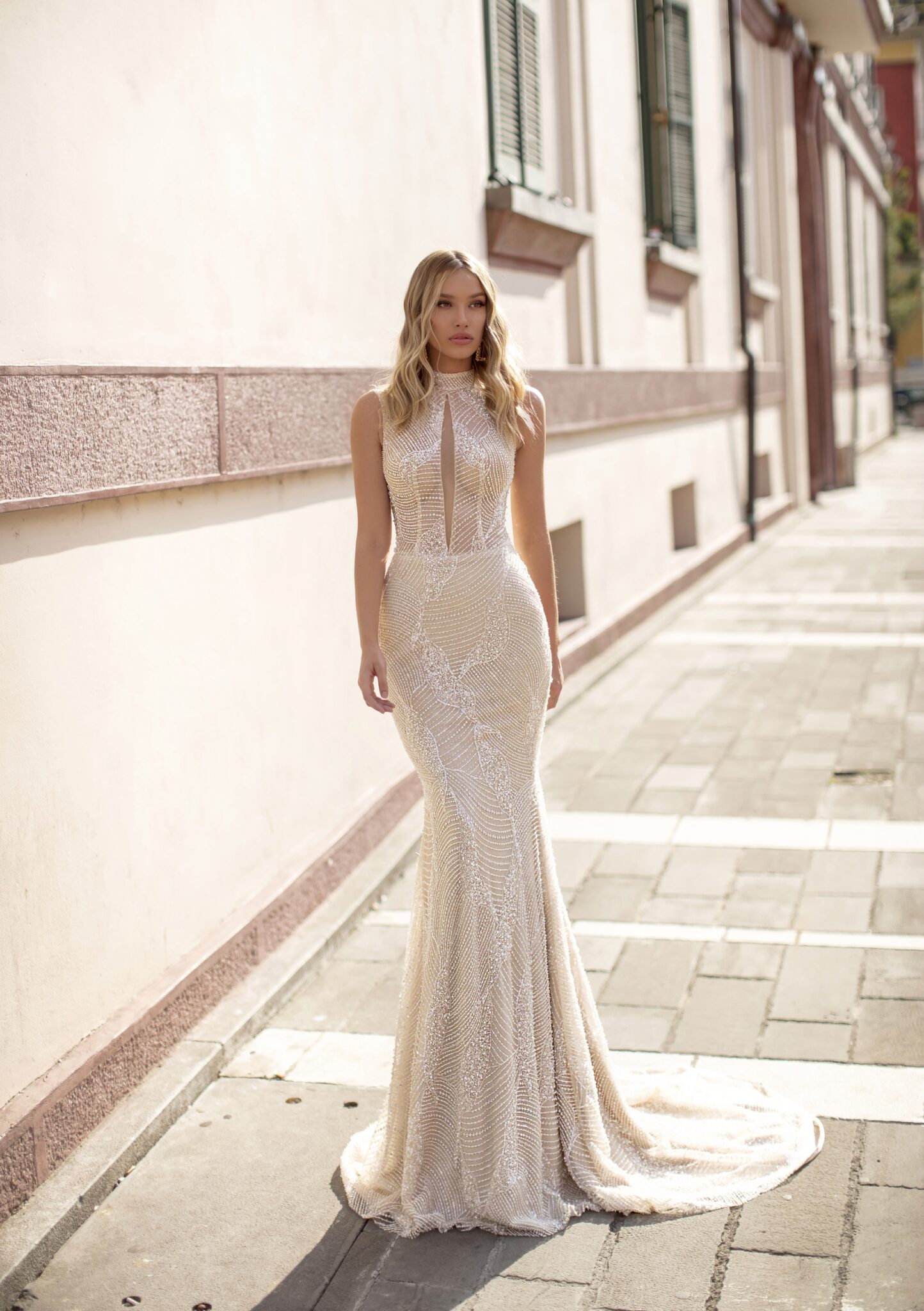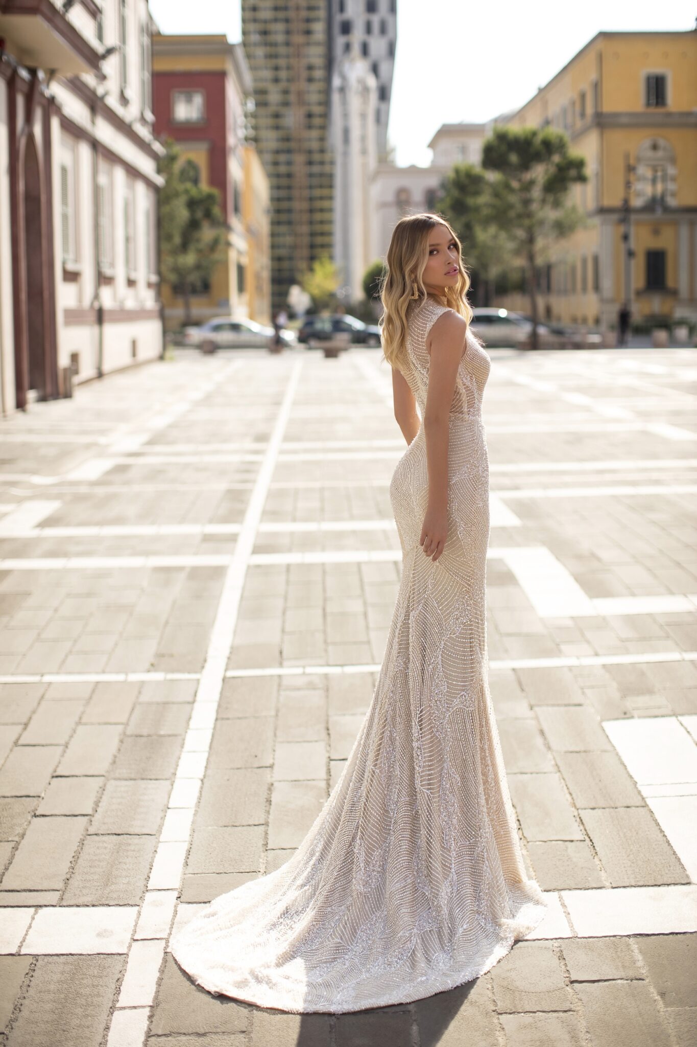 AuroraMelissa bridal gown consists of two elements. A sheath dress is made of beige high-quality fabric and decorated with sparkling beads and crystals. The snazzy neckline deserves special attention. The flamboyant skirt is characterized by veiling abundance. By using this skirt you get a loose and kingly outfit.