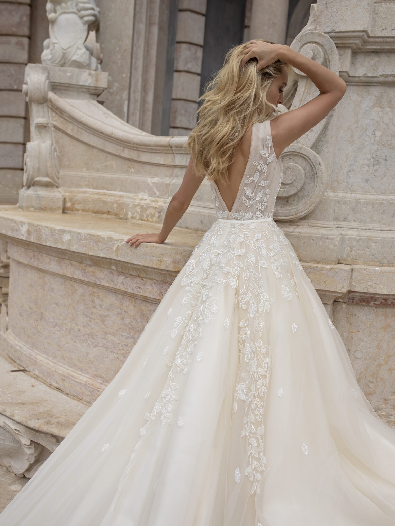 Lisbon VibesA-line Melody bridal gown is a classical wedding dress. A corsage is made of veiling and lace. Lace leaves that are decorated with beads are also found on the skirt. The skirt itself is made of many layers of veiling. V-shaped low neck and deep neckline at the back of the dress make it more feminine. A fabulous tail adds solemnity and a thin belt accentuates a waistline.