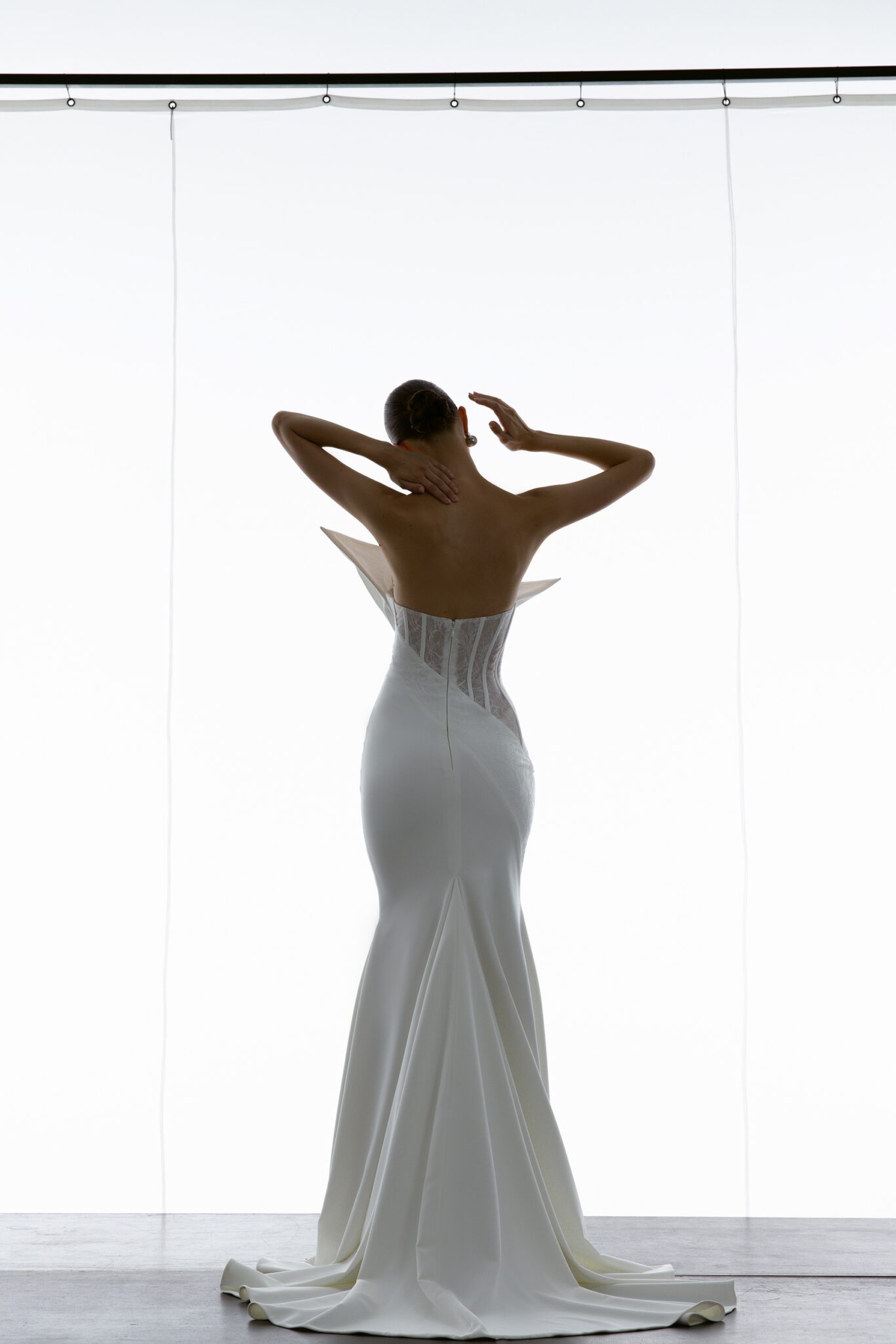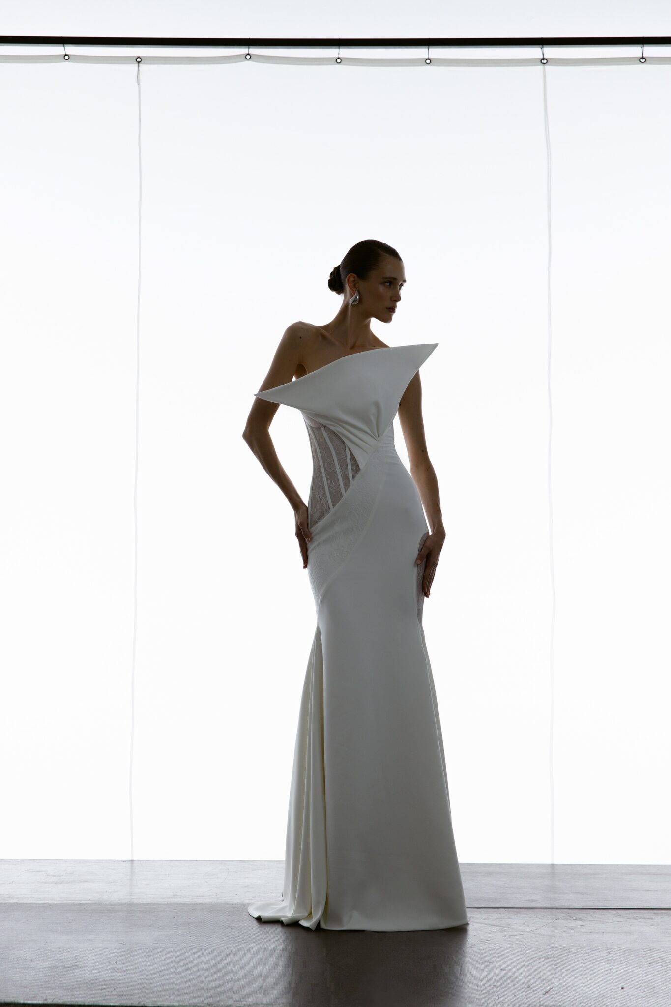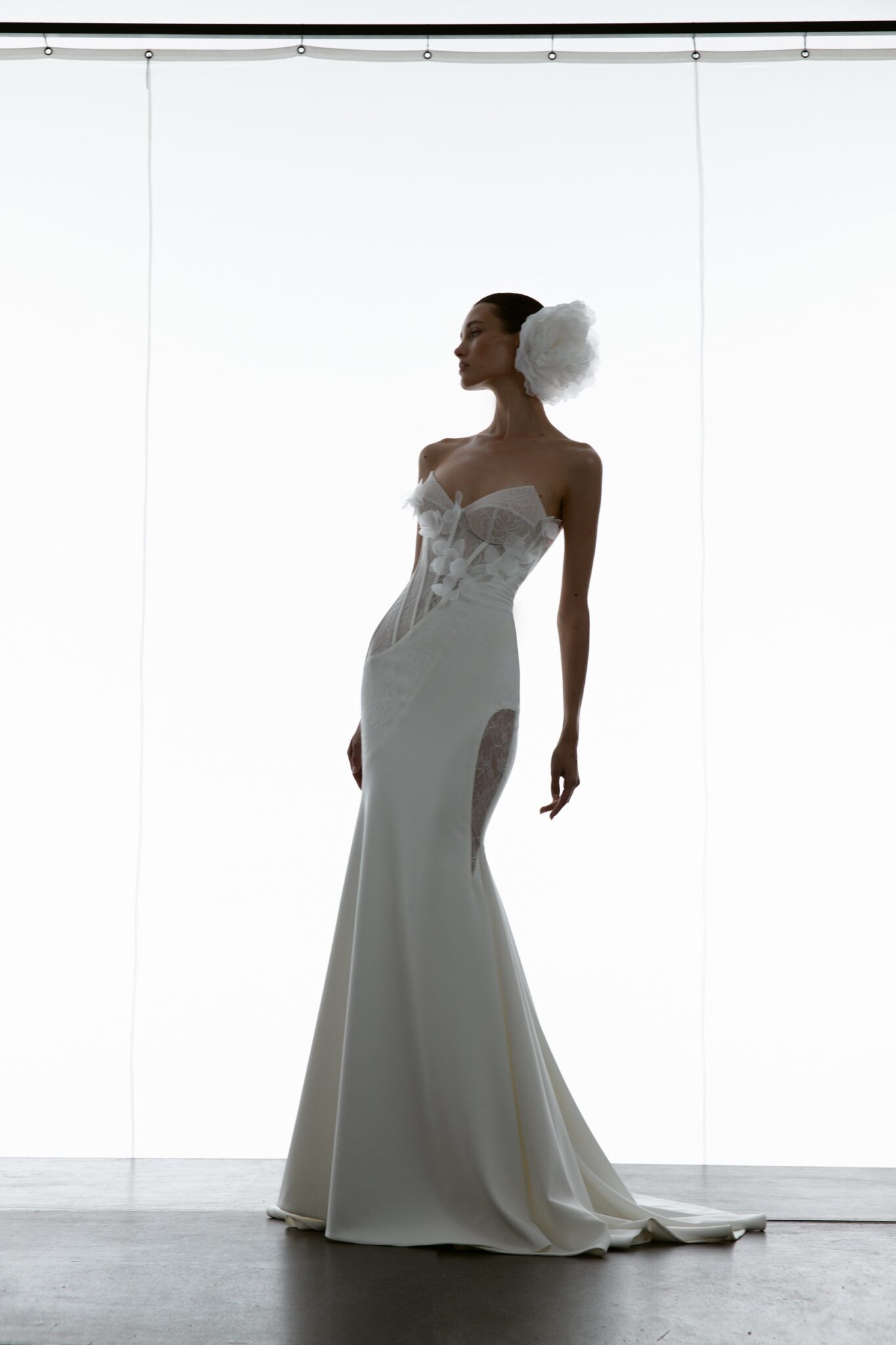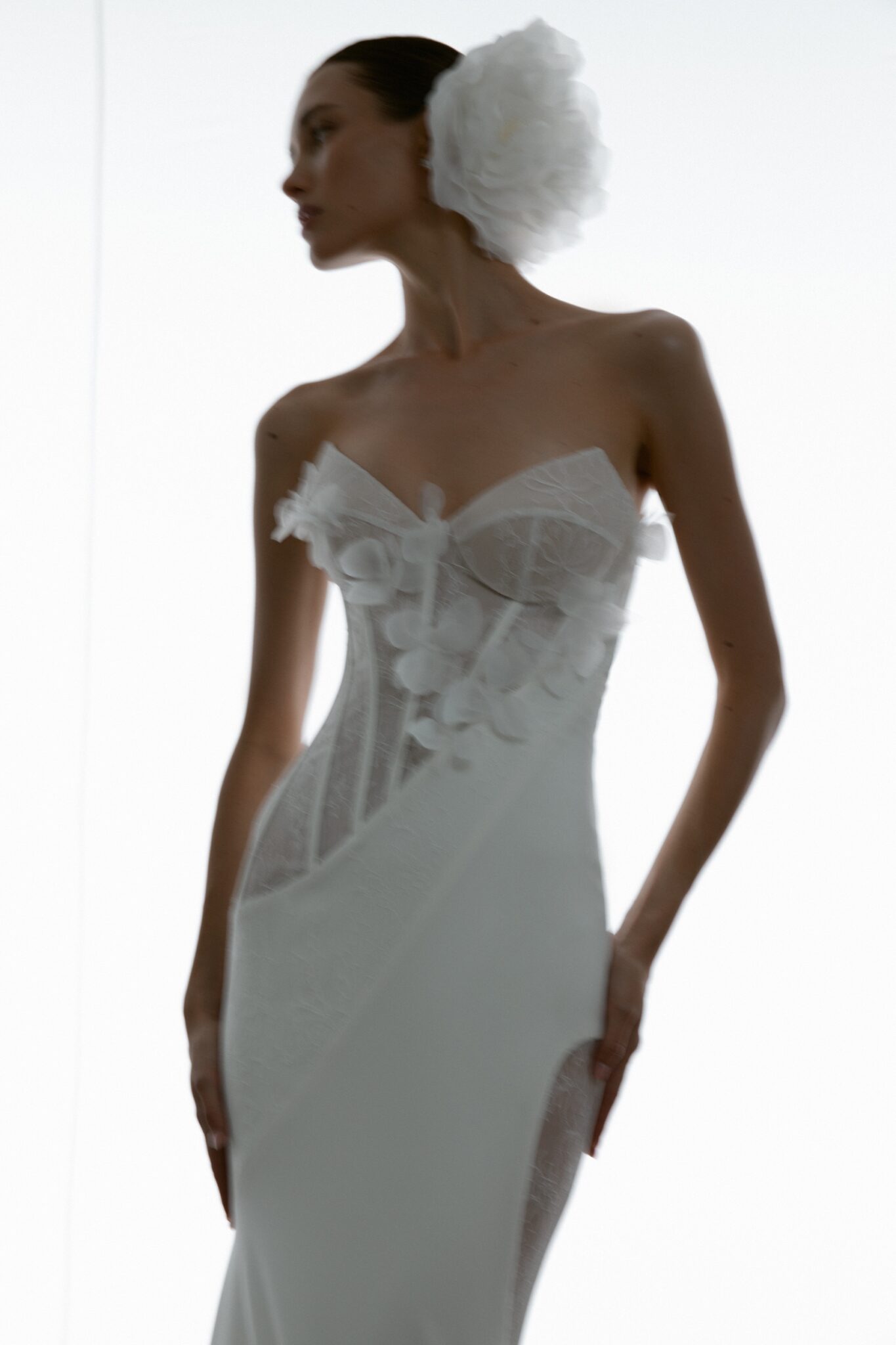 Special EditionA glamorous mermaid gown with a firm corset bodice and a heart-shaped neckline. The dynamic diagonal lines add fluidity to the silhouette, while daring details like a cut-out hip covered with embroidered sheer fabric enhance the bold, romantic appeal.
