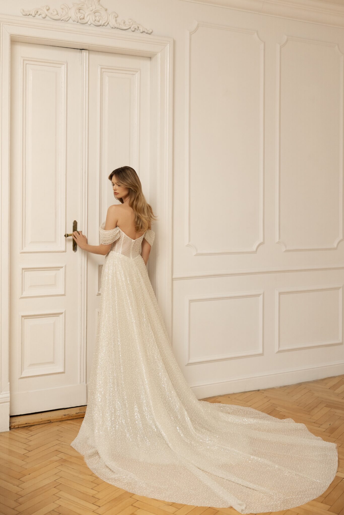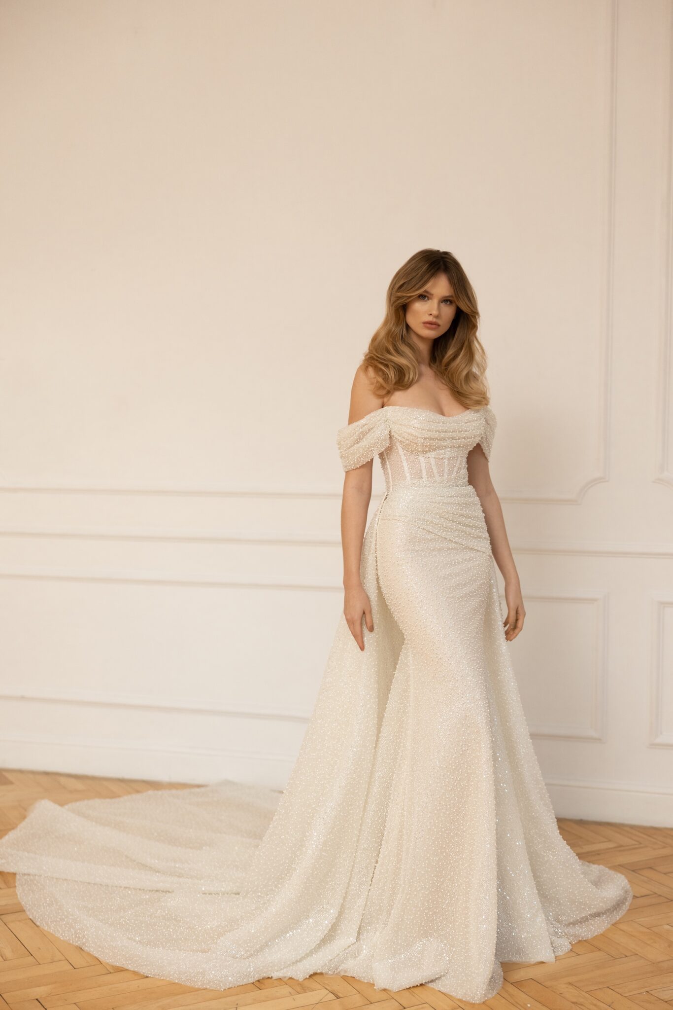 Less is more 2023, Sample SaleBreathtaking Miata gown feels Straight off the red carpet. Tailored in intricate lace with transparent sequins, Ivory beading and small pearls, the dress mesmerizes at first glance. The highlight of the style is its deep Straight neckline with off-the-shoulder straps that expose boning. Yet the balanced look is maintained due to the amazing fitted skirt with draping under the waistline and majectic long train overskirt made of the same beaded lace