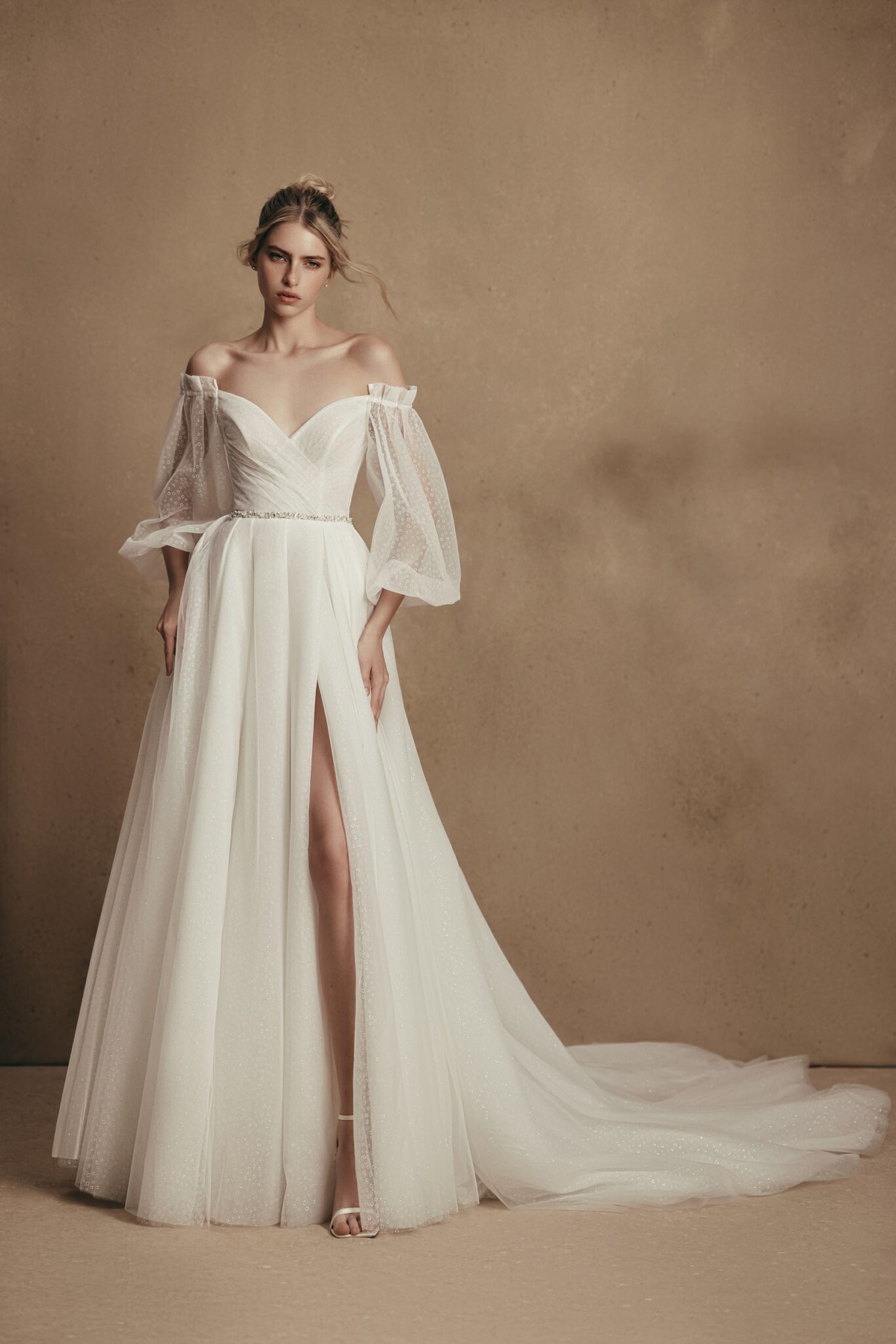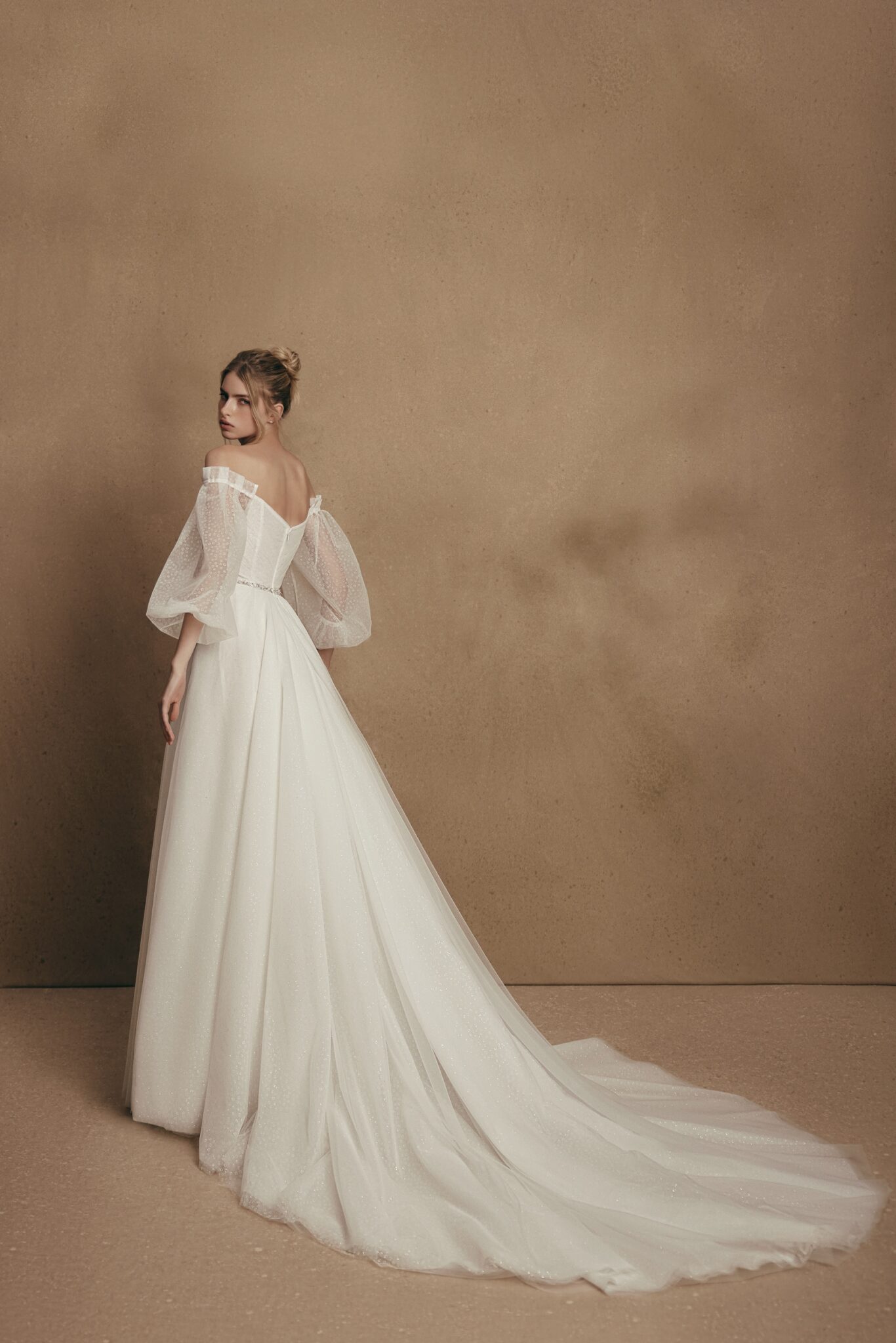 PersonalityMillie is a bridal dress for a royal wedding. The bodice features a lowered shoulders neckline with illusion bell sleeves and an uncovered back looks fabulous. The skirt is made of many layers of veiling that look fantastic with a long train.