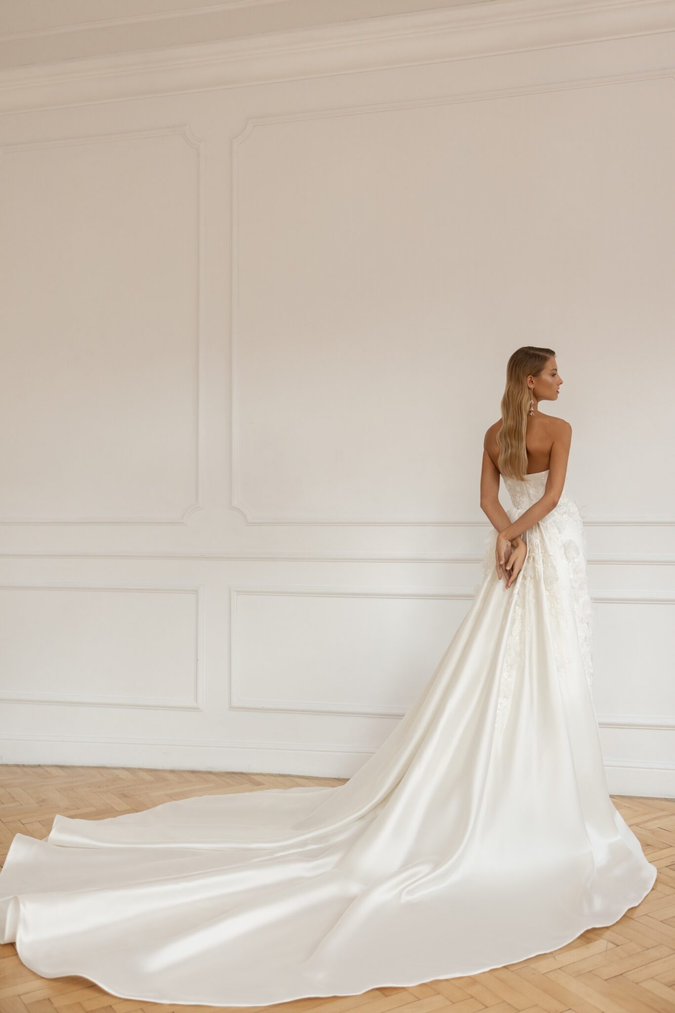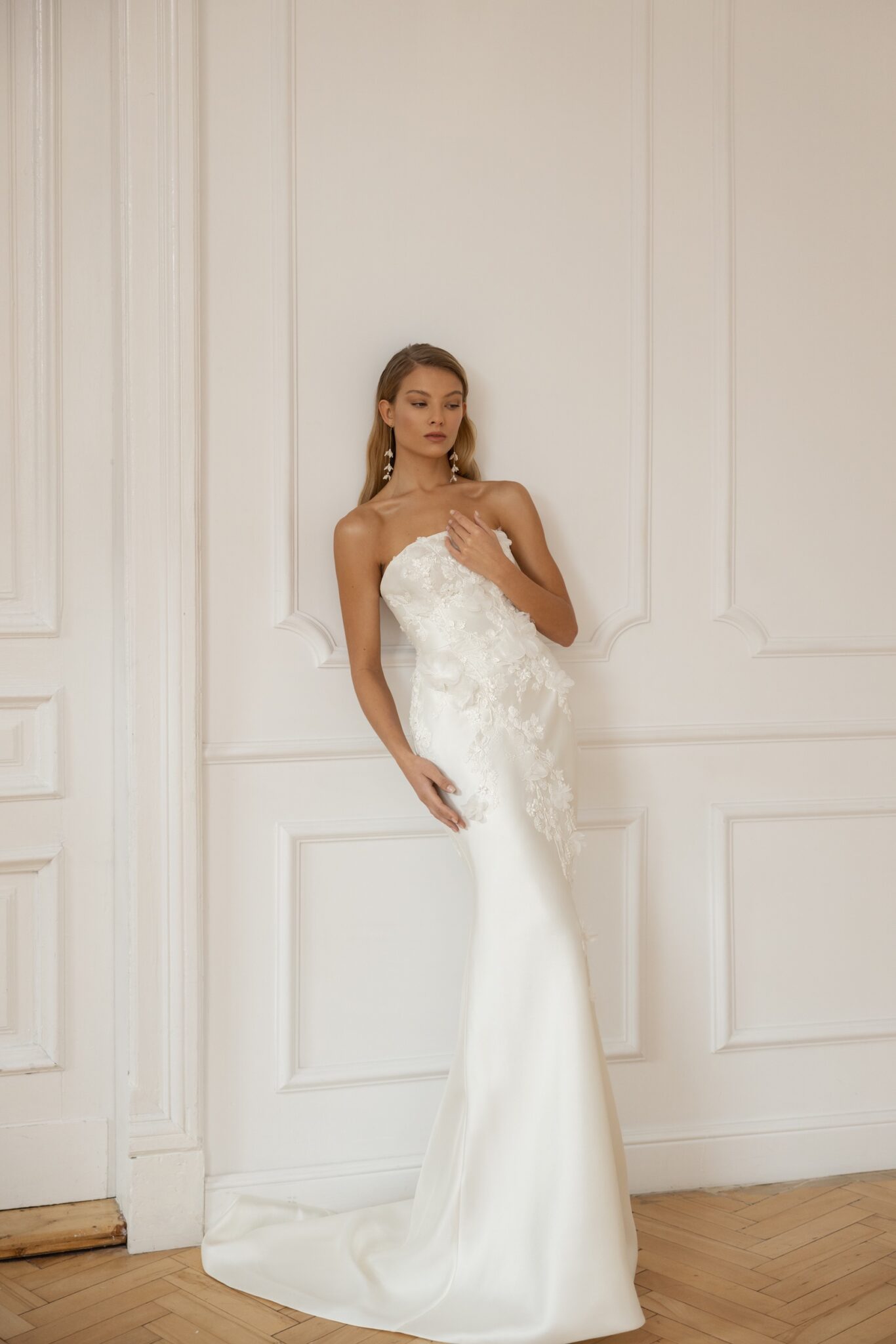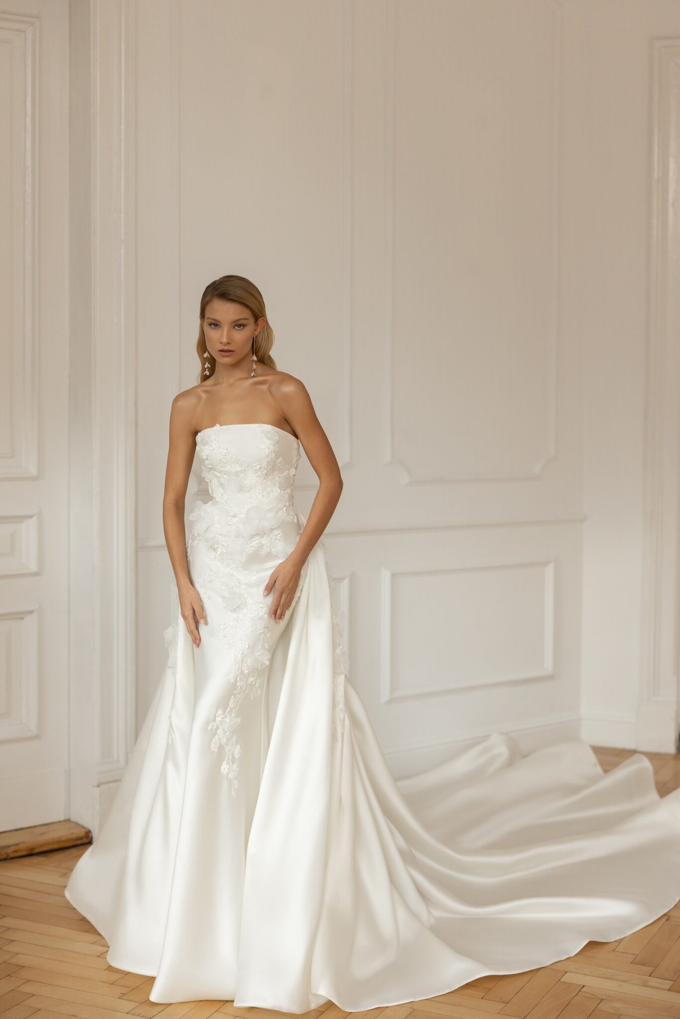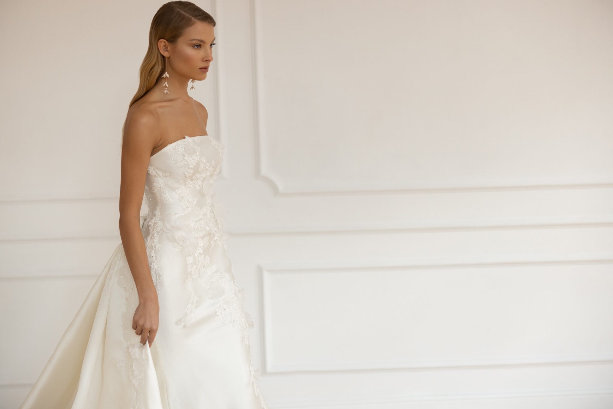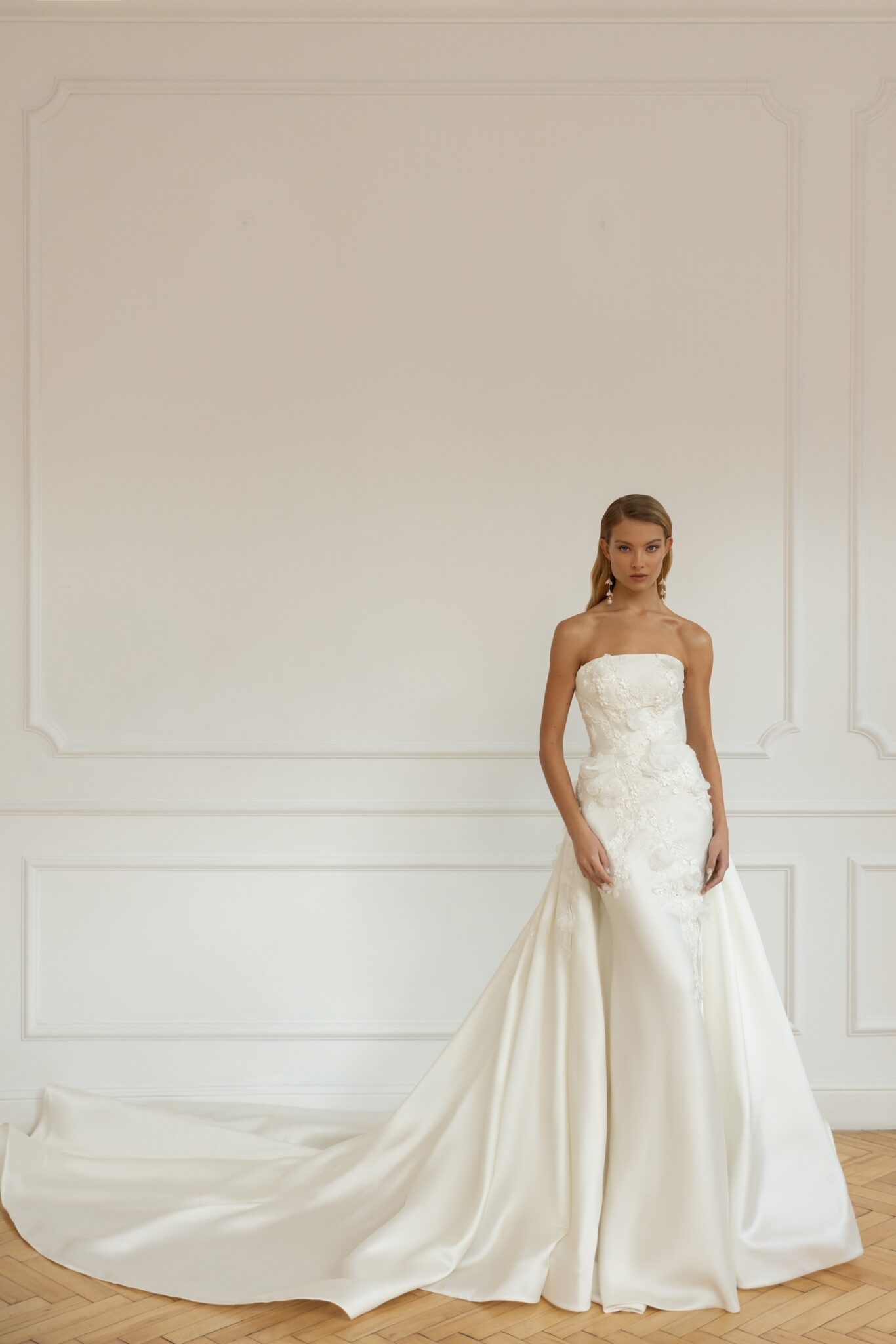 Less is more 2023The Minelli bridal gown is a masterpiece in form and fit. Cut in our signature Mikado, it accentuates the curves of the female body, with minimalist embroidered lace and 3D organza flowers that pass from the bodice through the hips along a flare skirt. A strapless bodice with gently curved Straight neckline features an open back. Accessorized with a dramatic voluminous overskirt, Minelli takes on extra volume for a grand down-the-aisle entrance