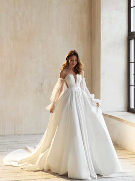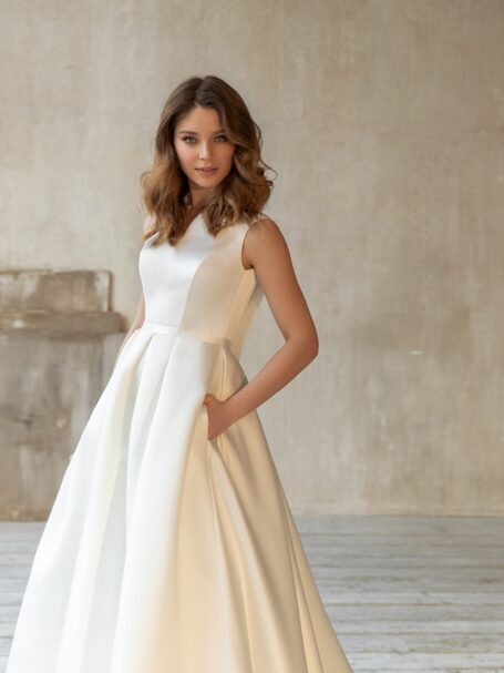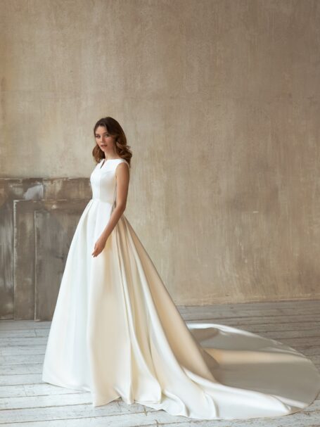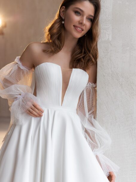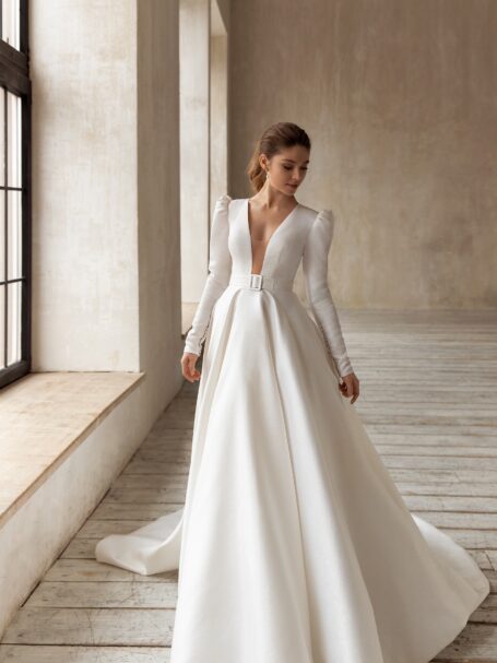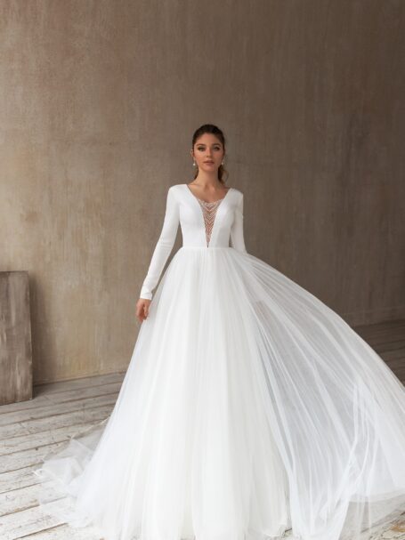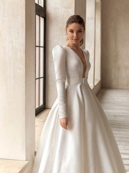 Less is more 2021Miranda ball wedding gown looks truly magnificent. Loose dress with a sweetheart neckline is decorated with transparent fabric that is embroidered with a pattern of beads, spangles, and crystals. The back of the wedding dress is embellished with a deep neckline. 3/4 length sleeves and a belt add solemnity. A fantastic skirt that is made of glossy fabric passes into a gorgeous train.