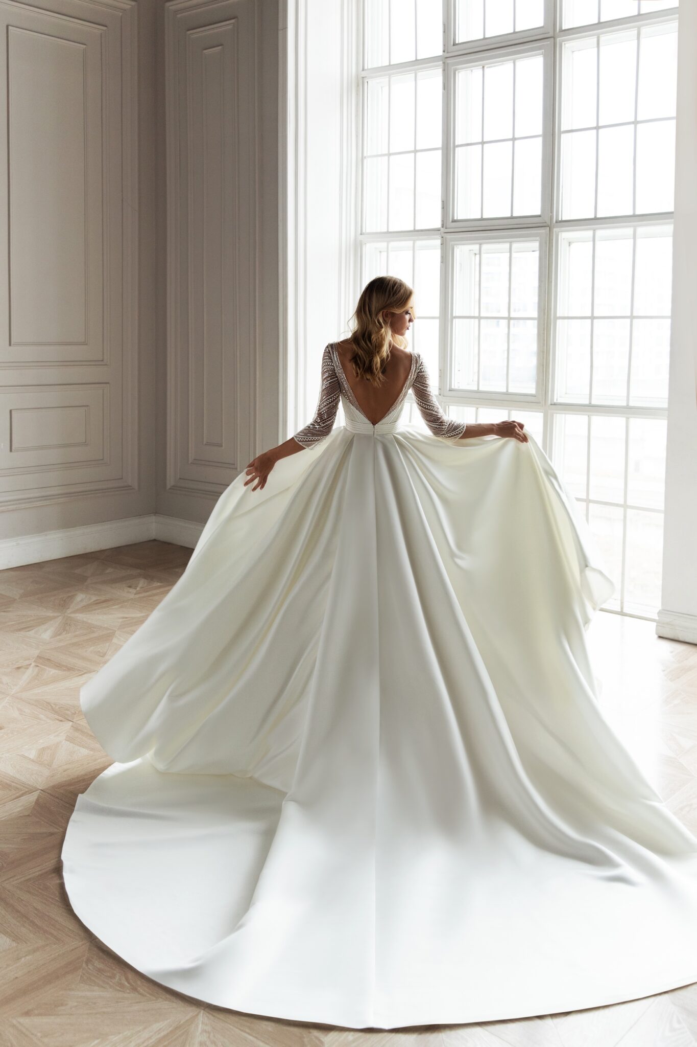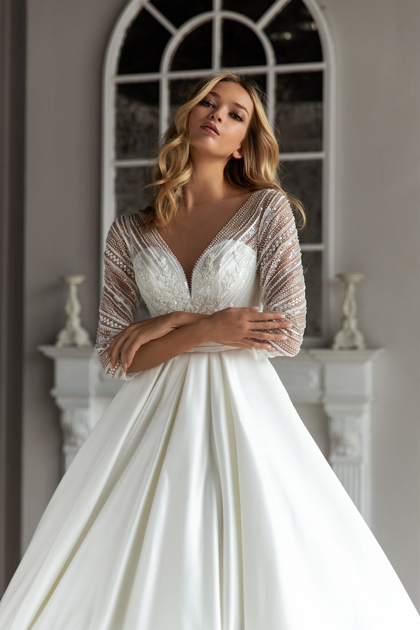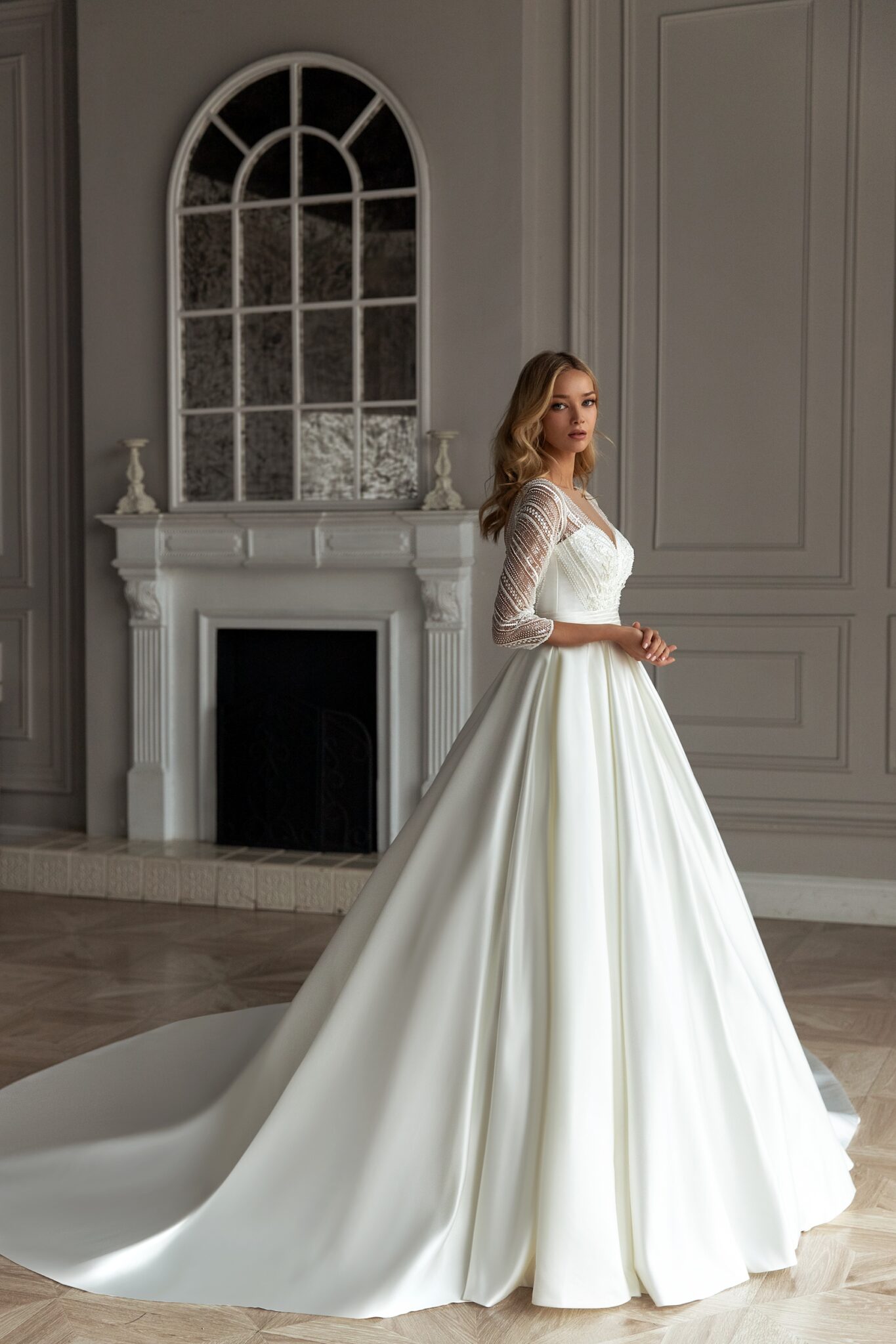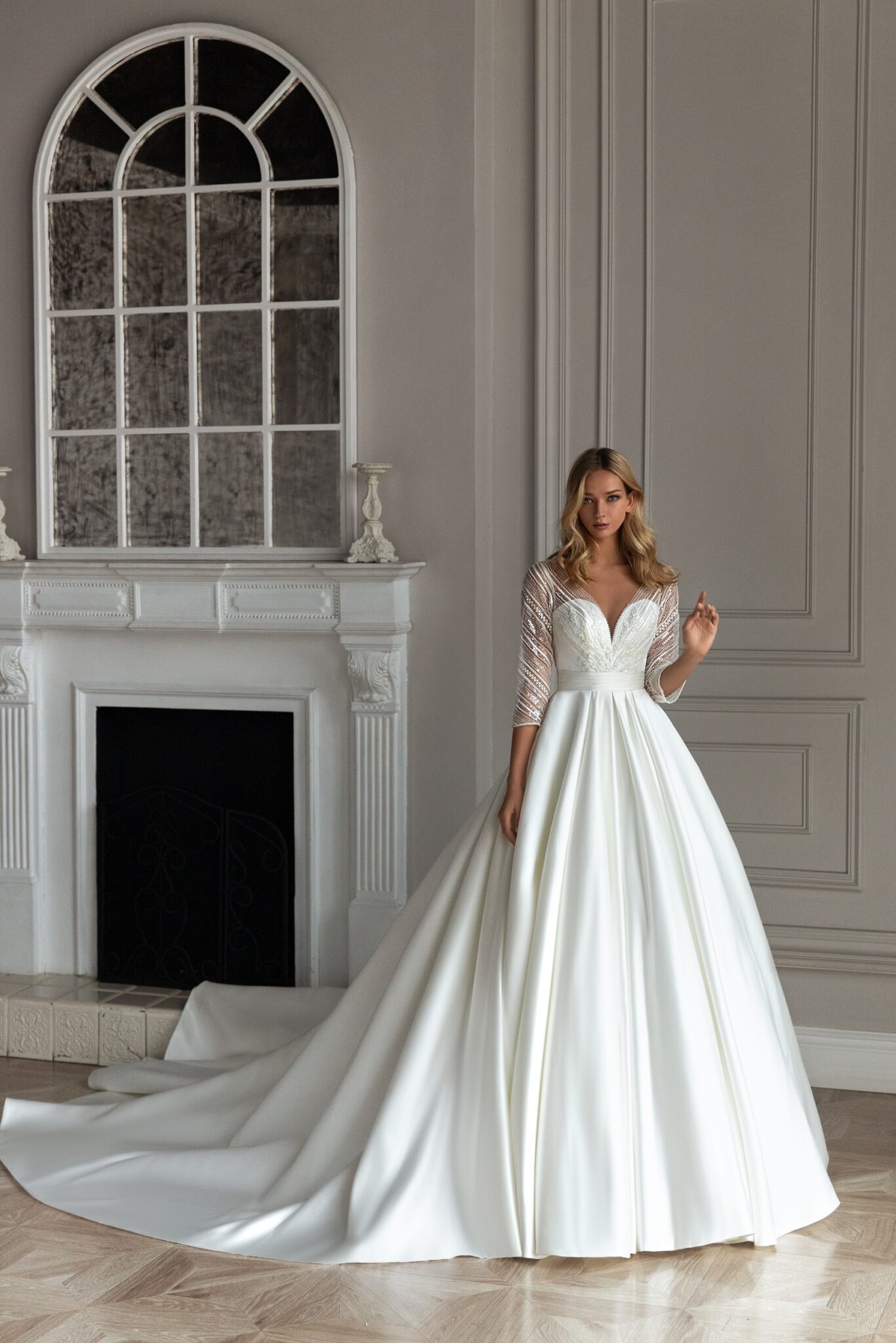 Less is more 2021Miranda ball wedding gown looks truly magnificent. Loose dress with a sweetheart neckline is decorated with transparent fabric that is embroidered with a pattern of beads, spangles, and crystals. The back of the wedding dress is embellished with a deep neckline. 3/4 length sleeves and a belt add solemnity. A fantastic skirt that is made of glossy fabric passes into a gorgeous train.