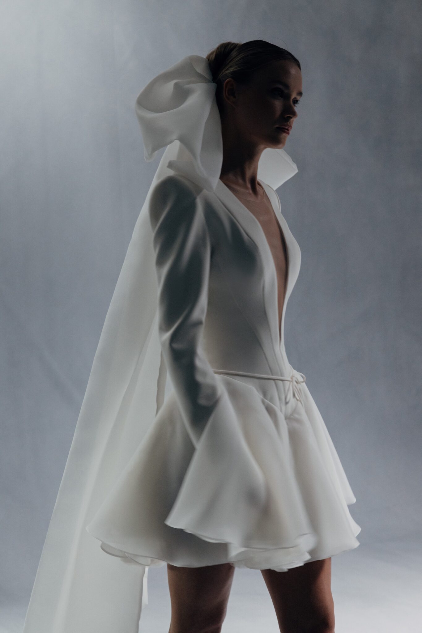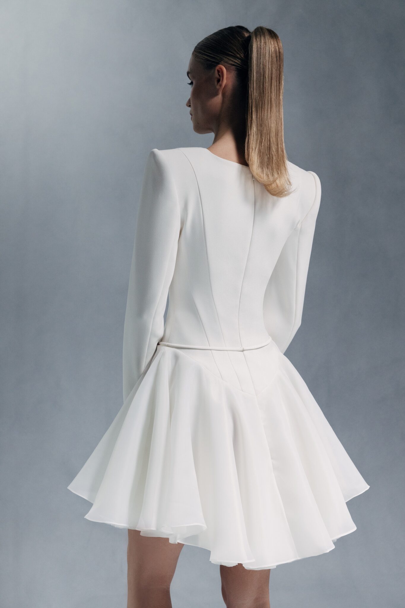 Special EditionA modern mini-dress with striking silhouette, sharp shoulder-line and flared long sleeves. It also features a deep plunge neckline and basque waist, while the flared skirt adds playfulness and lightness to the look.