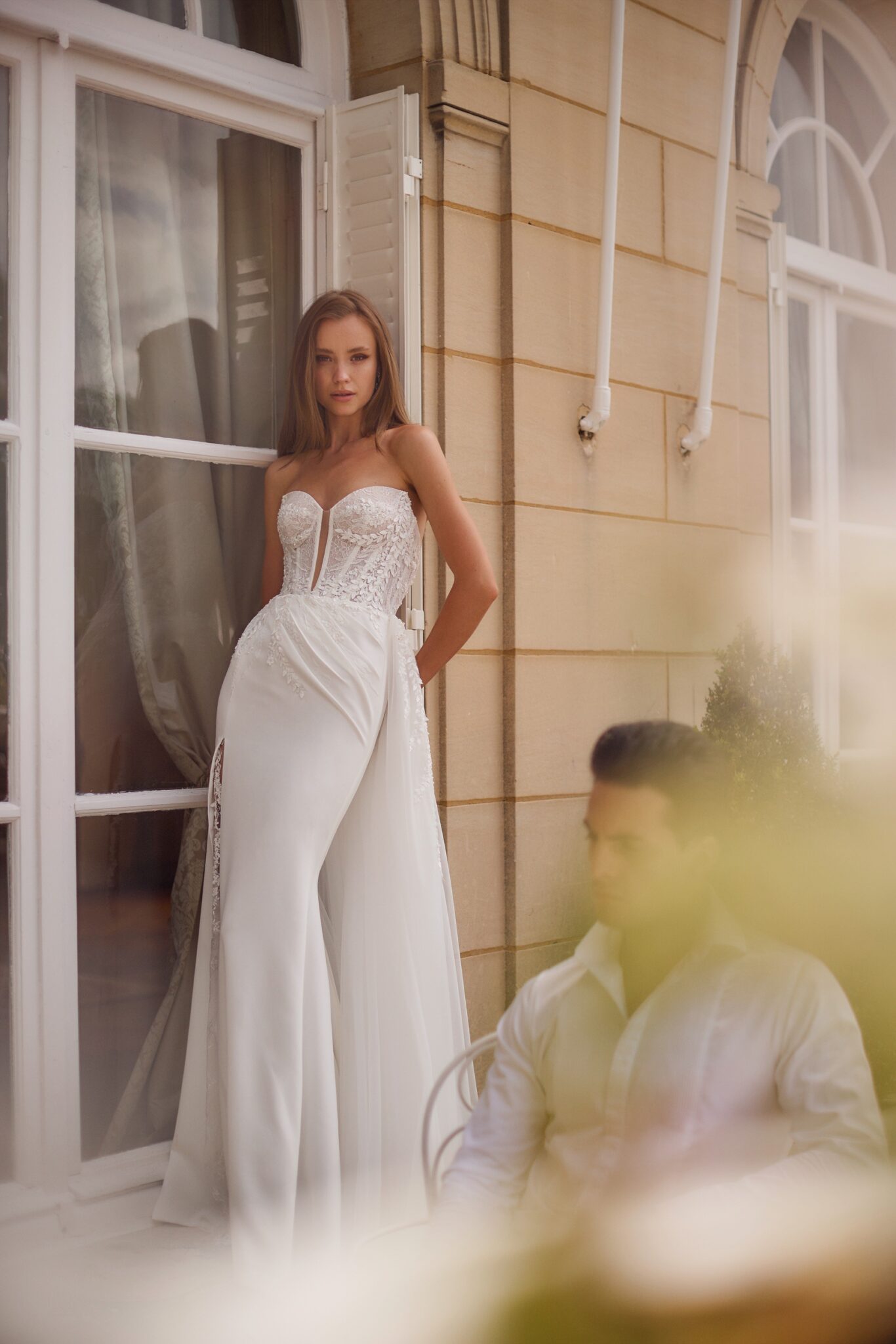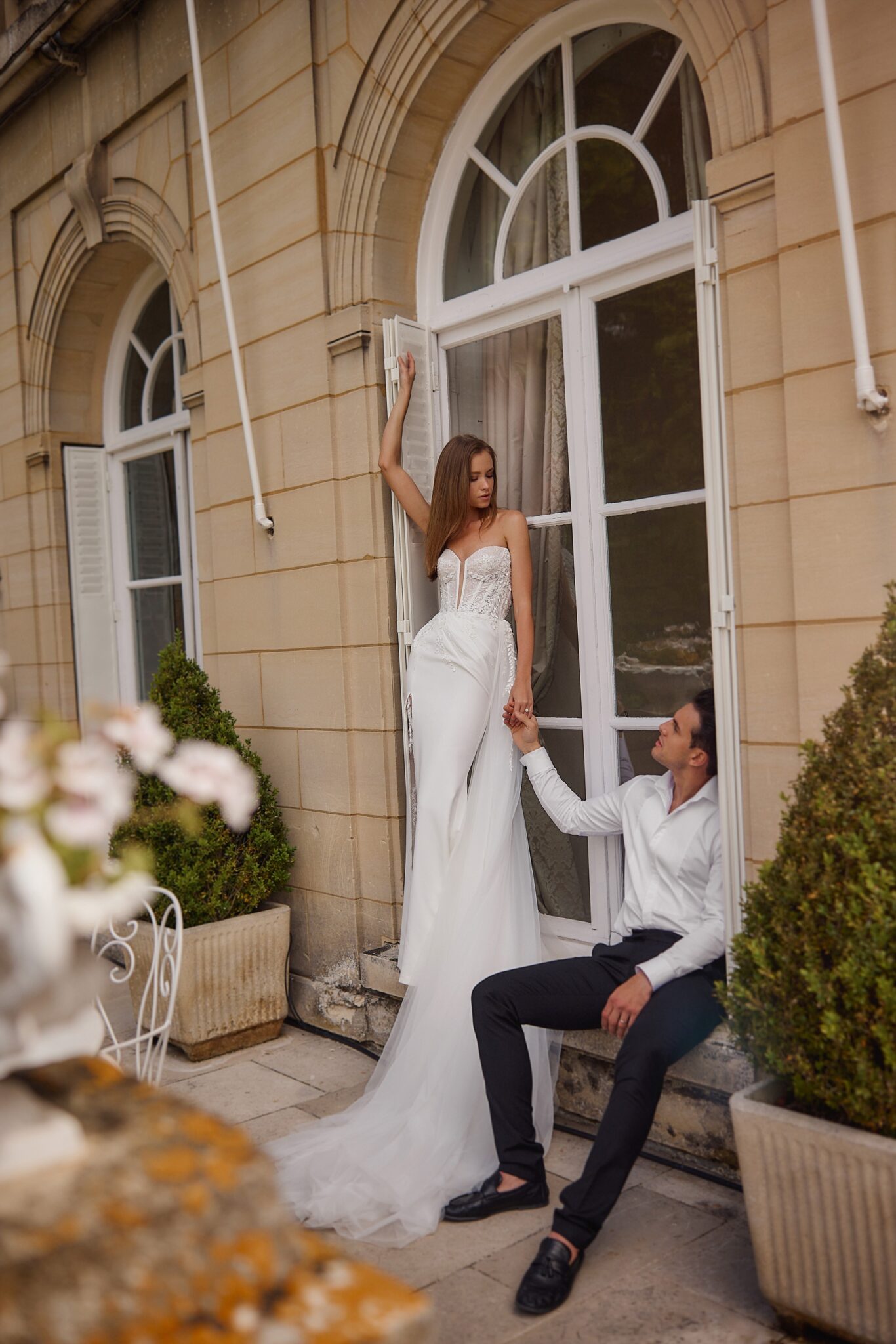 Love StoryHeart-shaped neckline dress with lace-up back and translucent midline on the top. The asymmetric diagonal shirring on the left hip and full split on the right side of the skirt add a dynamic touch. The dress features sophisticated embroidery of tiny leaves and flowers and is complemented by a translucent floral embroidered underskirt and an upper skirt of light voluminous tulle fabric, contributing to the amount of handwork by an additional leaves-and-flowers waist outlining.