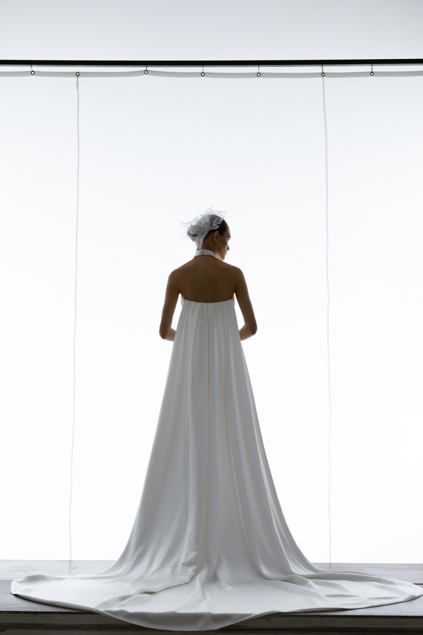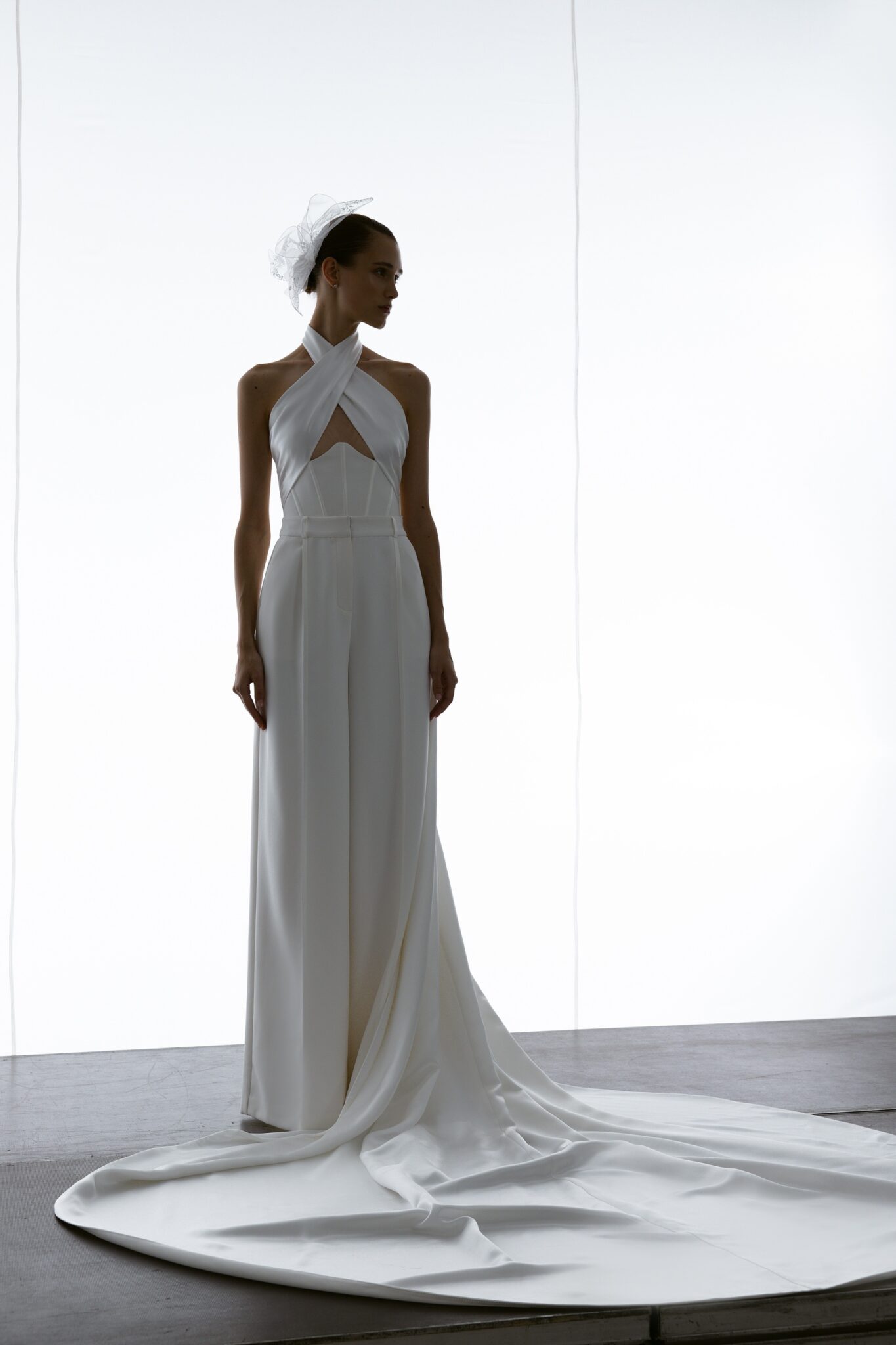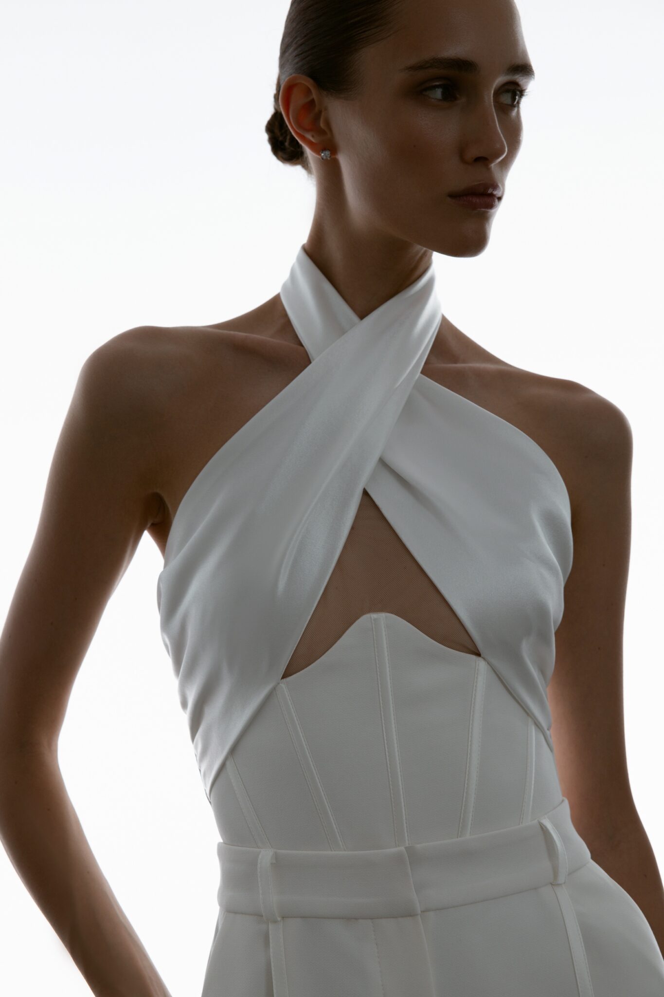 Special EditionA sleek, minimalist jumpsuit with a striking halter neck cutout and an open-cup corset bodice. Wide-leg trousers evoke timeless elegance, while the overskirt brings a touch of femininity.