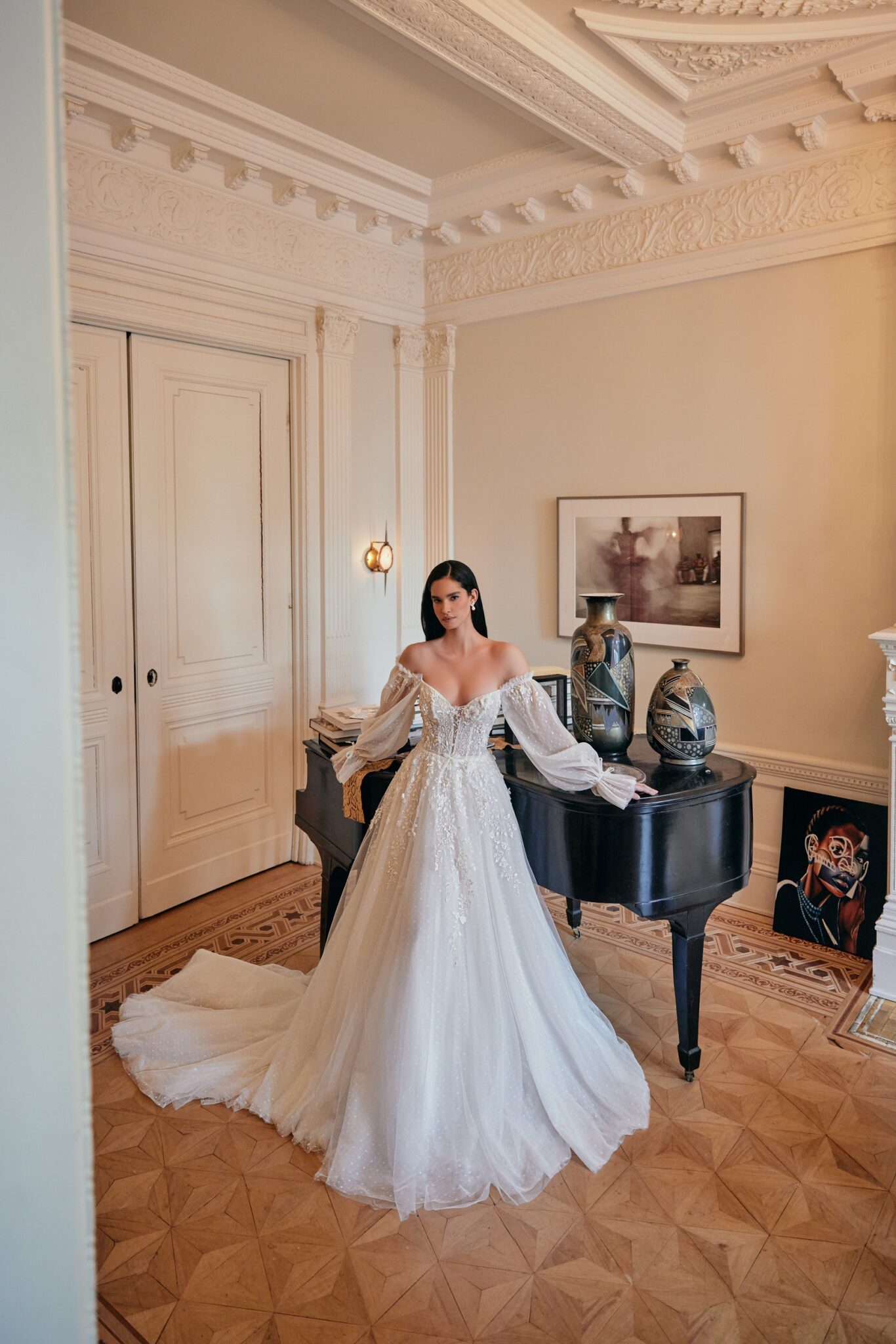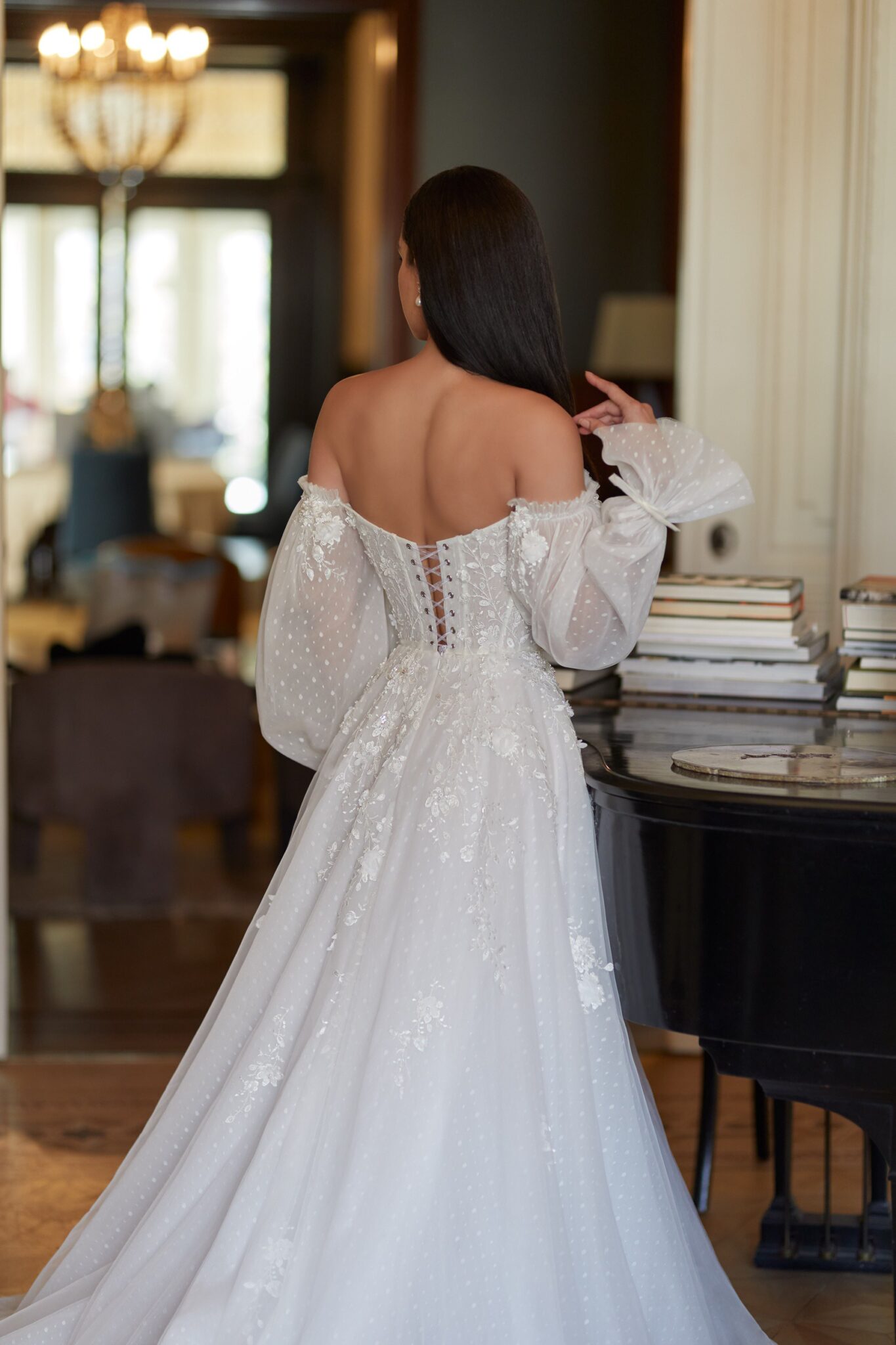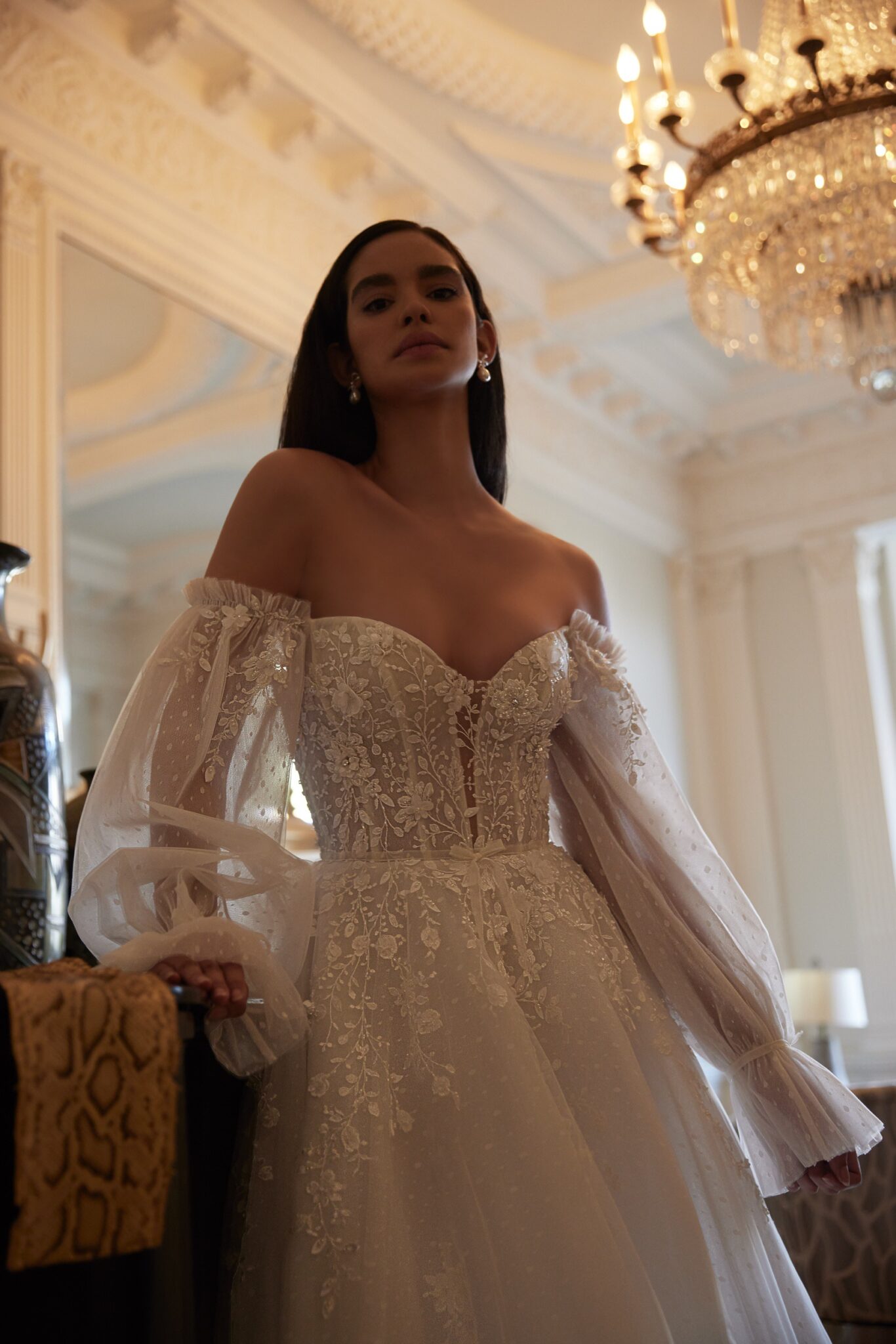 Love in the CityNadin ball gown reminds a wedding dress for a real princess. Strapless lace corsage with lowered shoulders is decorated with 3D lace with small flowers. Those flowers are found at the waistline and the skirt. Tender translucent long sleeves are embellished with veiling bows. The loose A-line skirt looks fantastic with numerous layers of Tulle. Veiling skirt is completed with fantastic train.