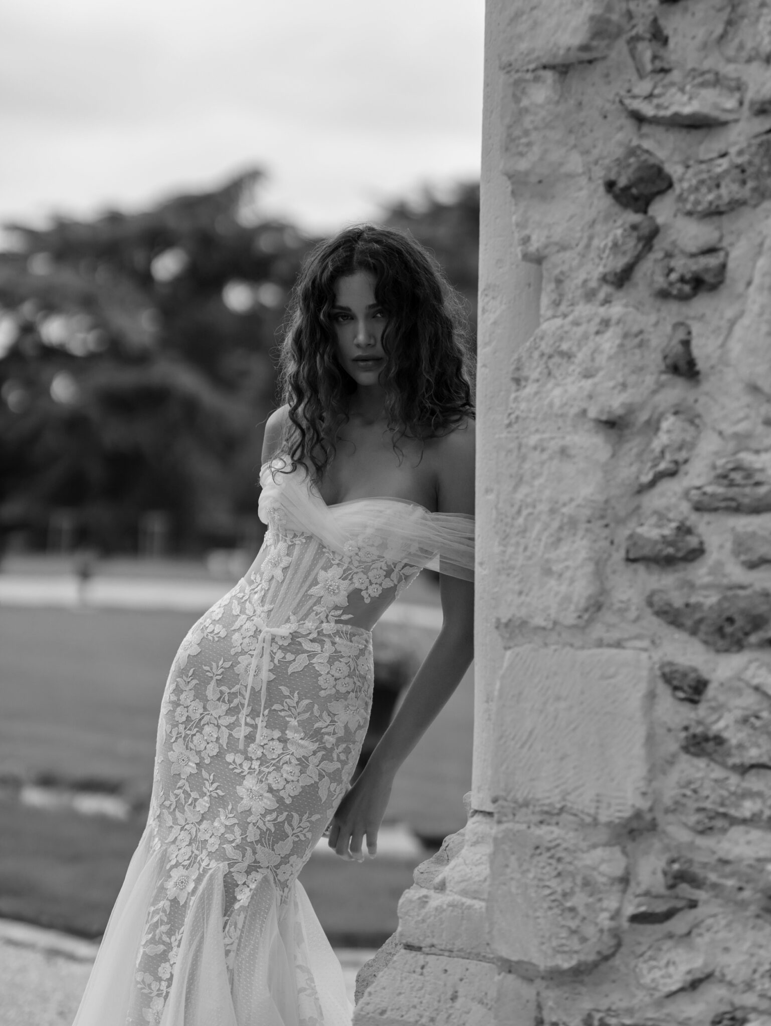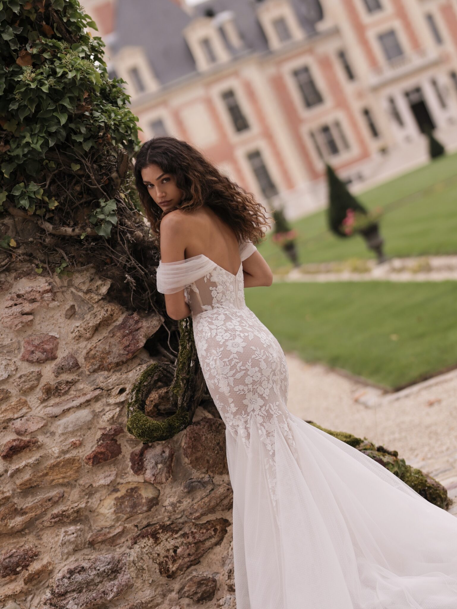 White SwanPlayful off-the-shoulders mermaid dress with an airy neckline and a fitted bodice flowing into a graceful skirt. The design combines a guipure base with matte floral accents and lightweight mesh to add volume.