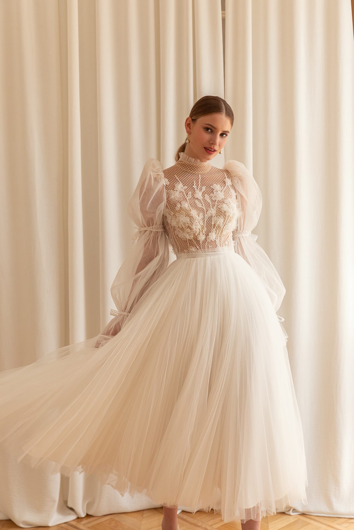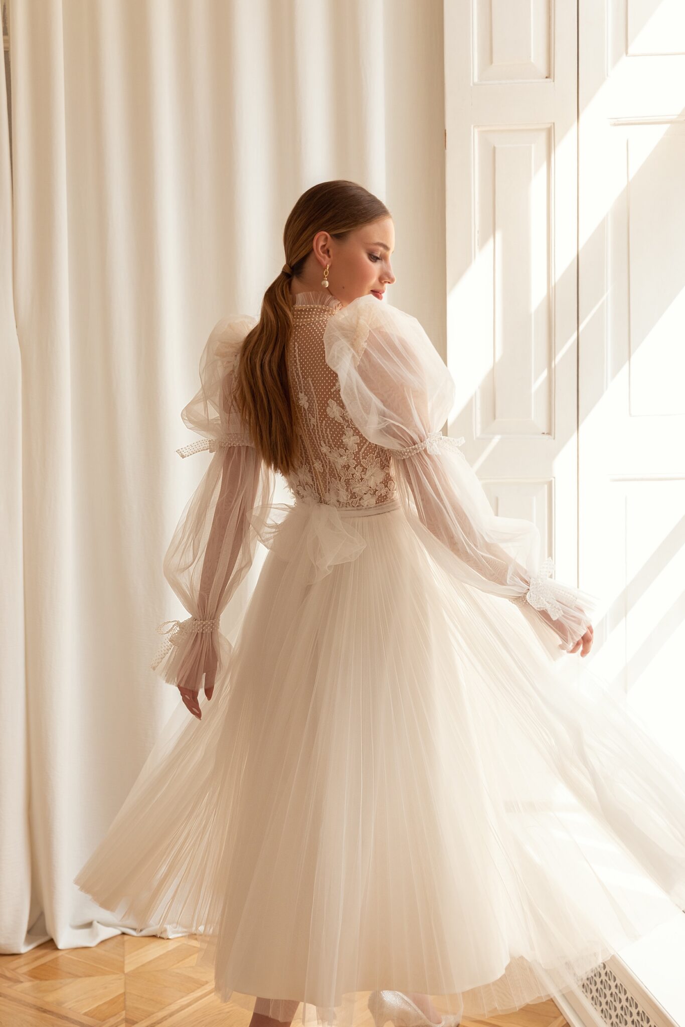 Less is more 2022Nana is a deligtful wedding gown of midi length. The corset has Closed decollete with high collar and is fully decorated with embroidered lace. The patterned Tulle with small polka-dots is decorated with 3D lace With flowers.The wedding dress is embellished with long volumetric sleeves made of semi-transparent Tulle. The skirt has midi length and is made of layers of weightless Tulle. The waist is accentuated with thin belt of the same fabric and is tied in the bow on the back of the dress.