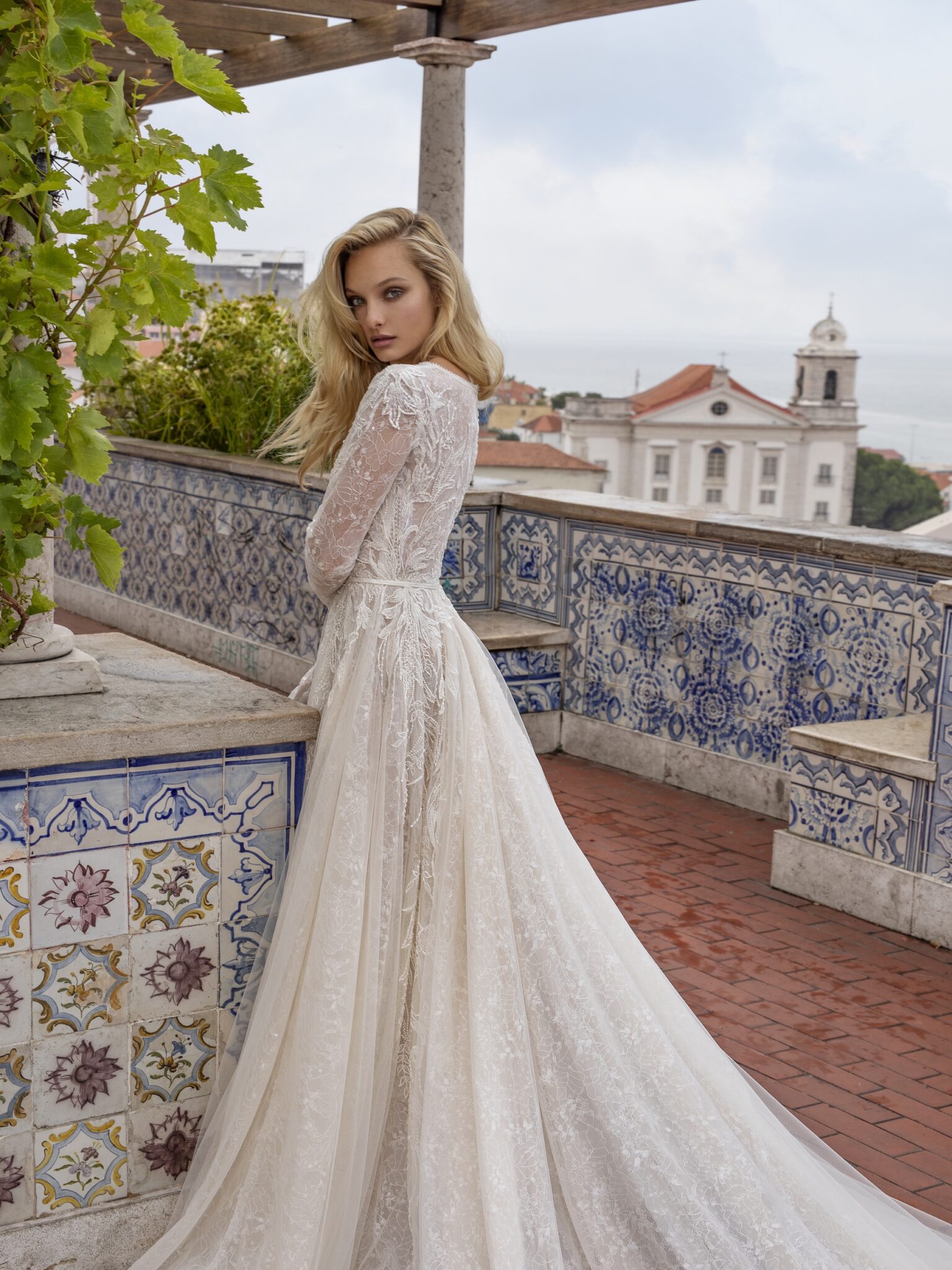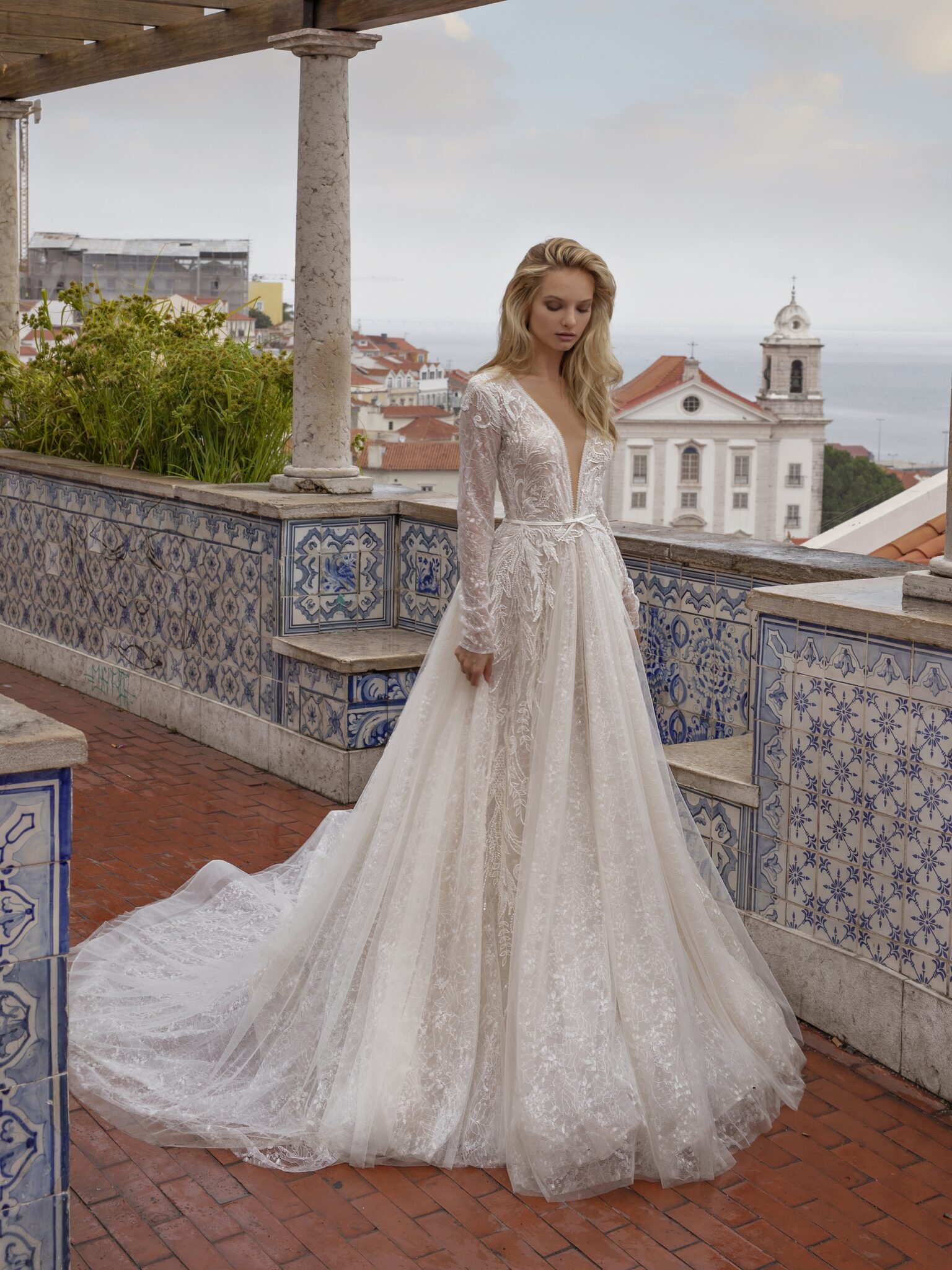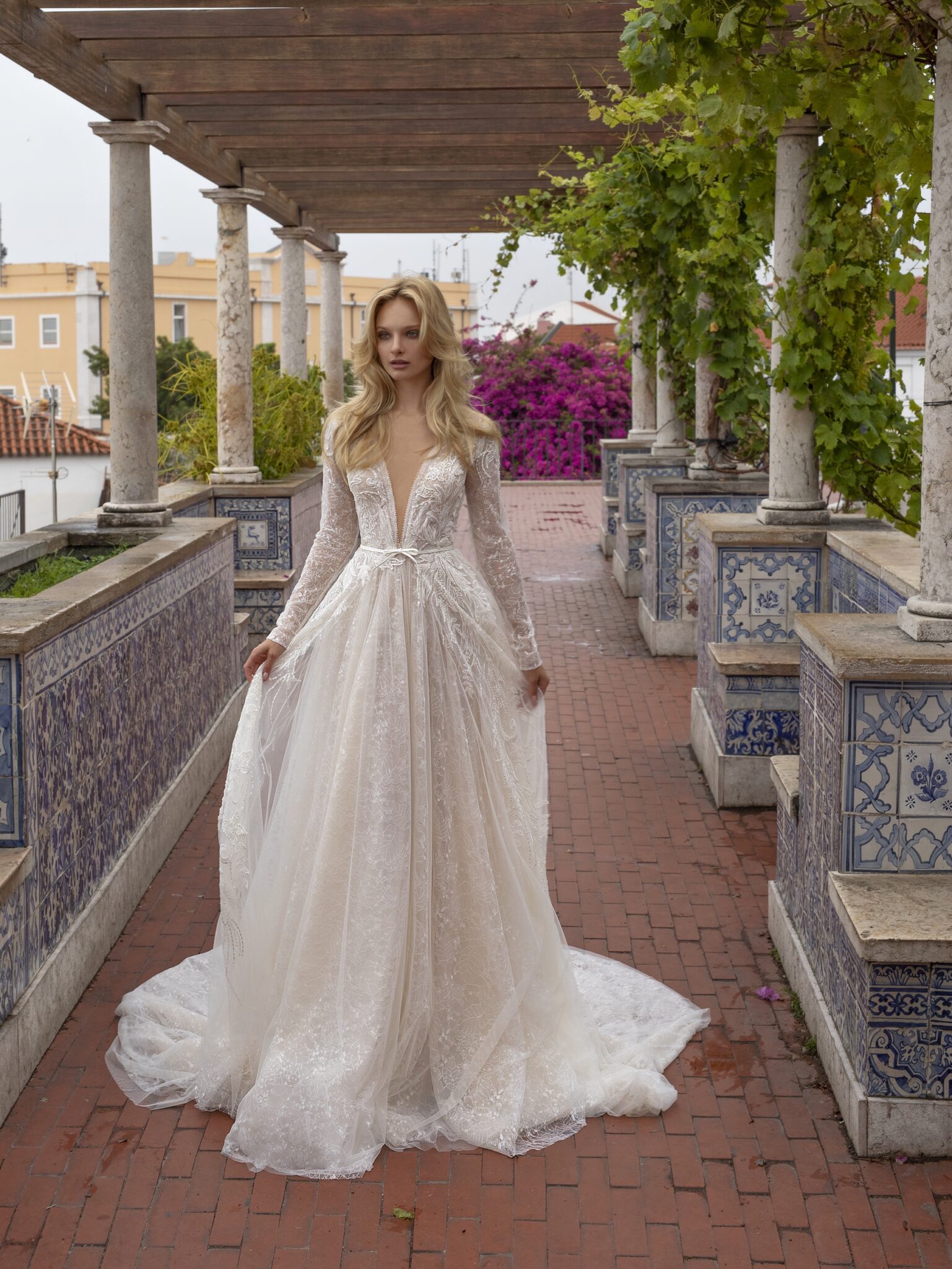 Lisbon VibesStylish Nelly bridal gown is an elegant and sophisticated dress. This A-line gown is made of lace with different patterns. Floral motives of corsage and skirt perfectly go together. Long sleeves and V-shaped low neck make it more feminine. A thin veiling layer and long tail finish the outfit.