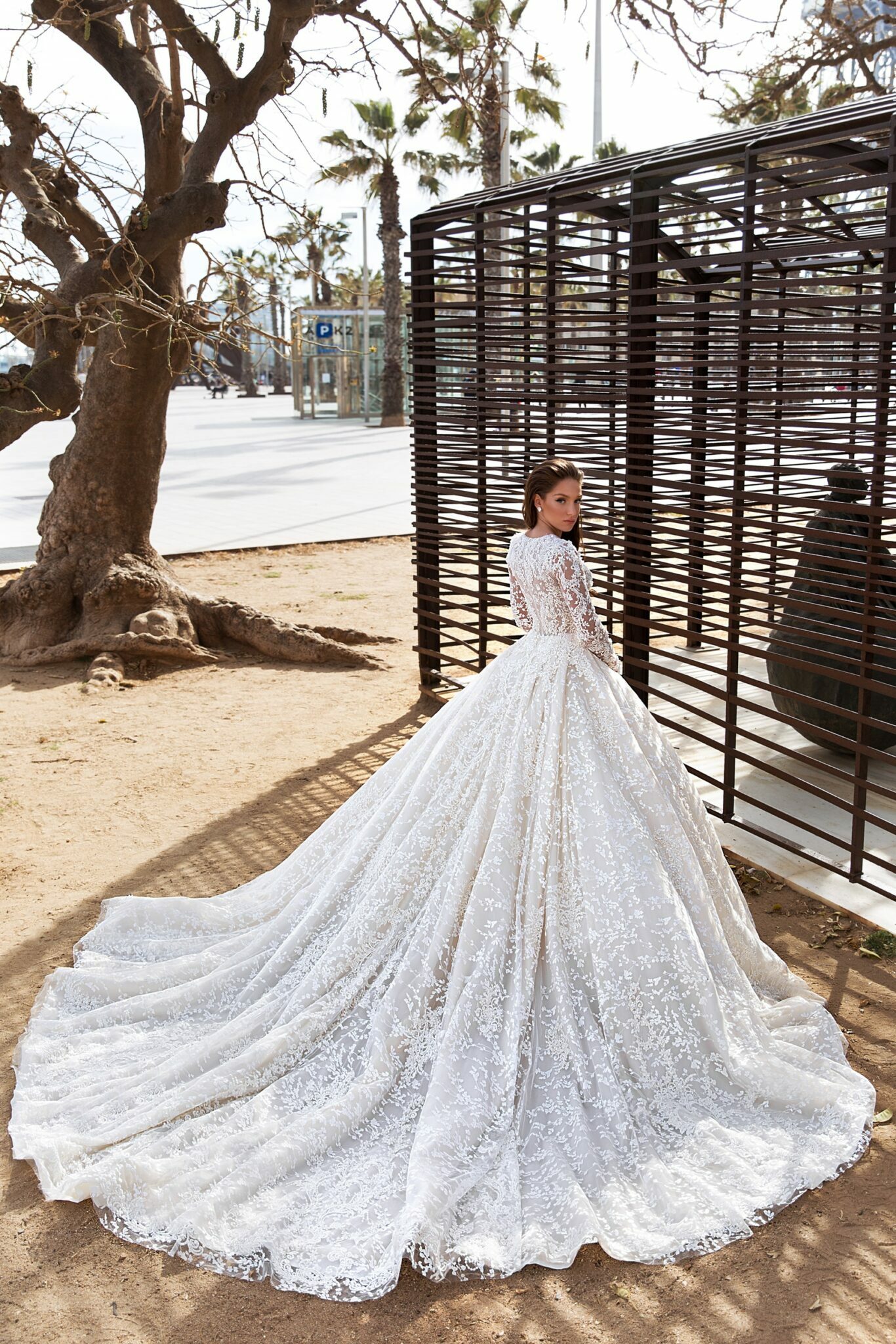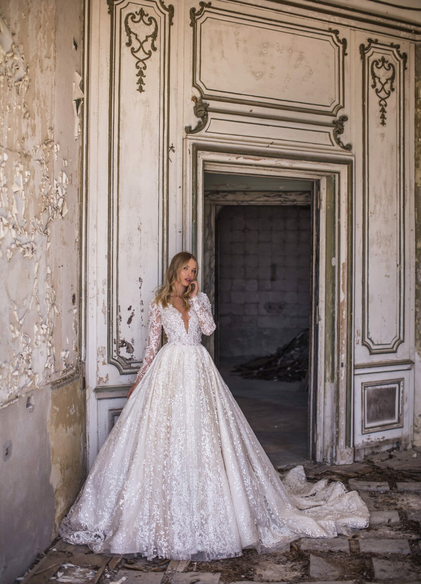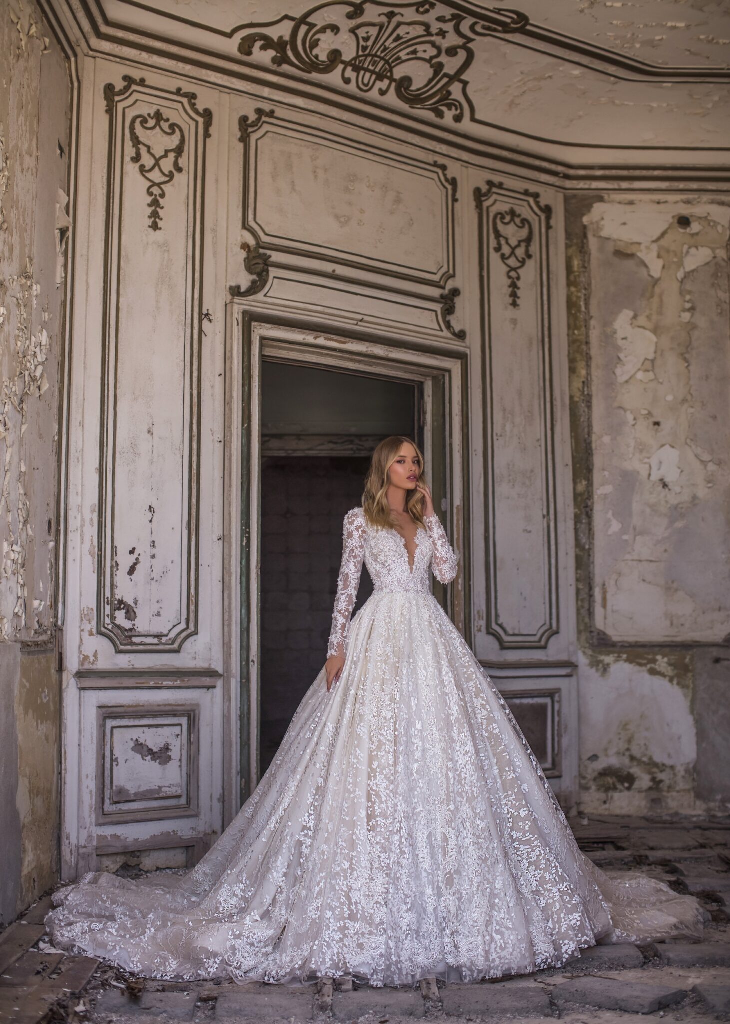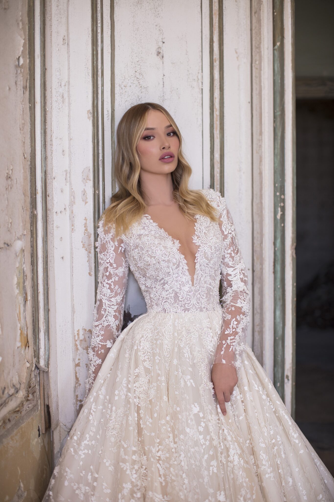AuroraNelson is a lace wedding dress with long sleeves and an extravagant low neck. This ball gown combines different lace patterns which make it eye-catching. An exuberant corsage is vastly decorated with lace patterns. A combination of lace and veiling looks splendid.