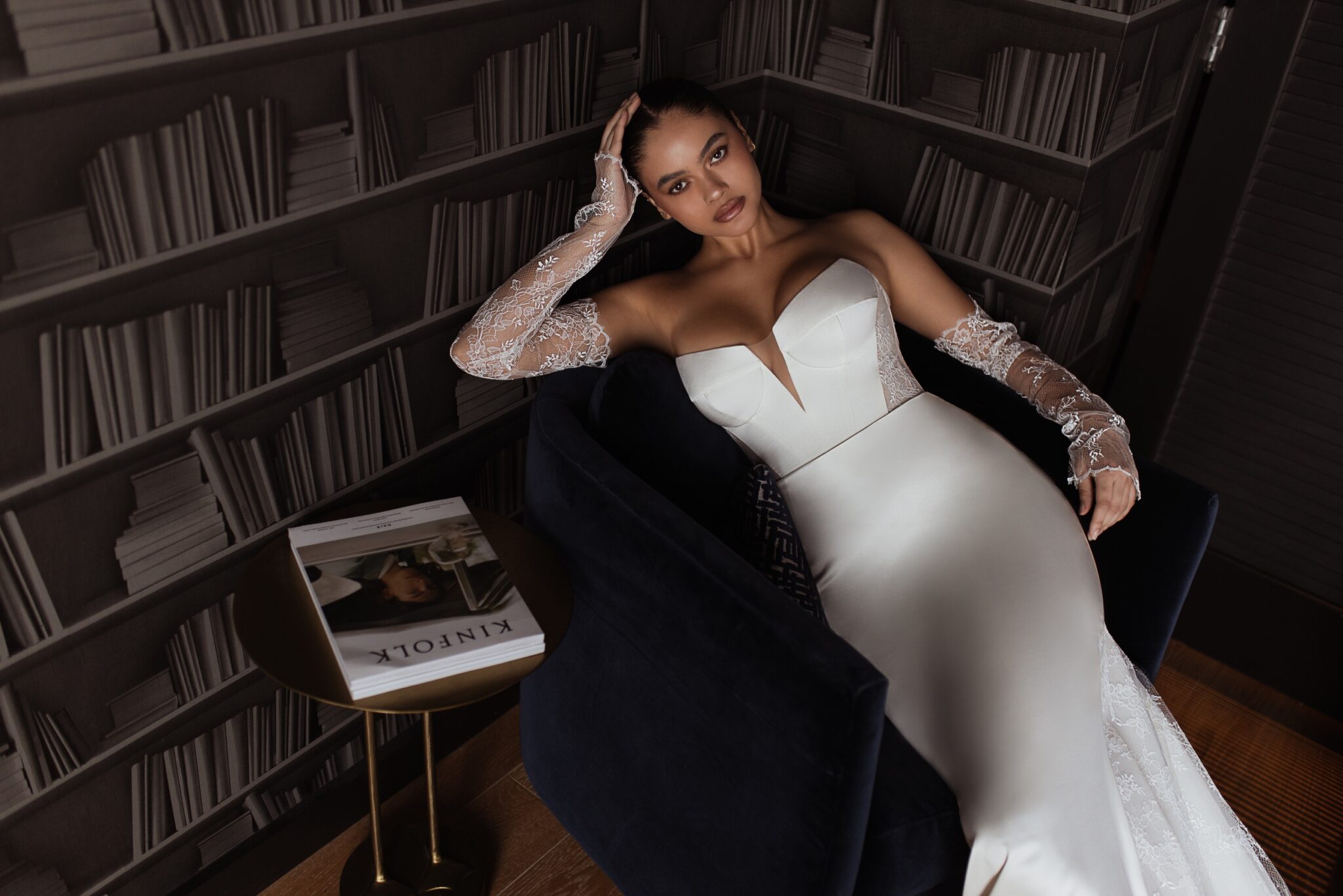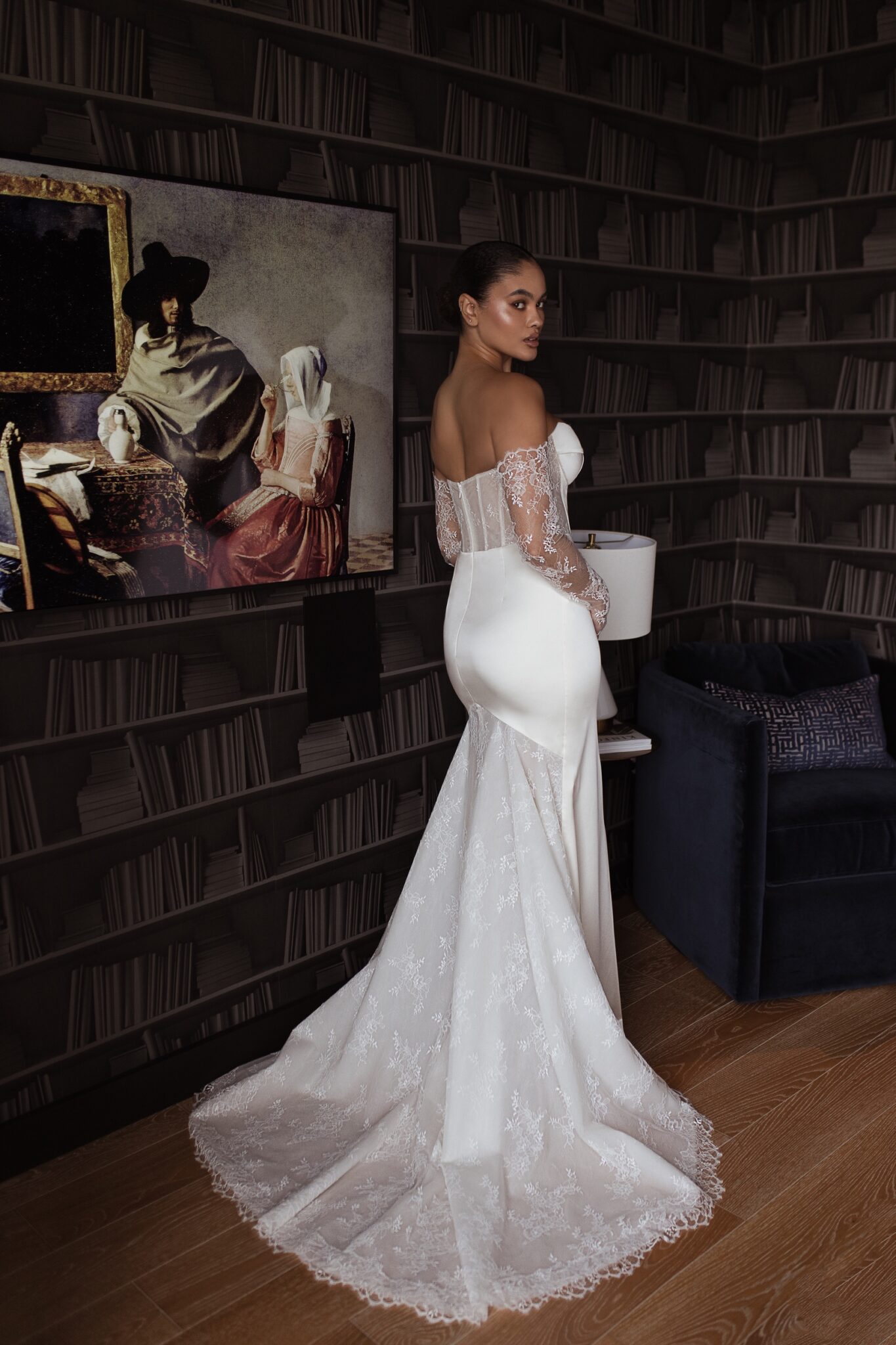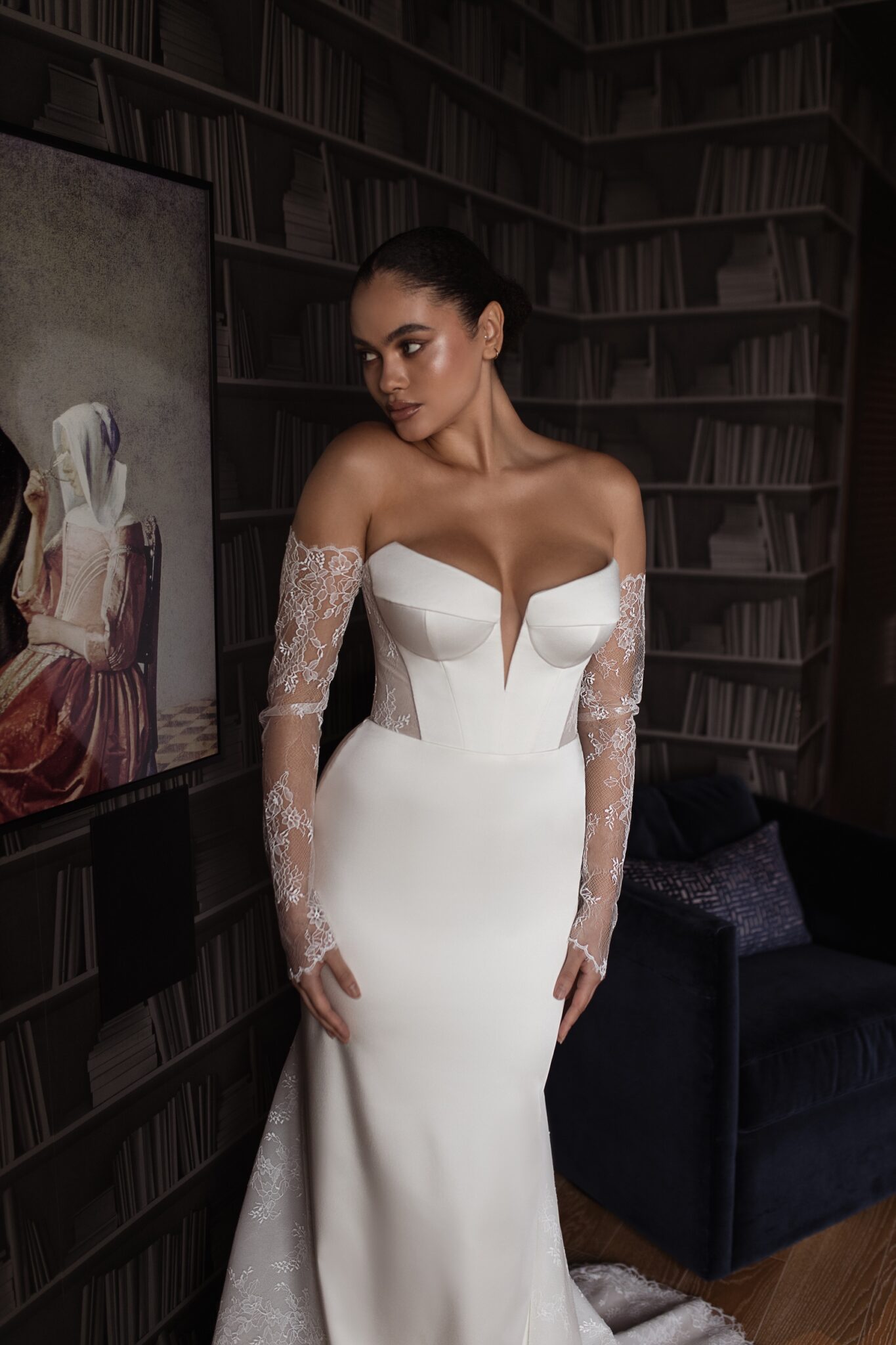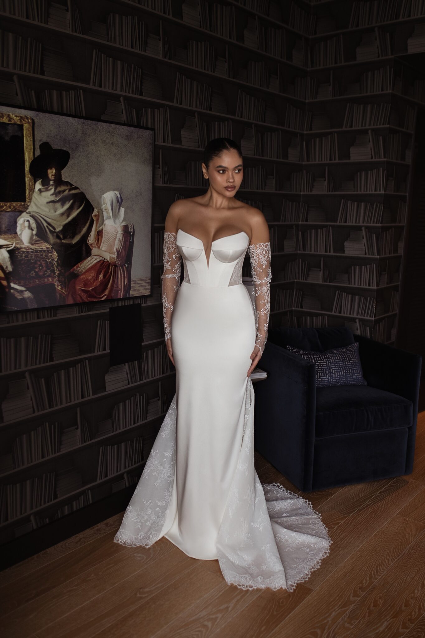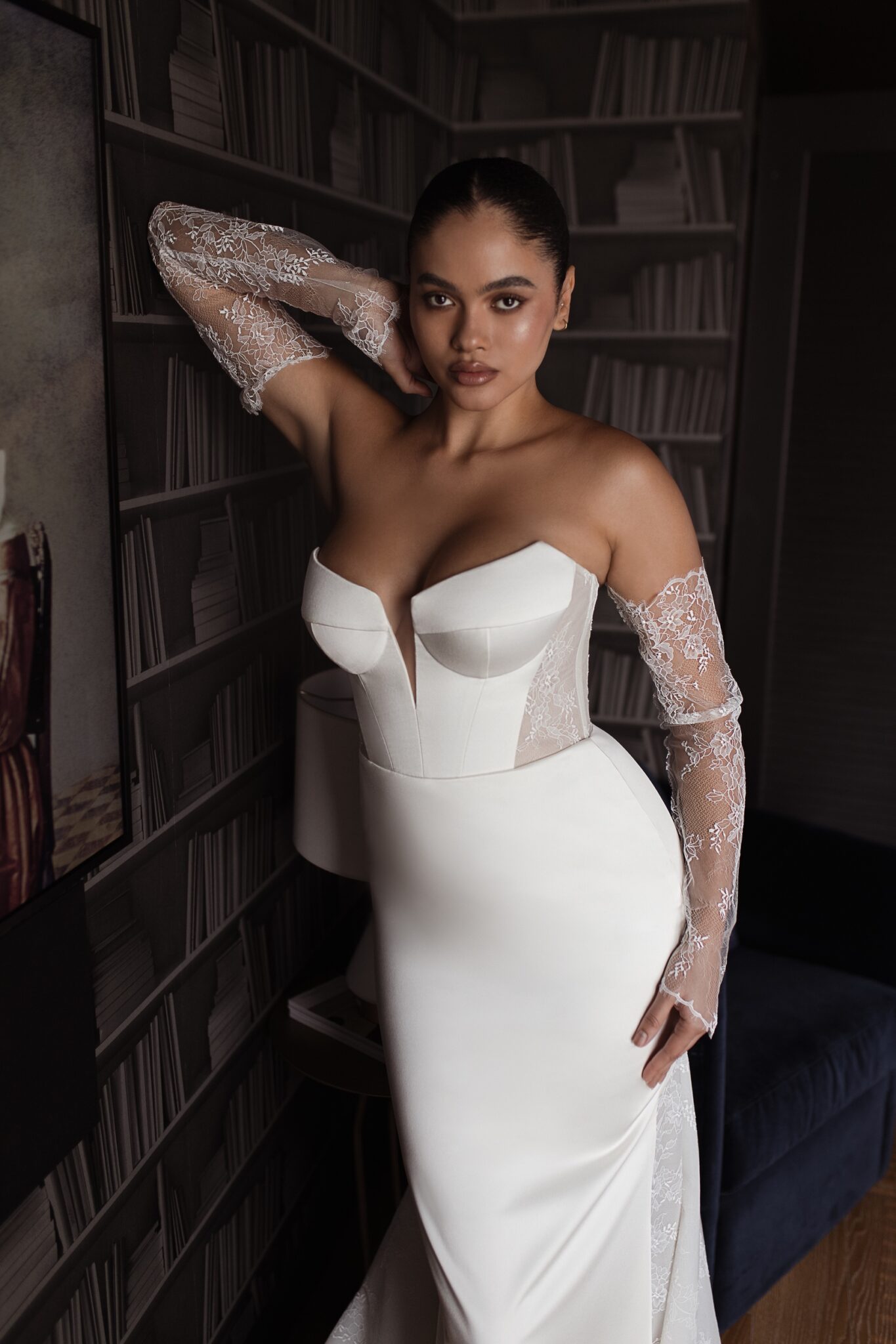 Urban Elegance‘Nicole’ is the perfect blend of sexy and elegant. This beautiful fit and flare silhouette is created with a stunning ivory satin. The back of the gown features a modern twist – touches of a soft Chantilly lace creating a sheer corset and delicate sheer train. The corset bodice and sheer back work together to create a striking waistline while the lace train contrasts the soft ivory satin seamlessly. ‘Nicole’ can be worn with her matching lace sleeves to incorporate the lace detail in the front of the gown, or by itself, keeping the gown as the focal point. This dress is ideal for a bride looking for the perfect balance of soft lace and structured satin.