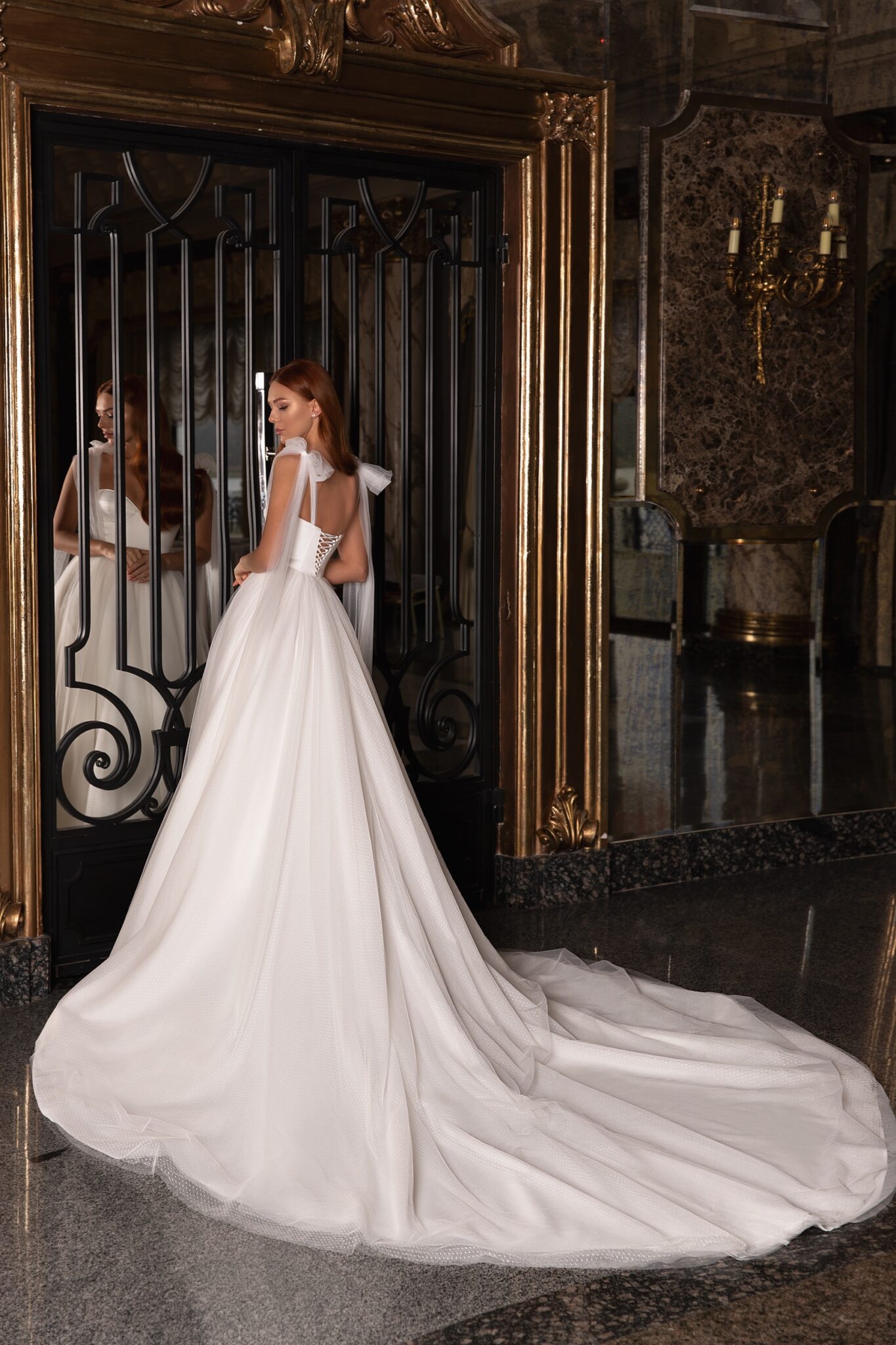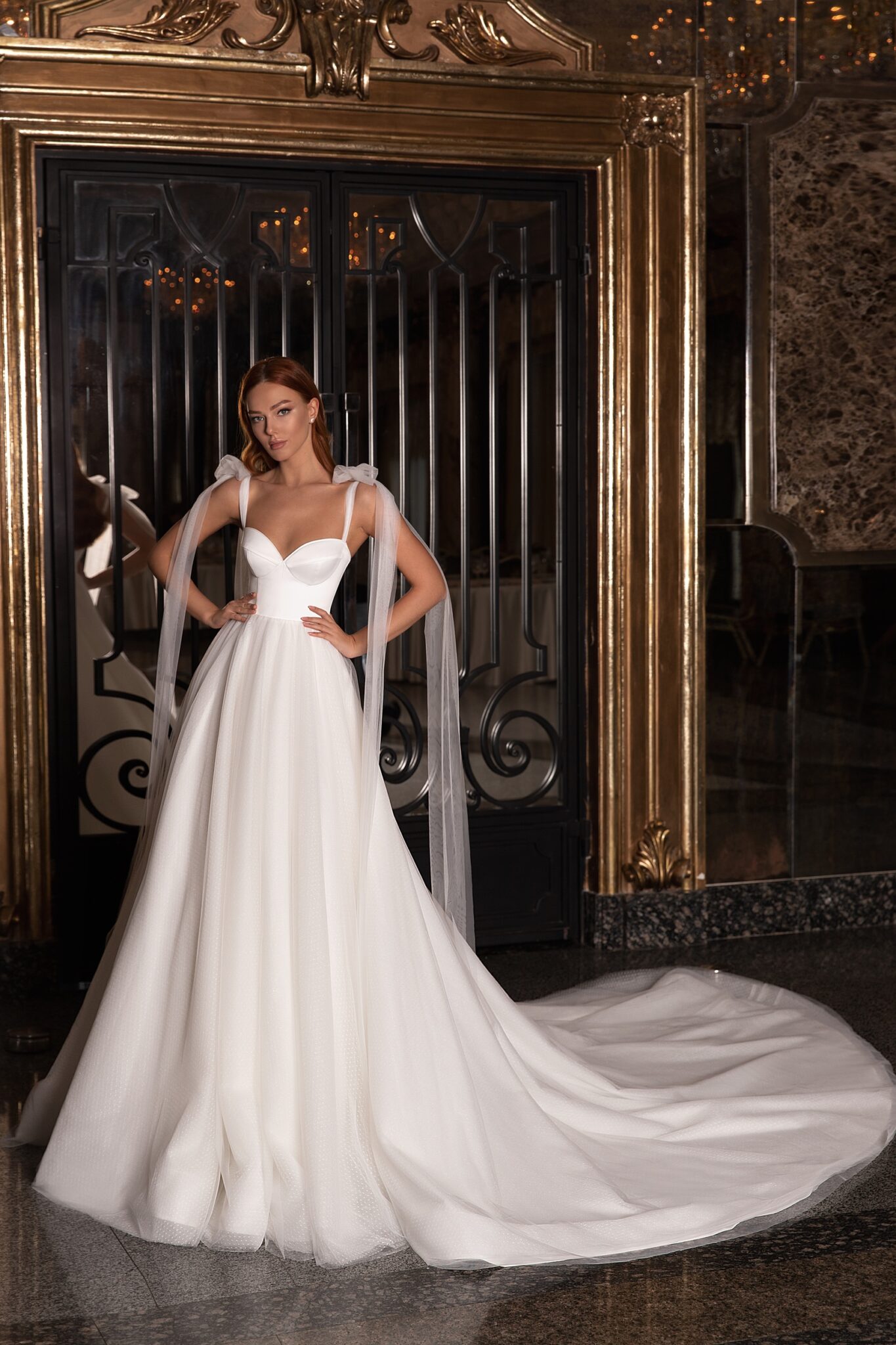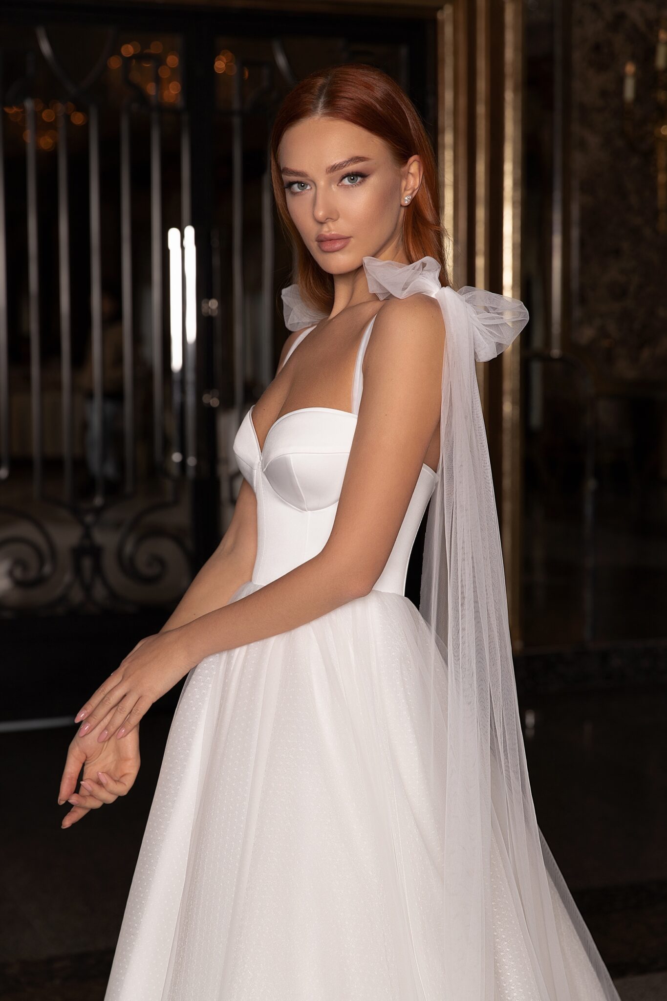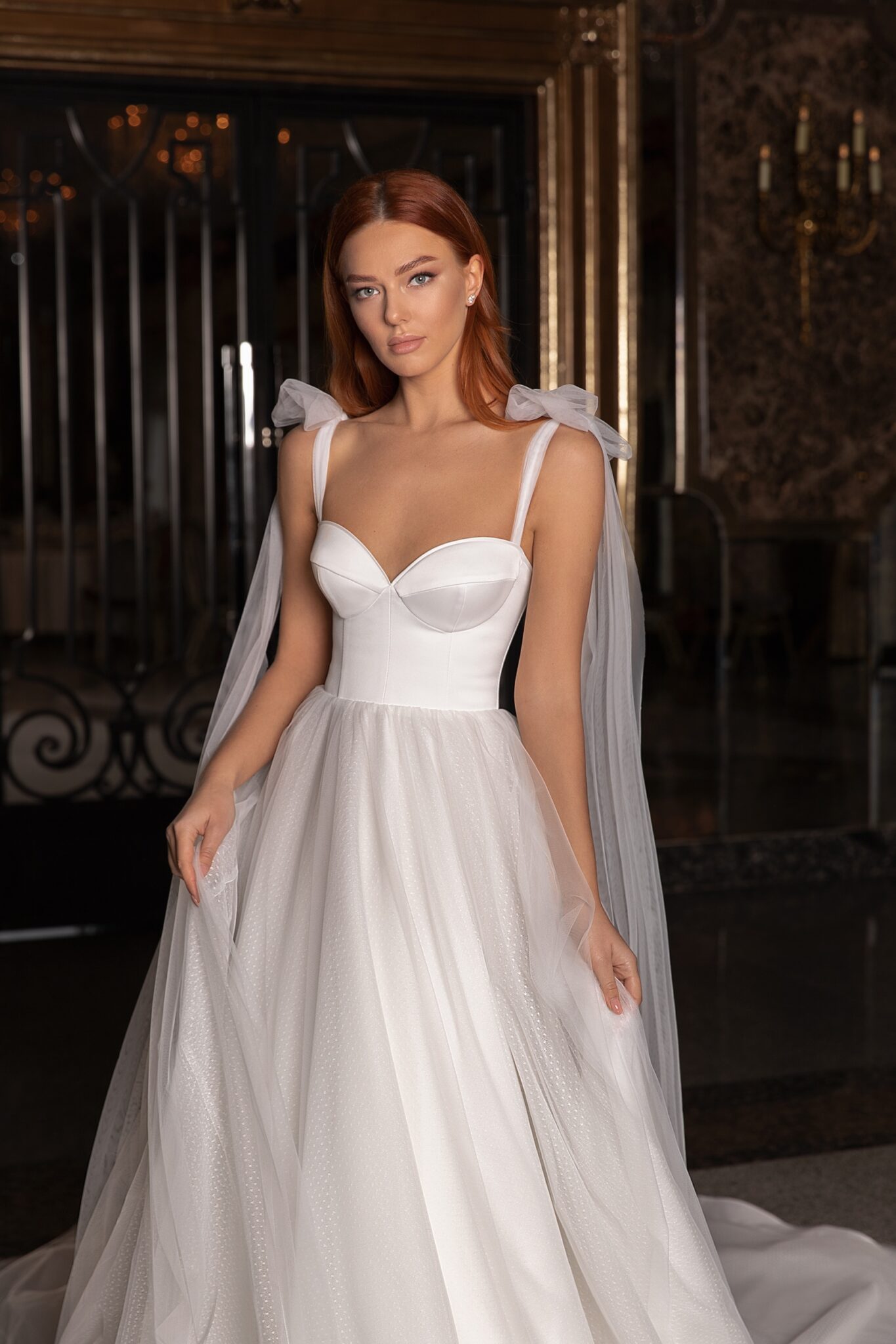 EdemA superb wedding gown with tender bows on shoulders. This wedding dress is made of satin and veiling. A corsage with a sweetheart neckline is embellished with lacing at the back of the dress. Small bows with long ribbons that are made of veiling draw attention. The luxurious skirt is made of several layers of veiling with small dots. It passes into a long train.