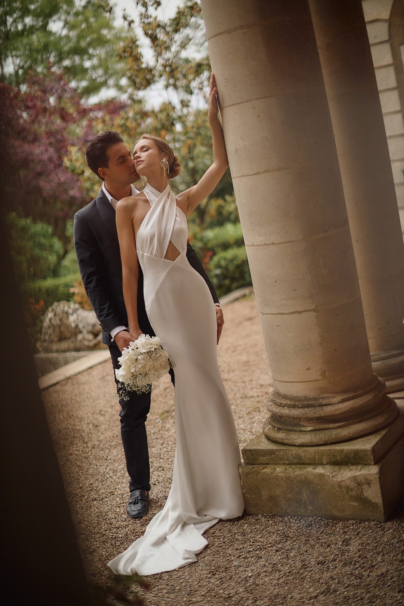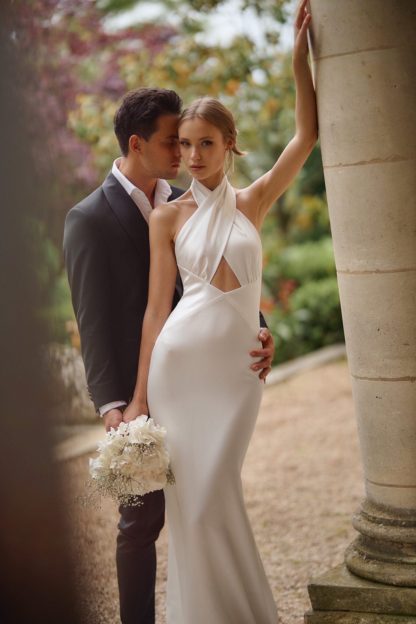 Love StoryHalter-neck glossy dress with a simple yet captivating cut-out top and open back. The train descends smoothly to the bottom, creating an elegant silhouette.