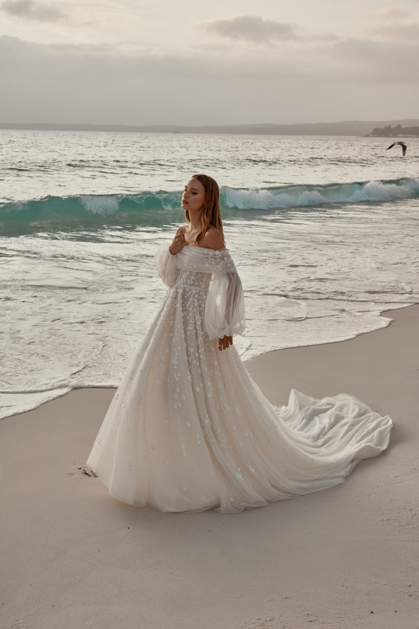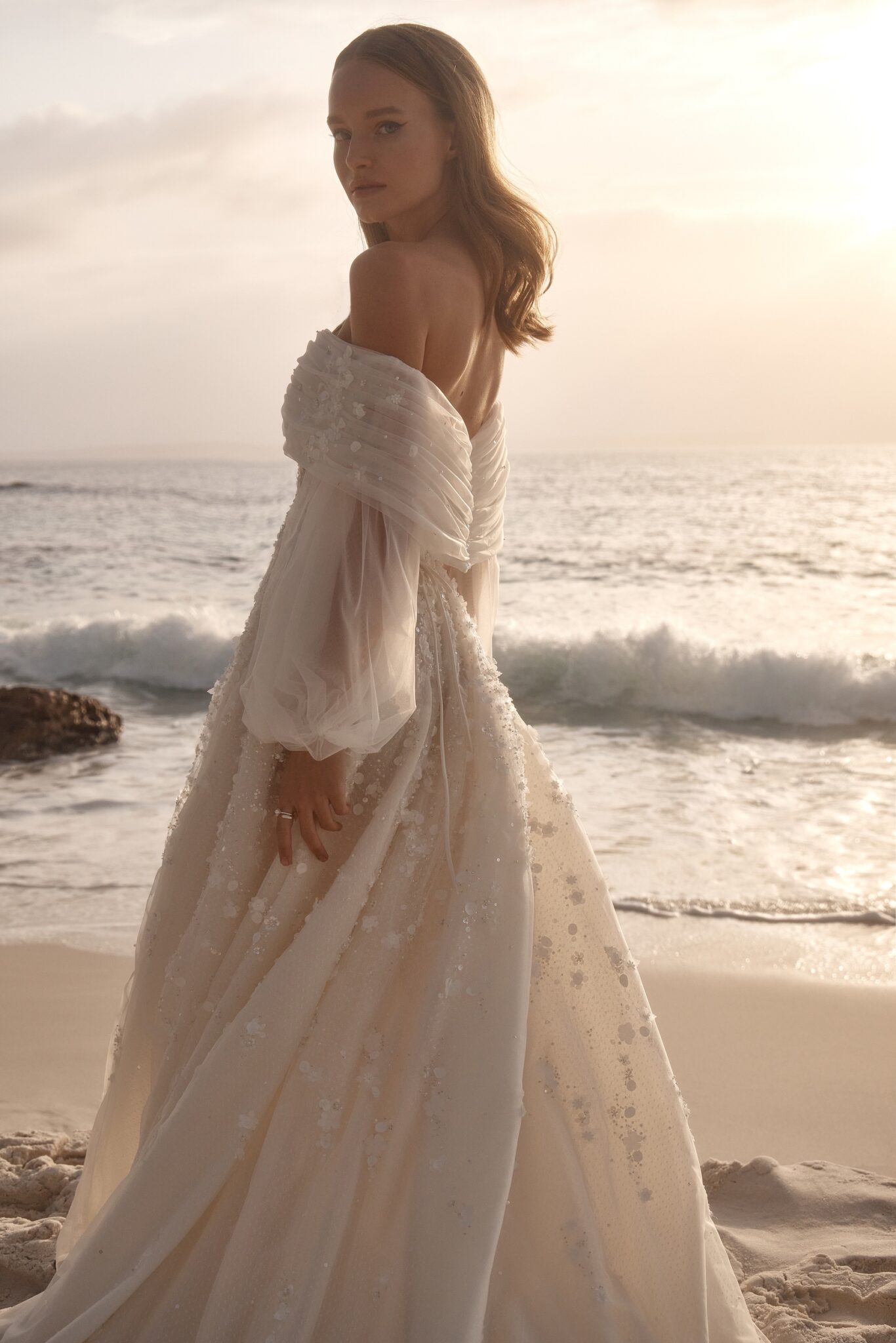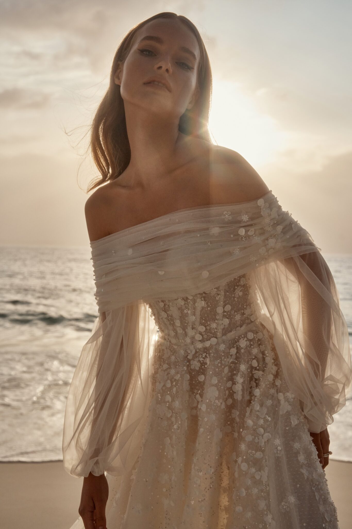 Atelier signature editionThis A-line lace wedding dress is a vision of enchantment, featuring a corset adorned with exquisite 3D floral details that cascade to the top of the skirt. The sweetheart neckline adds a touch of timeless allure, while the detachable tulle bolero and voluminous sleeves provide a perfect blend of romance and versatility, making it a dream ensemble for the bride seeking a truly unique look.