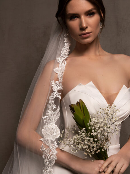 VeilsRomantic single-tier drop veil made of weightless tulle decorated with delicate embroidered lace. Can be worn as a mantilla veil. Available in chapel and cathedral lengths. Folded back, the veil will create two layers.