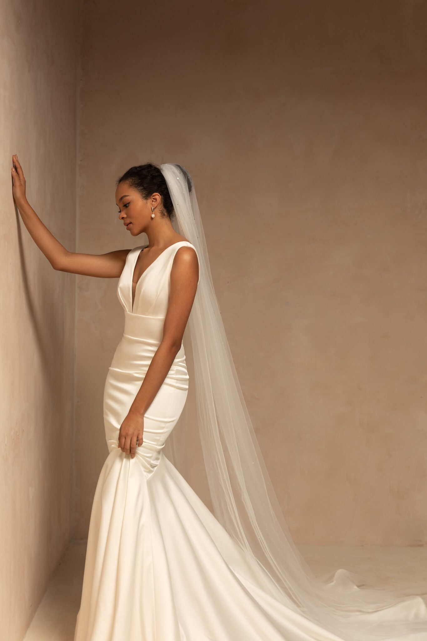 VeilsRomantic single-tier drop veil made of tulle and decorated with sparkling lace appliques. Available in cathedral length. Folded back, the veil will create two layers.