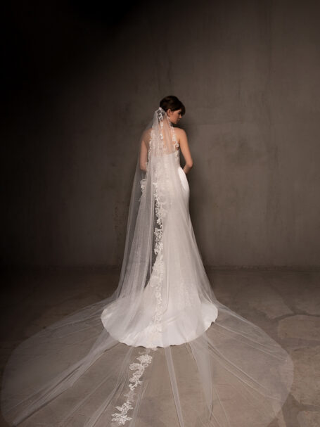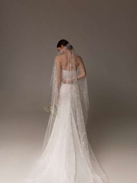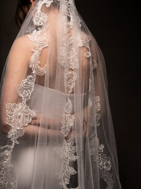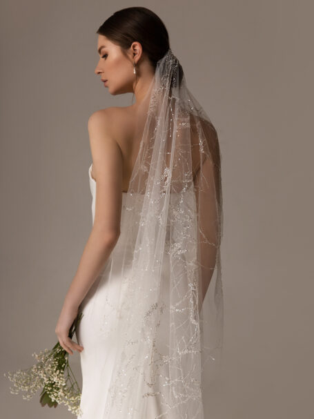 VeilsBeautiful sparkling single-tier veil made of glitter tulle and decorated with small 3D floral appliques and artificial pearls. Available in cathedral length.