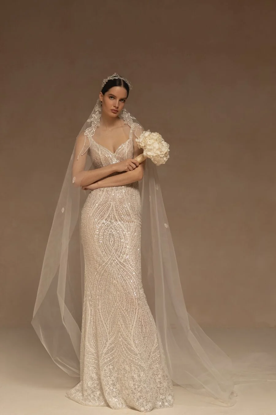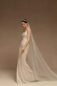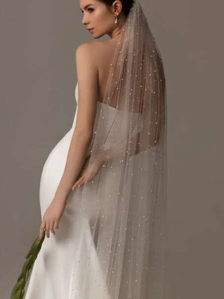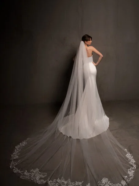 VeilsFantastic sparkling single-tier bridal veil made of tulle embellished with emroidered patterned lace appliques. Available in cathedral length.