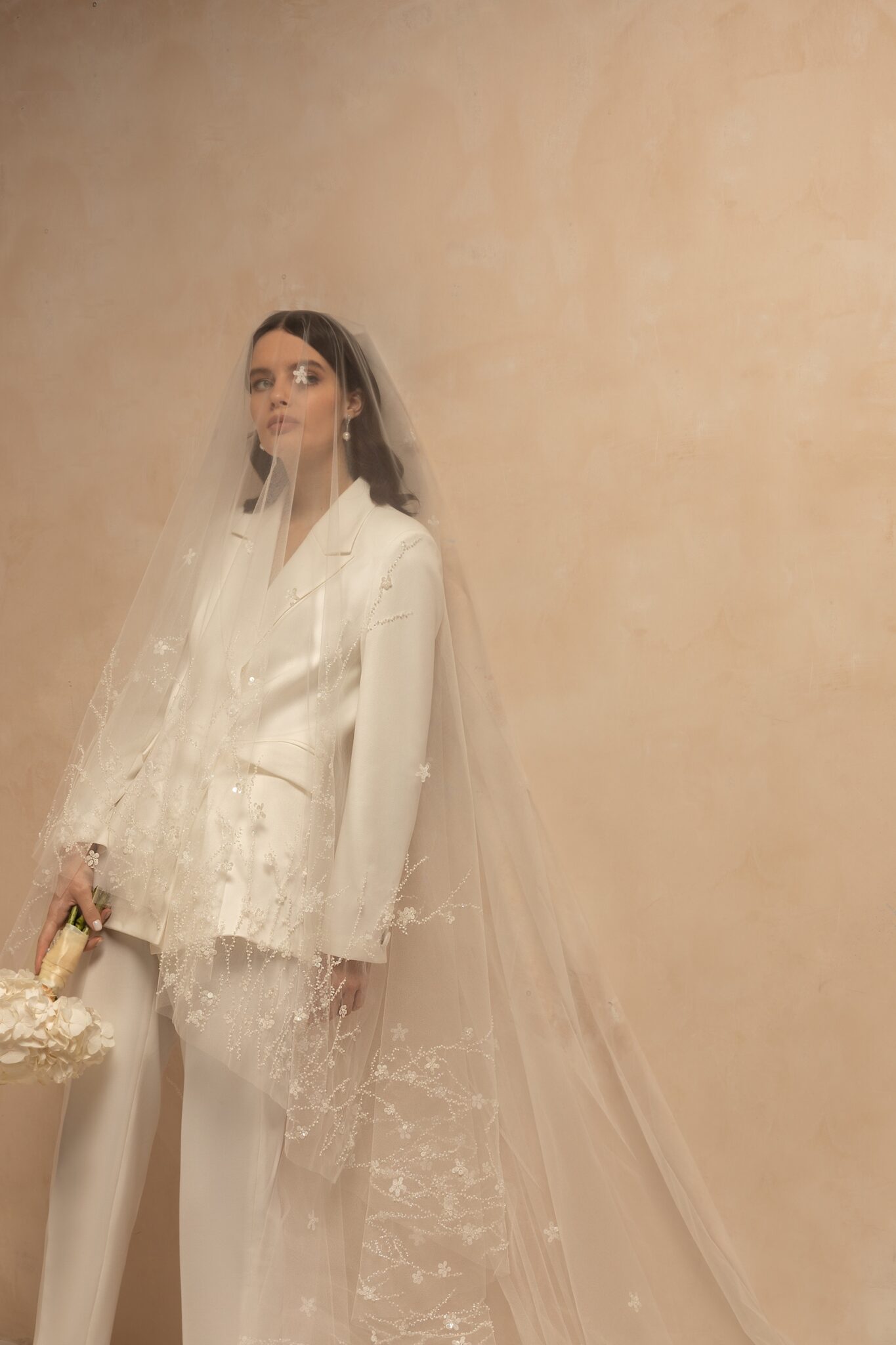 VeilsRomantic single-tier drop veil made of weightless tulle decorated with sequined embroidered floral lace. Available in cathedral length. Folded back, the veil will create two layers.